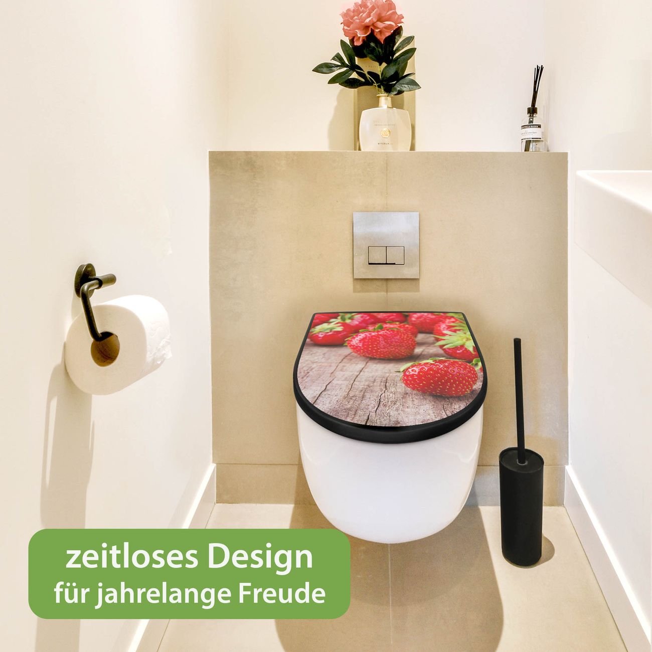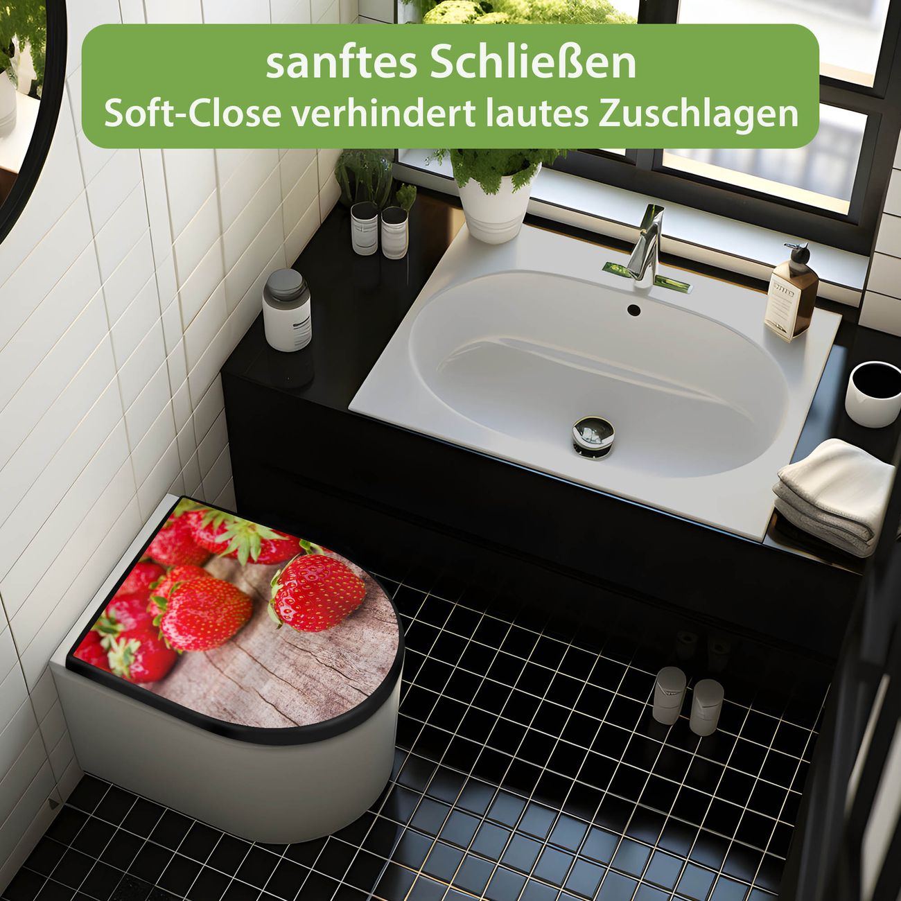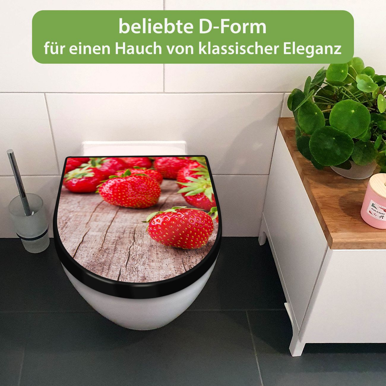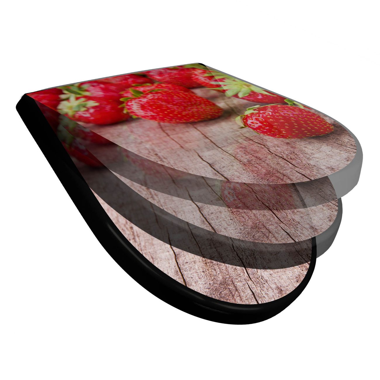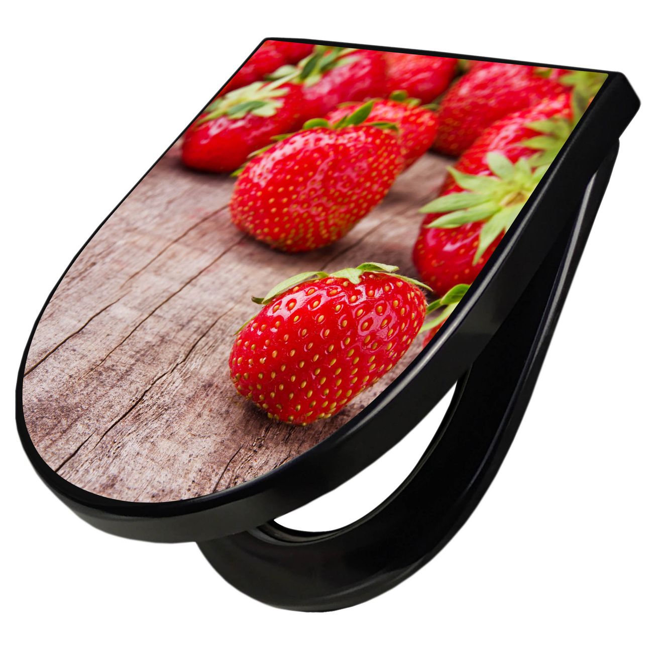 WC Sitz D-Form Schwarz mit Absenkautomatik Motiv Erdbeeren