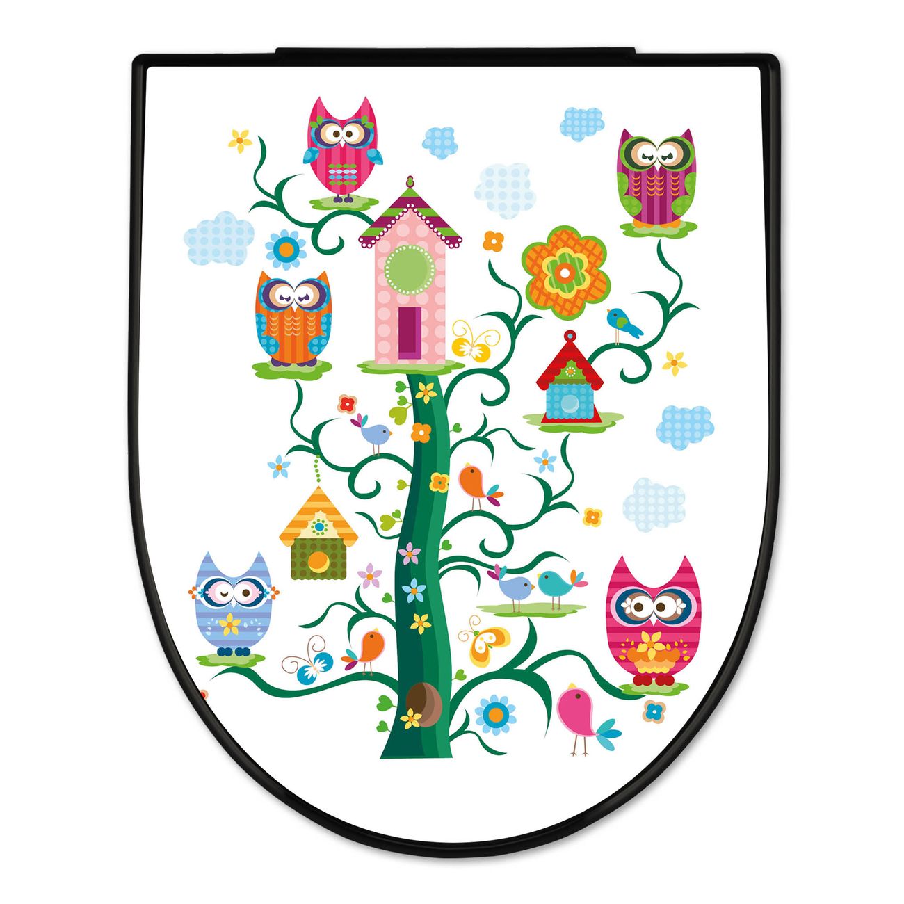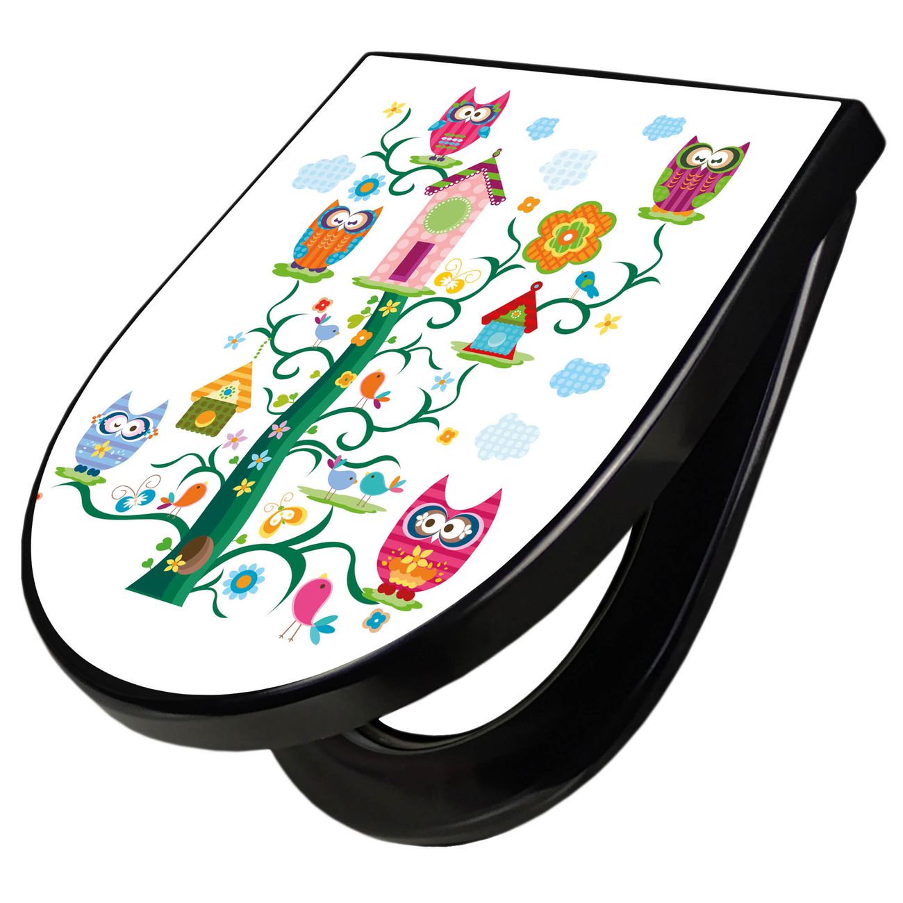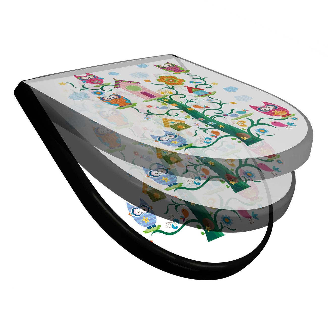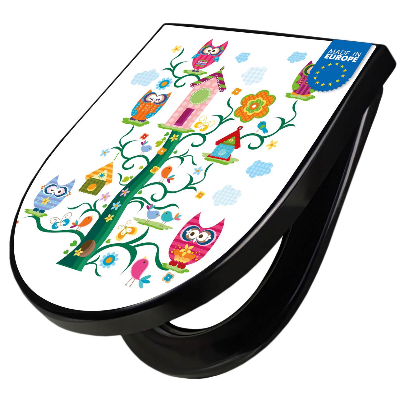 WC Sitz D-Form Schwarz mit Absenkautomatik Motiv Eulenfamilie