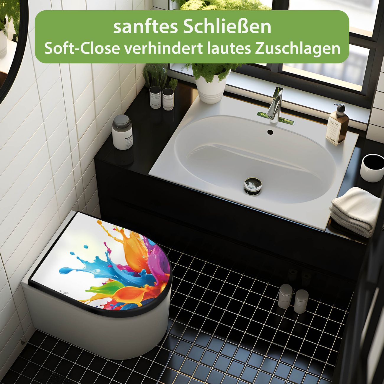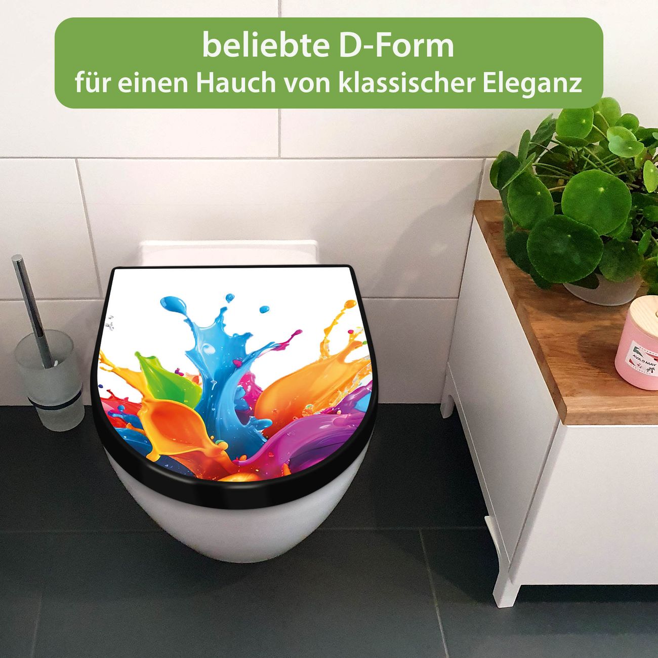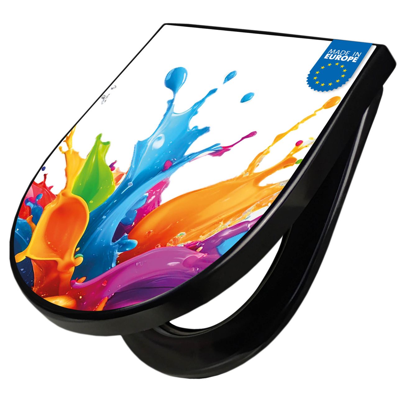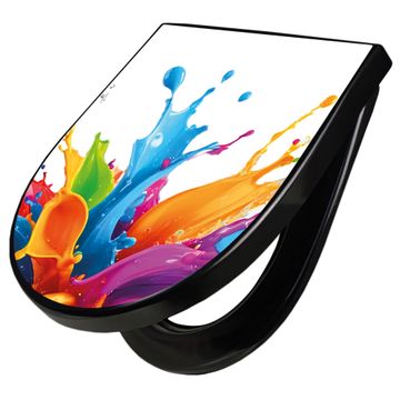 WC Sitz D-Form Schwarz mit Absenkautomatik Motiv Farbspritzer-Explosion