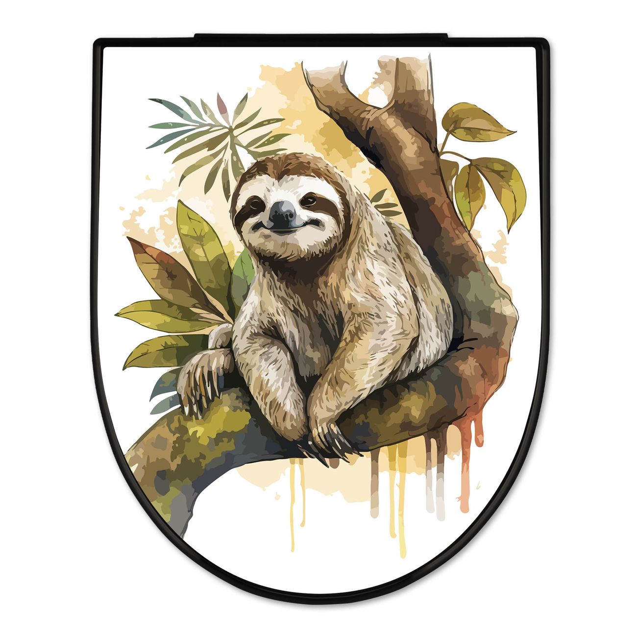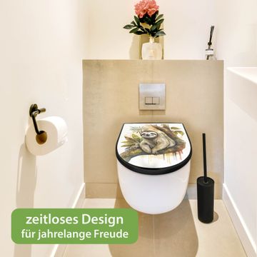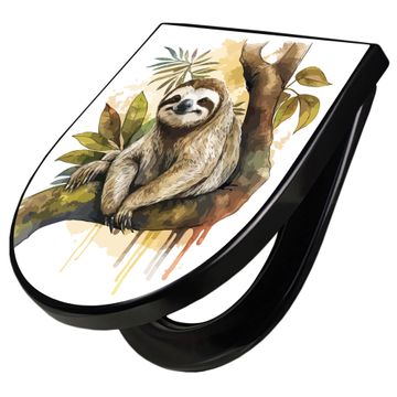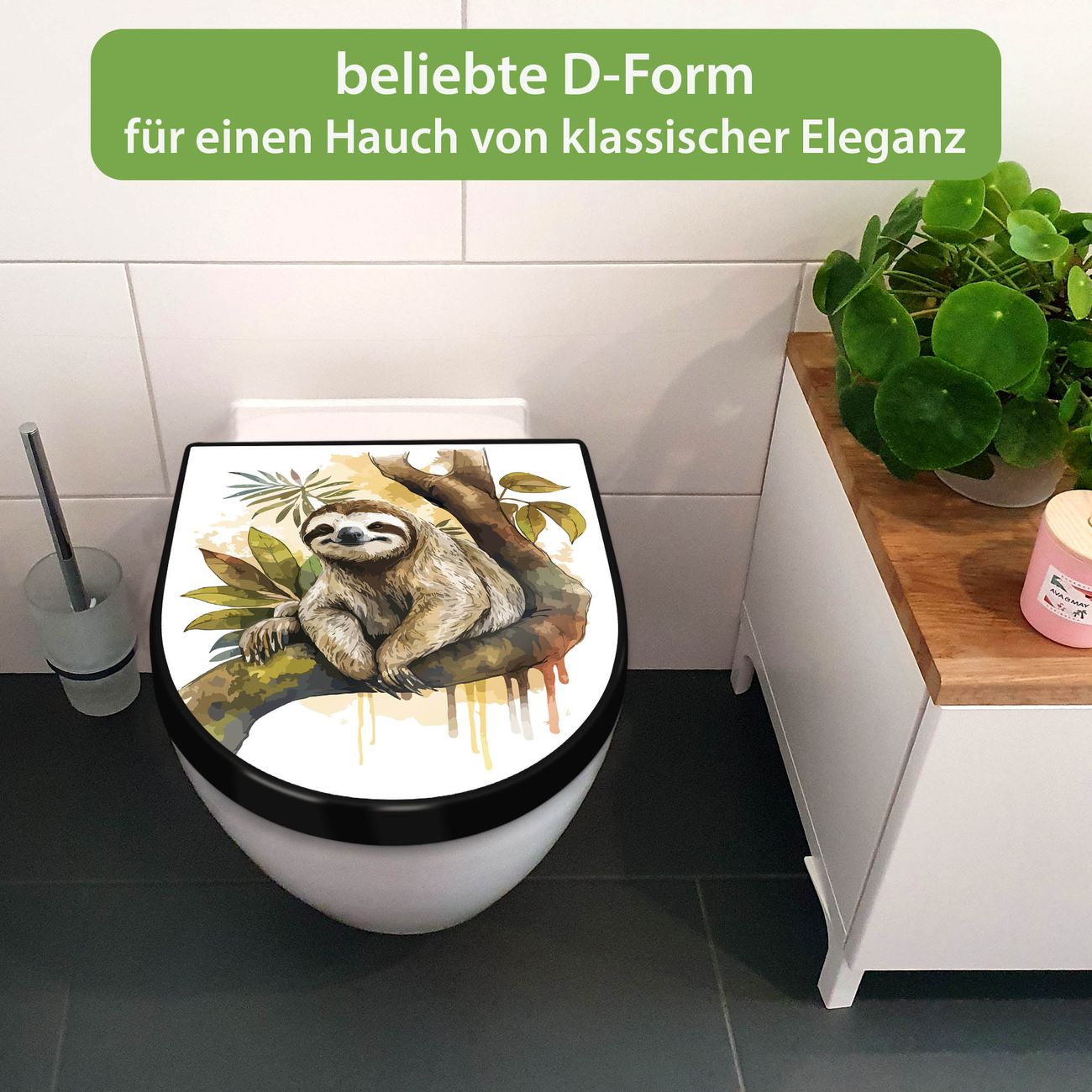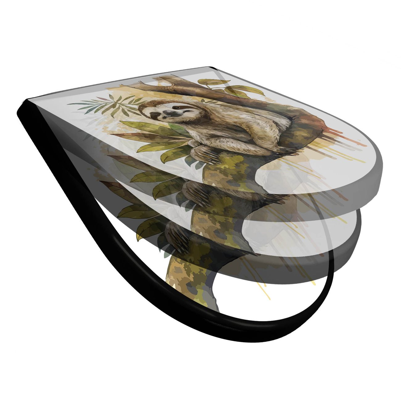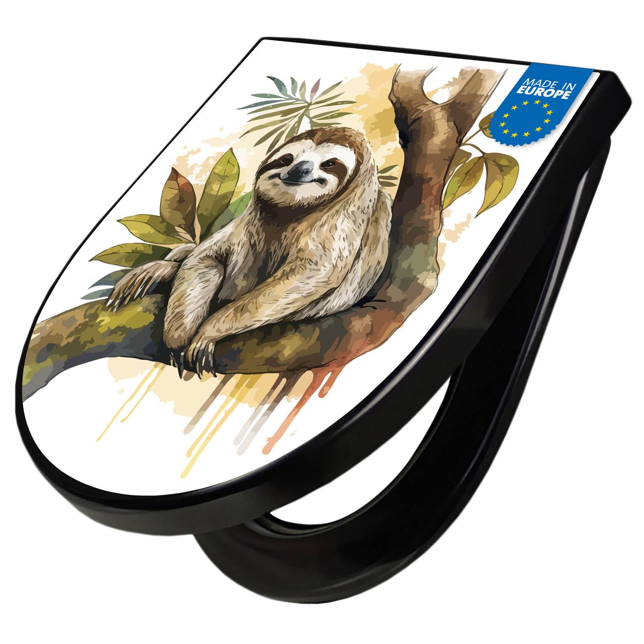 WC Sitz D-Form Schwarz mit Absenkautomatik Motiv Faultier mit Blütenmähne