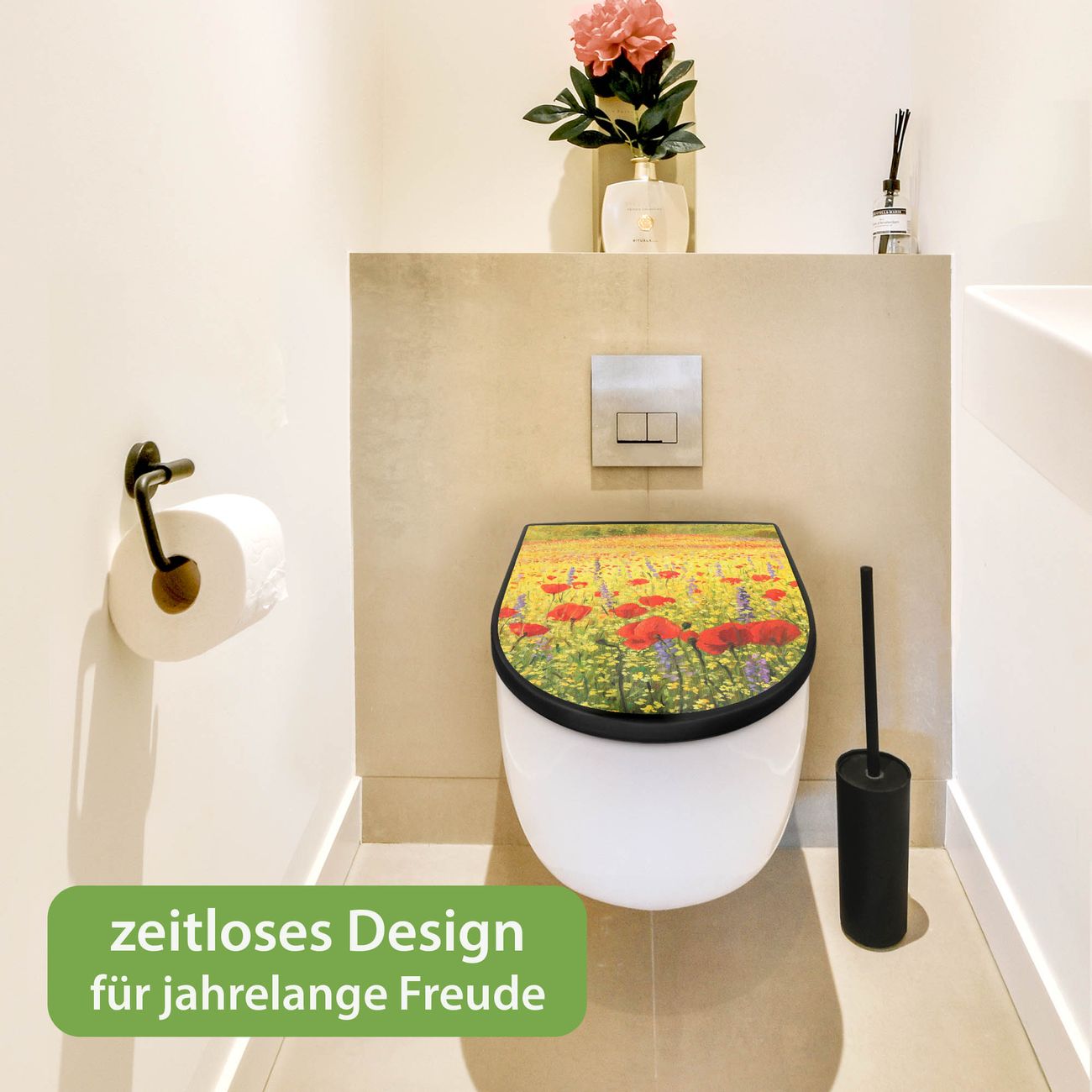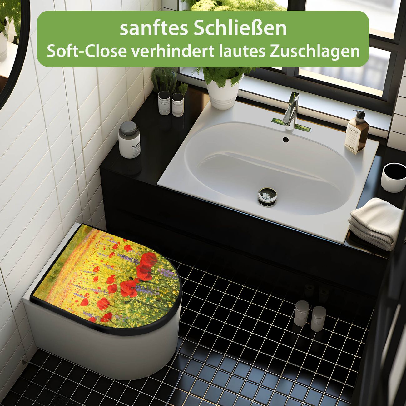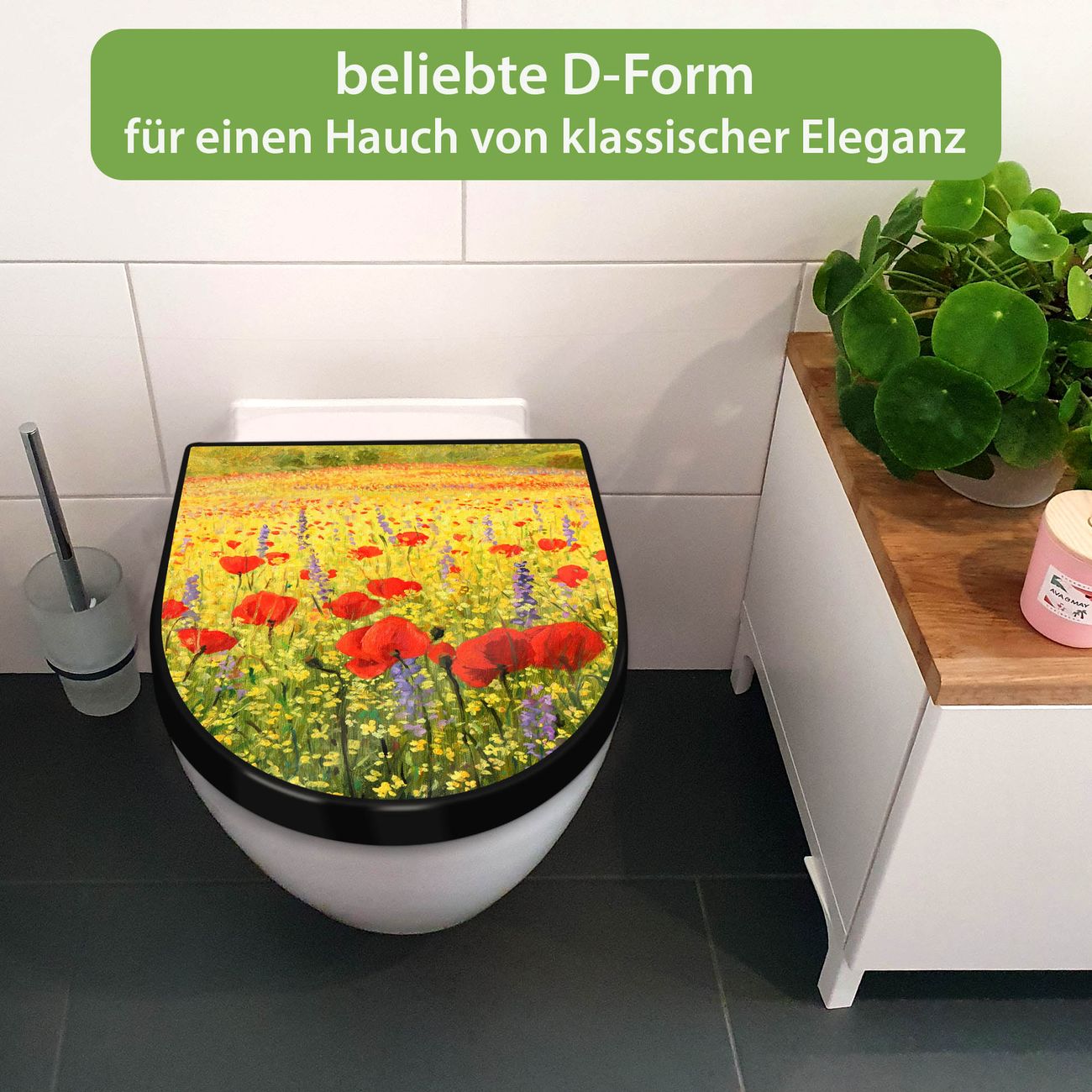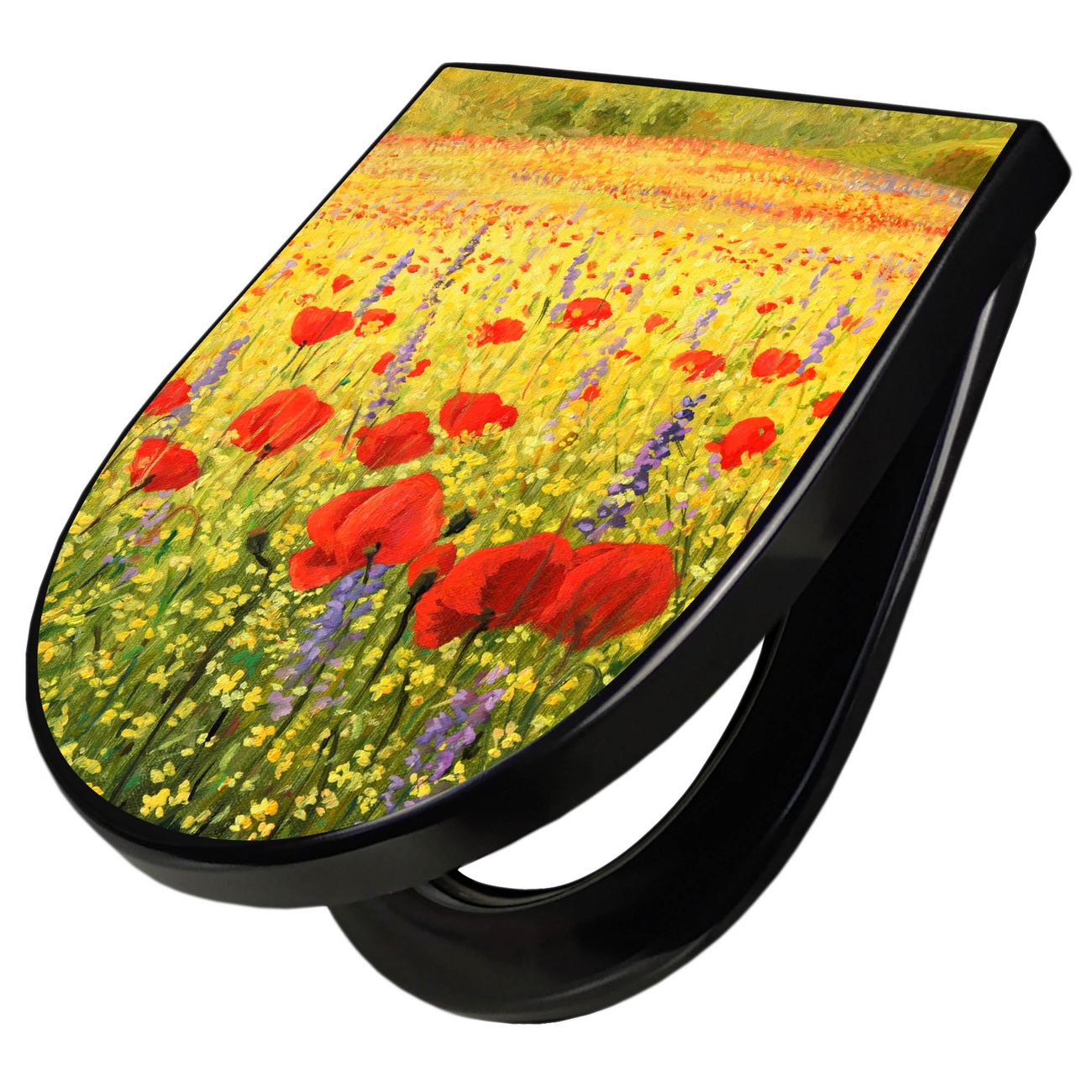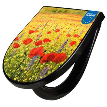 WC Sitz D-Form Schwarz mit Absenkautomatik Motiv Feld Mit Mohnblumen
