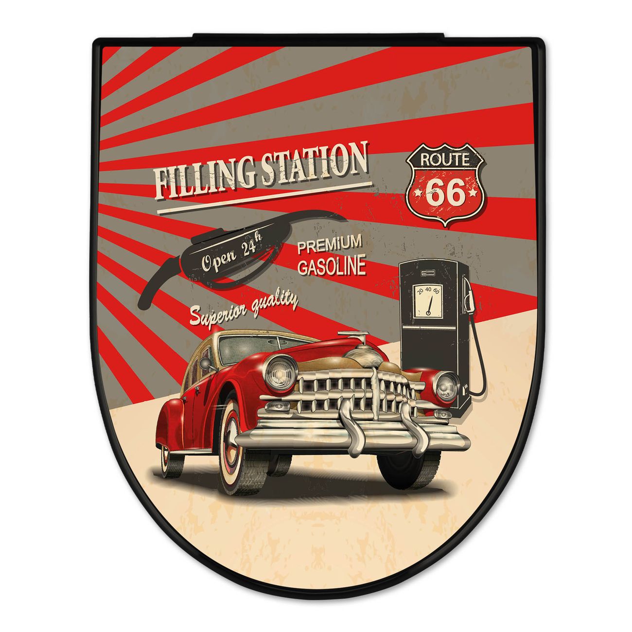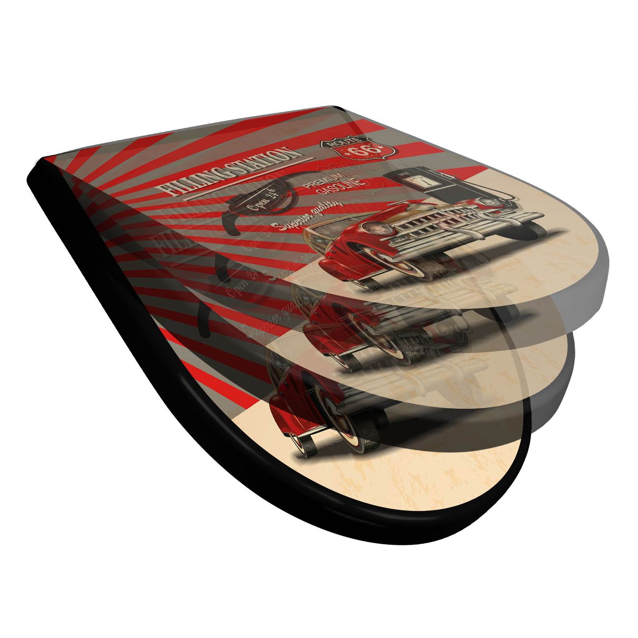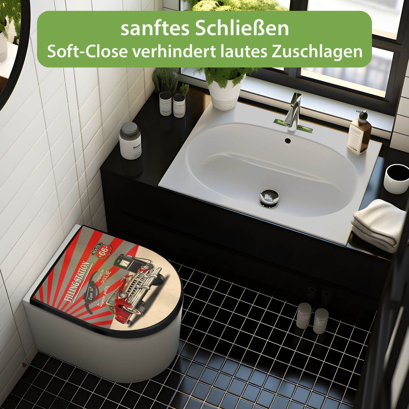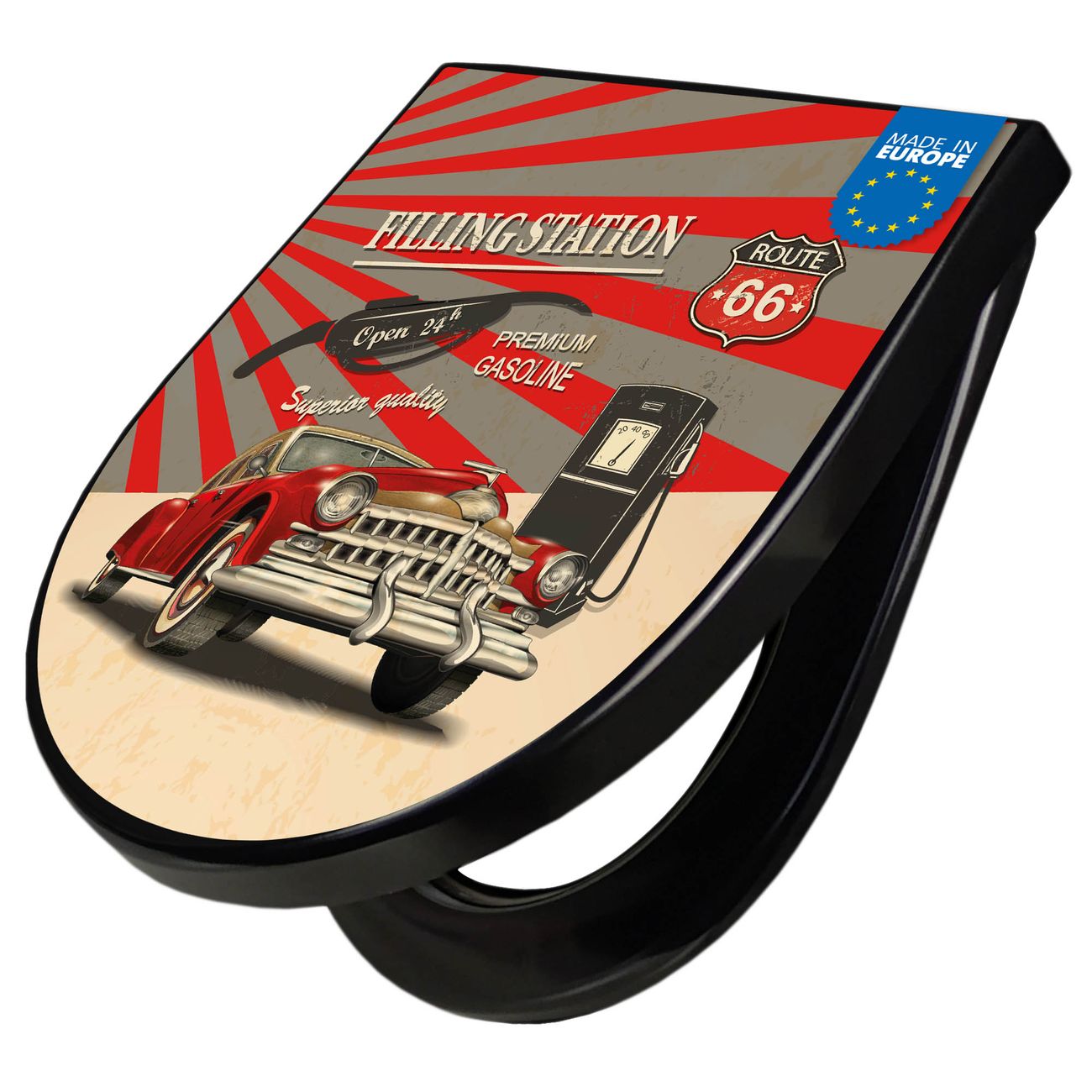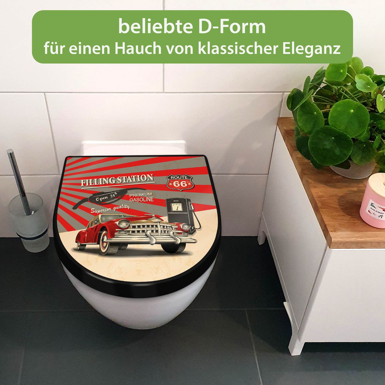 WC Sitz D-Form Schwarz mit Absenkautomatik Motiv Filling Station