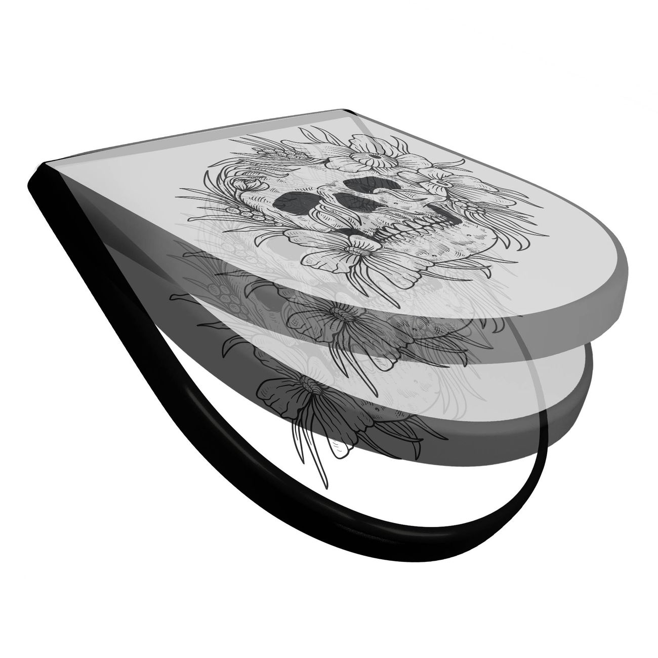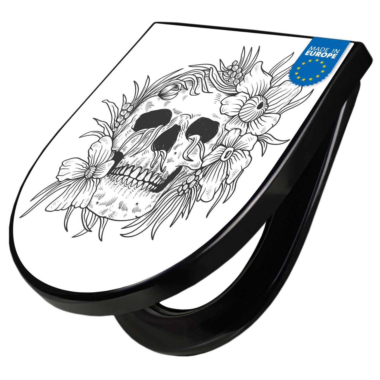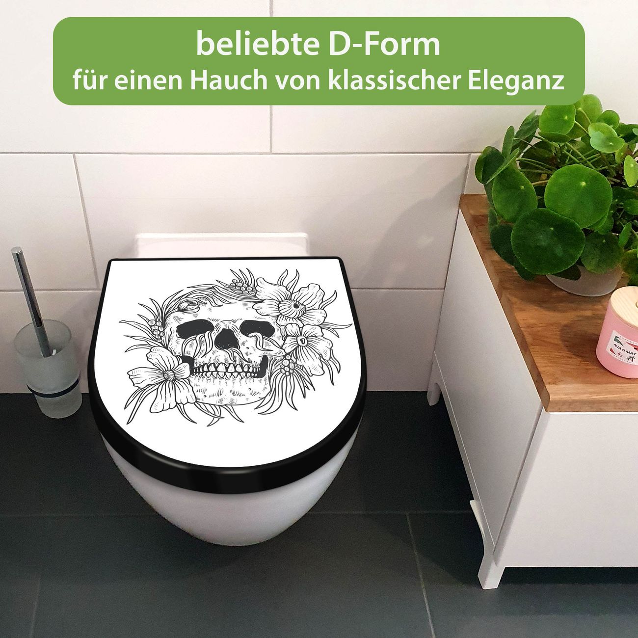 WC Sitz D-Form Schwarz mit Absenkautomatik Motiv Floral Skull 2