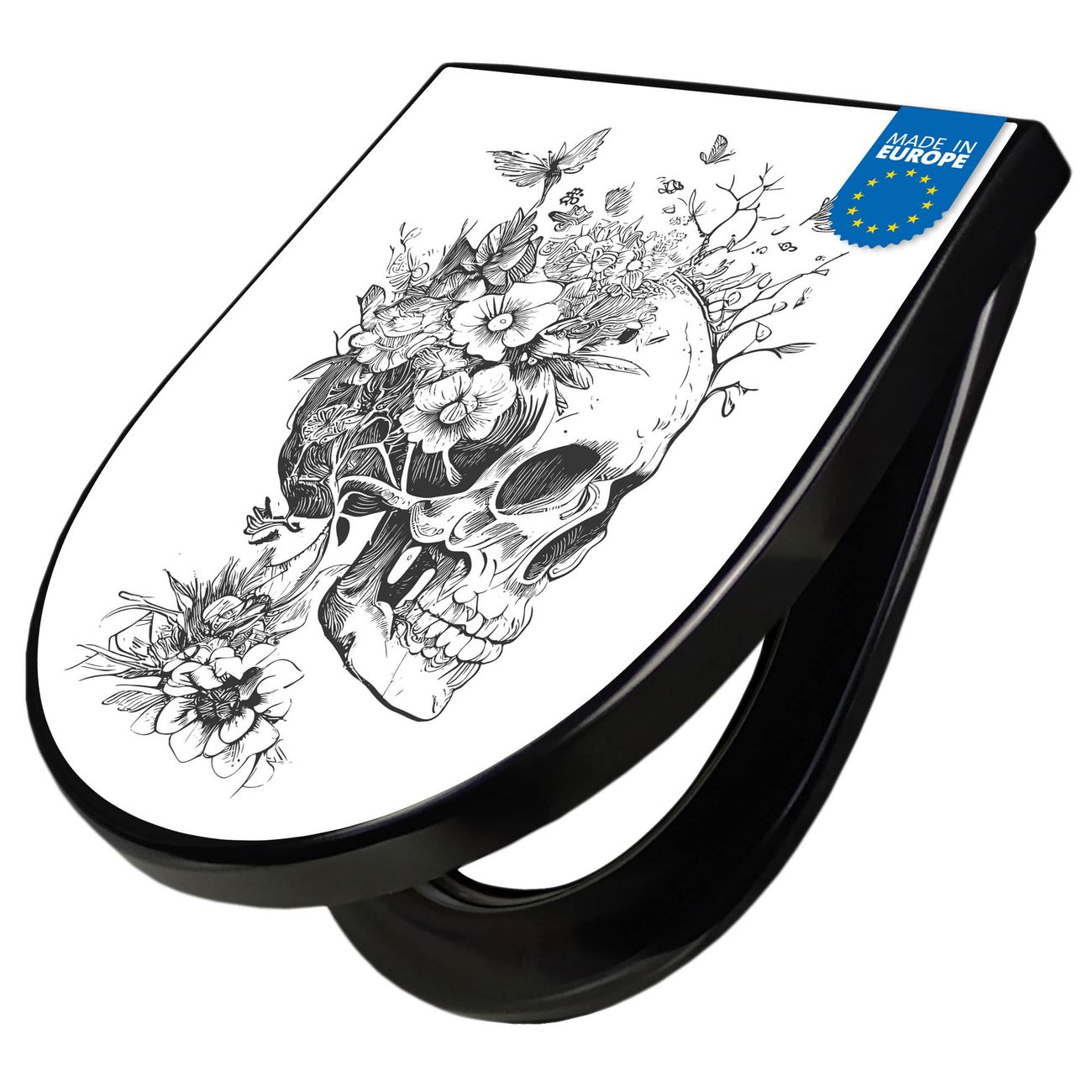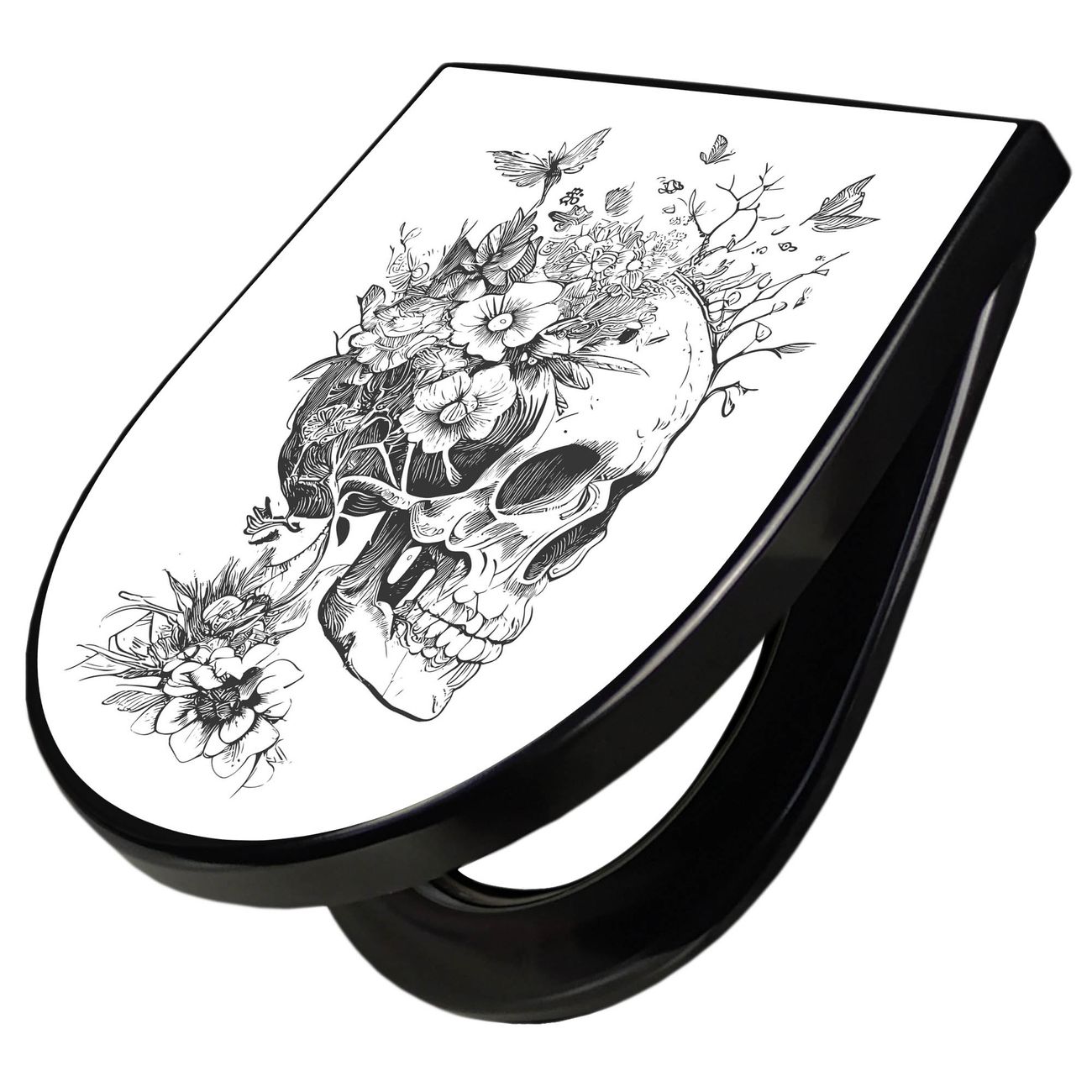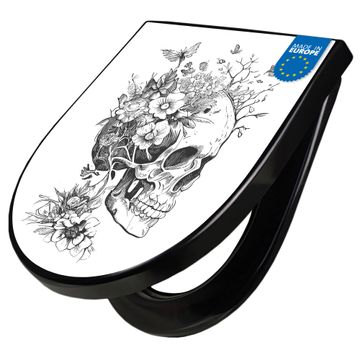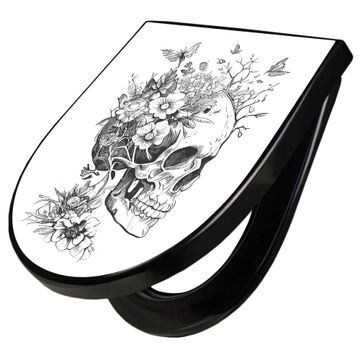 WC Sitz D-Form Schwarz mit Absenkautomatik Motiv Floral Skull