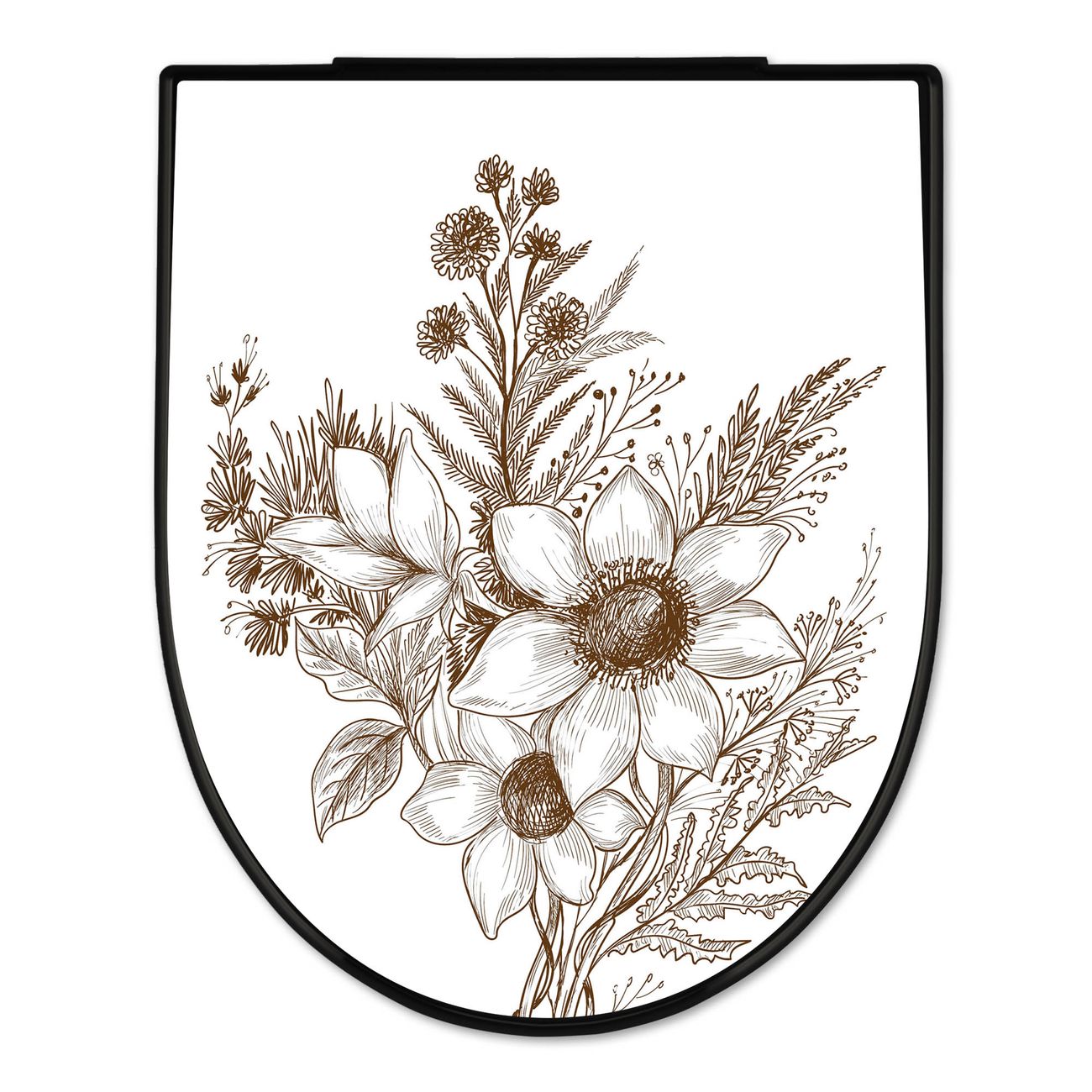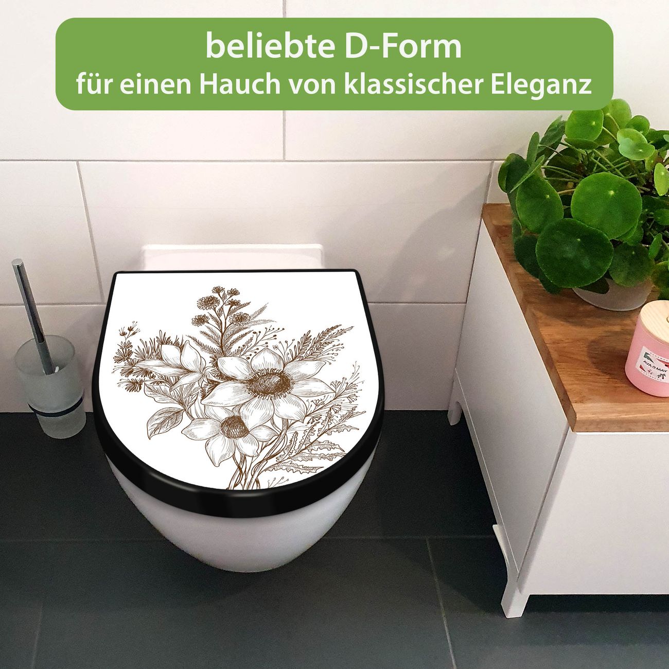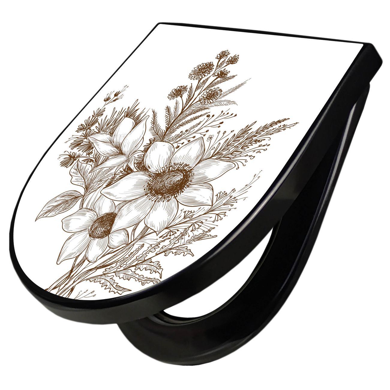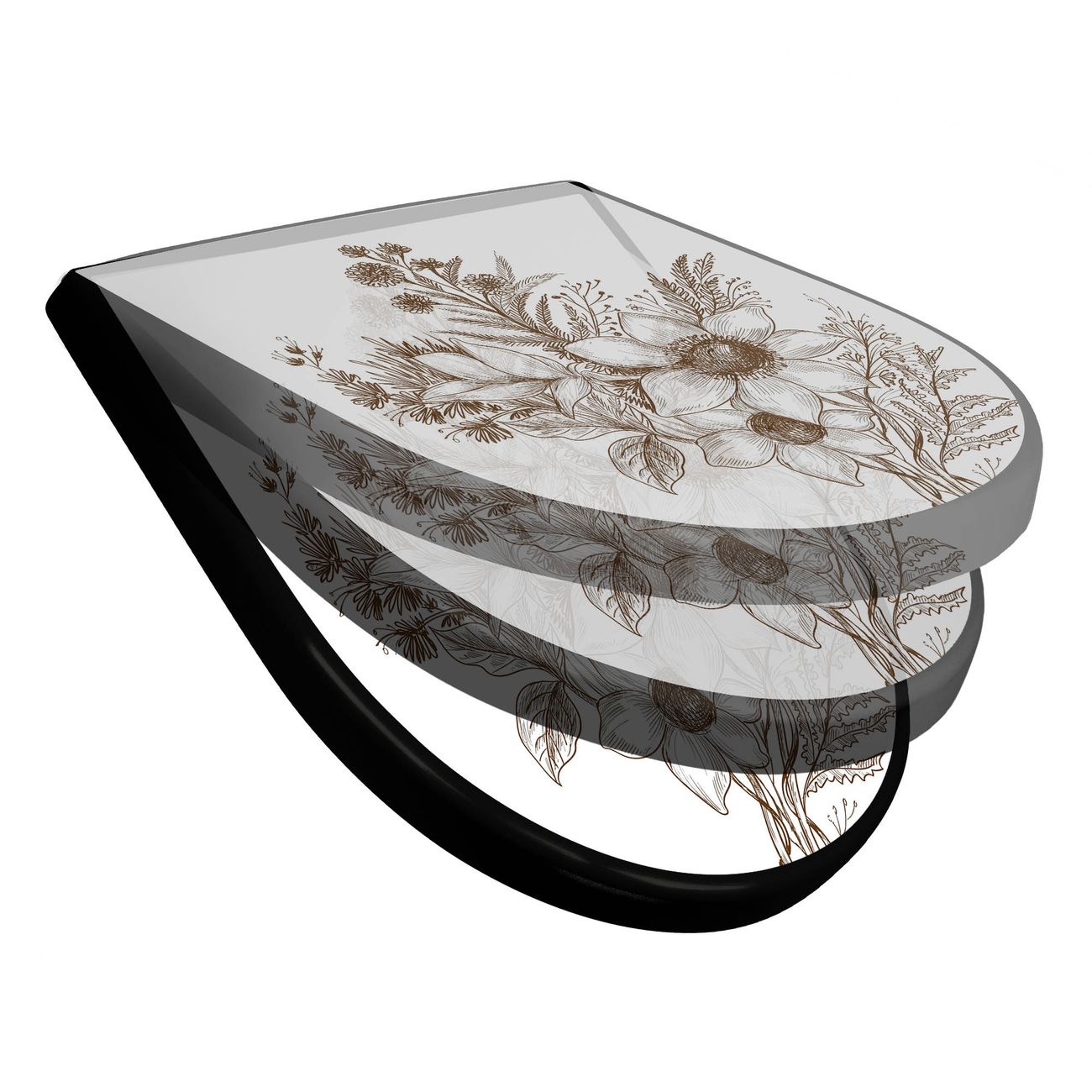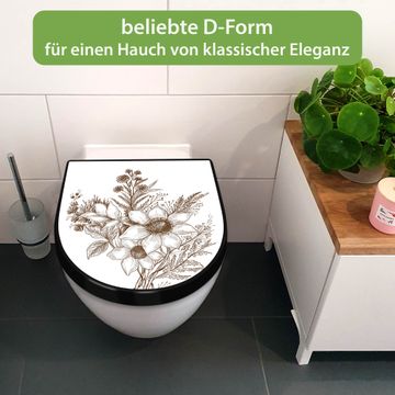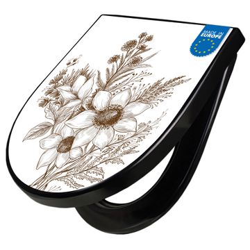 WC Sitz D-Form Schwarz mit Absenkautomatik Motiv Florale Zeichnung