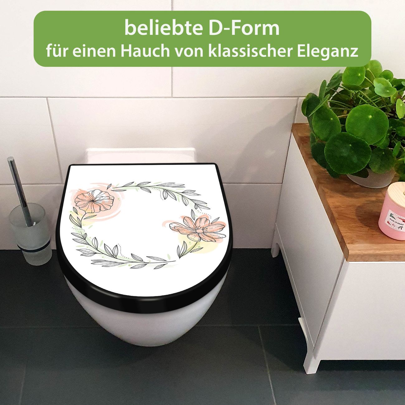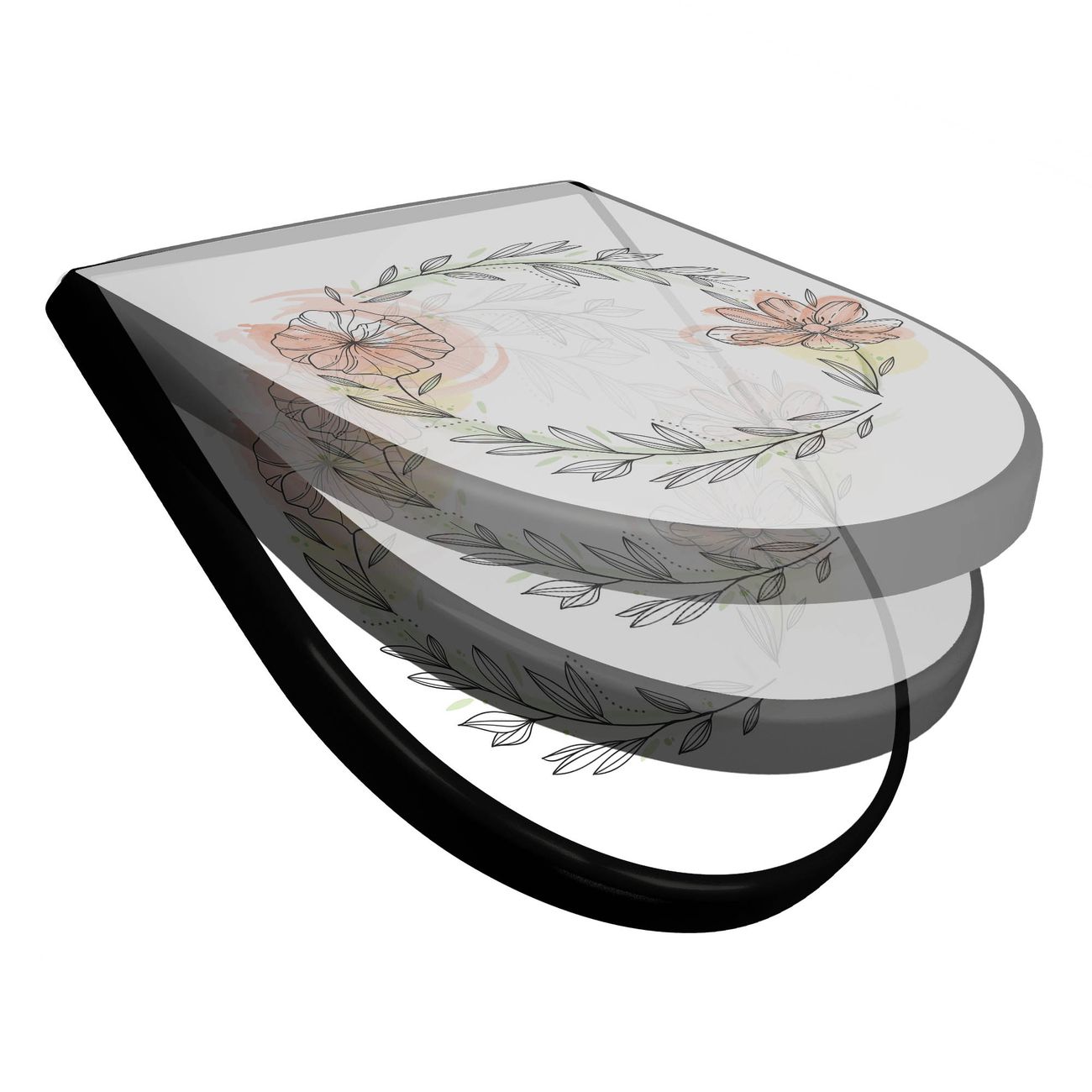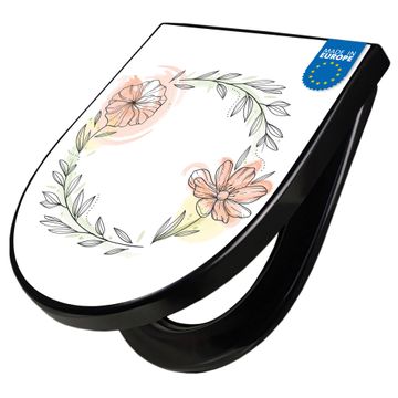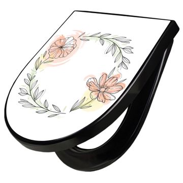 WC Sitz D-Form Schwarz mit Absenkautomatik Motiv Floraler Blütenkranz