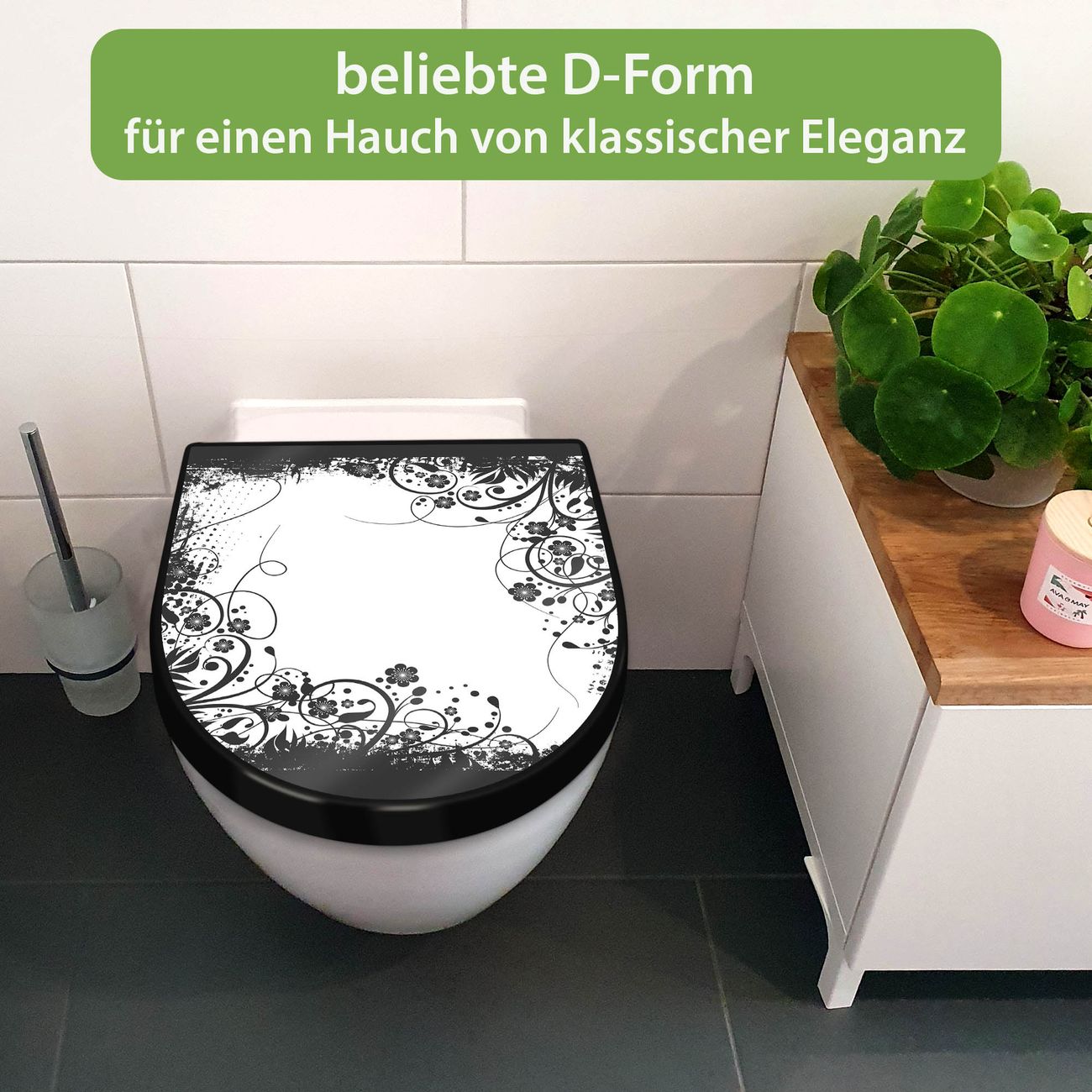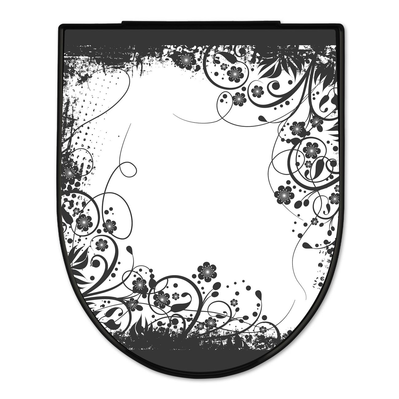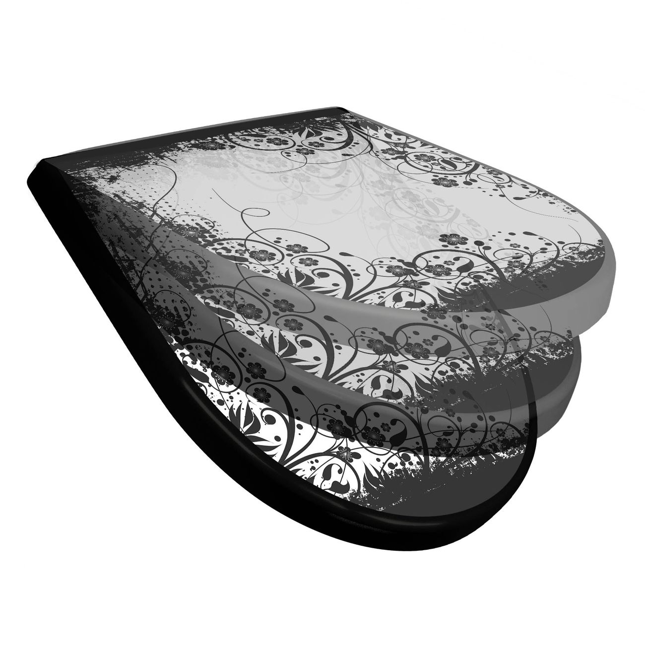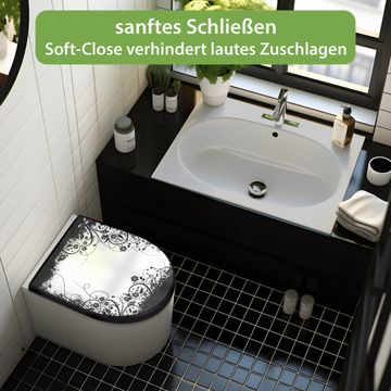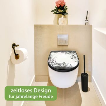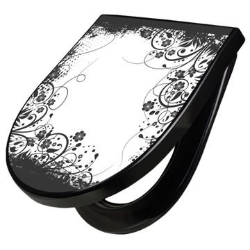 WC Sitz D-Form Schwarz mit Absenkautomatik Motiv Florales Schwarz-Weiß Muster