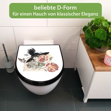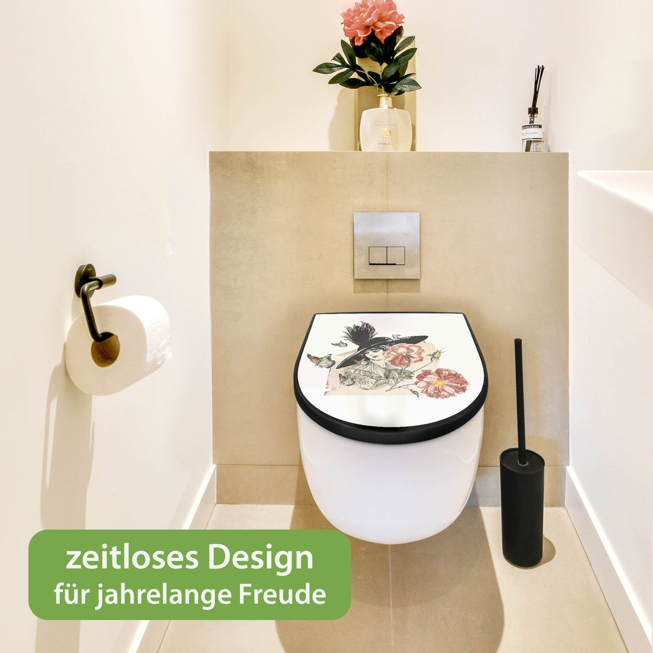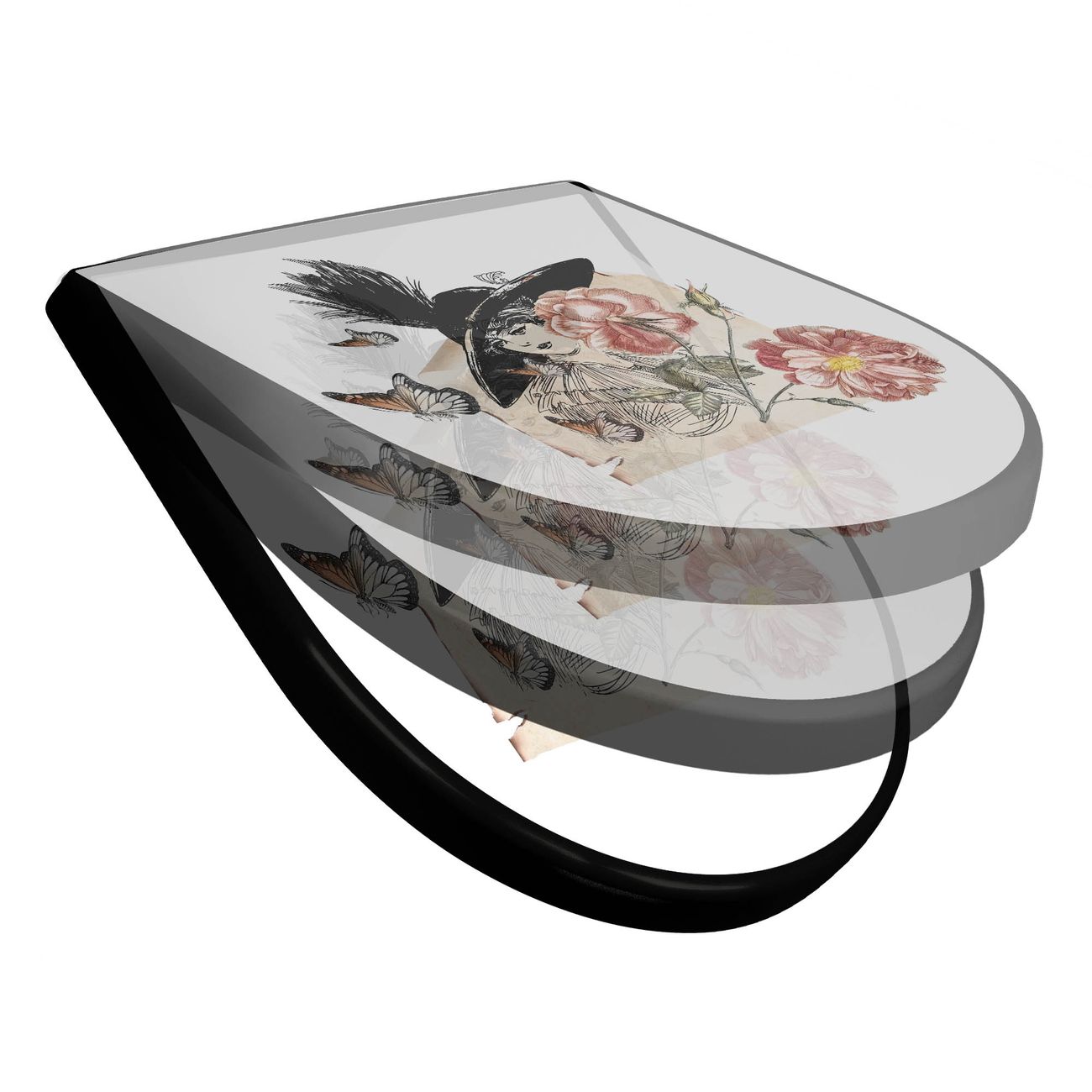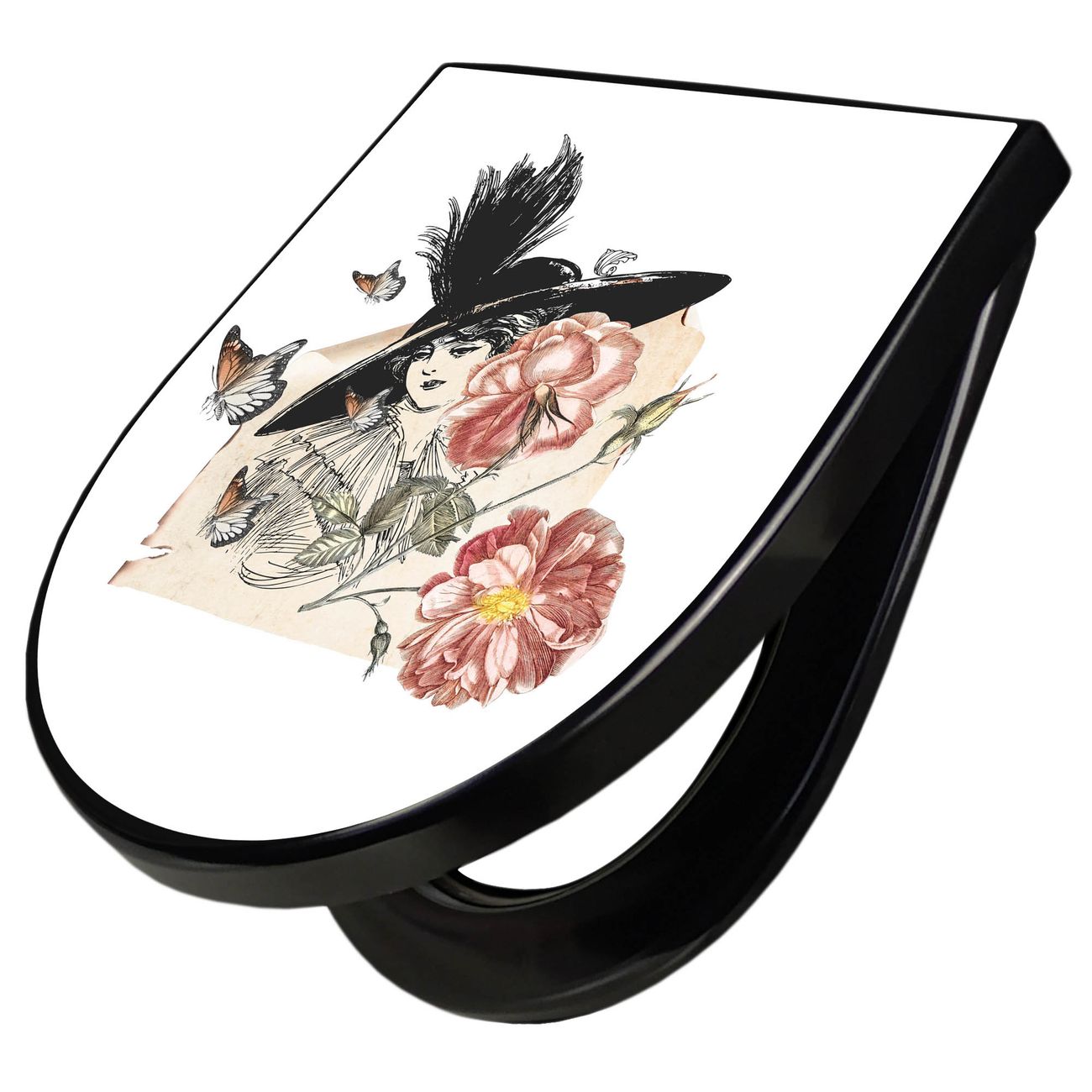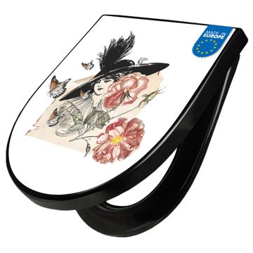 WC Sitz D-Form Schwarz mit Absenkautomatik Motiv Frau und Blühten Vintage