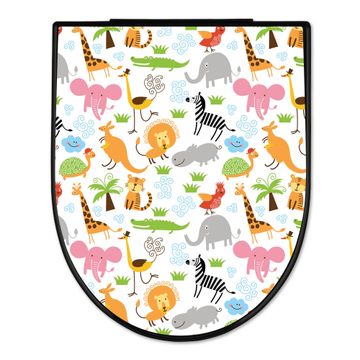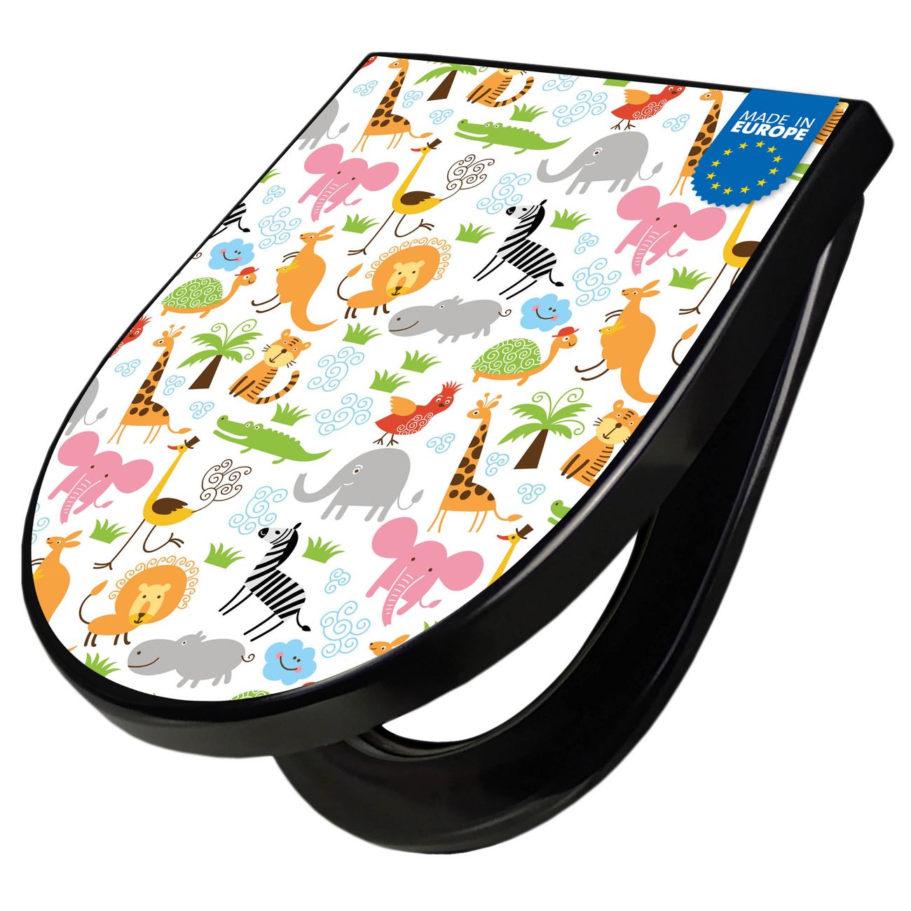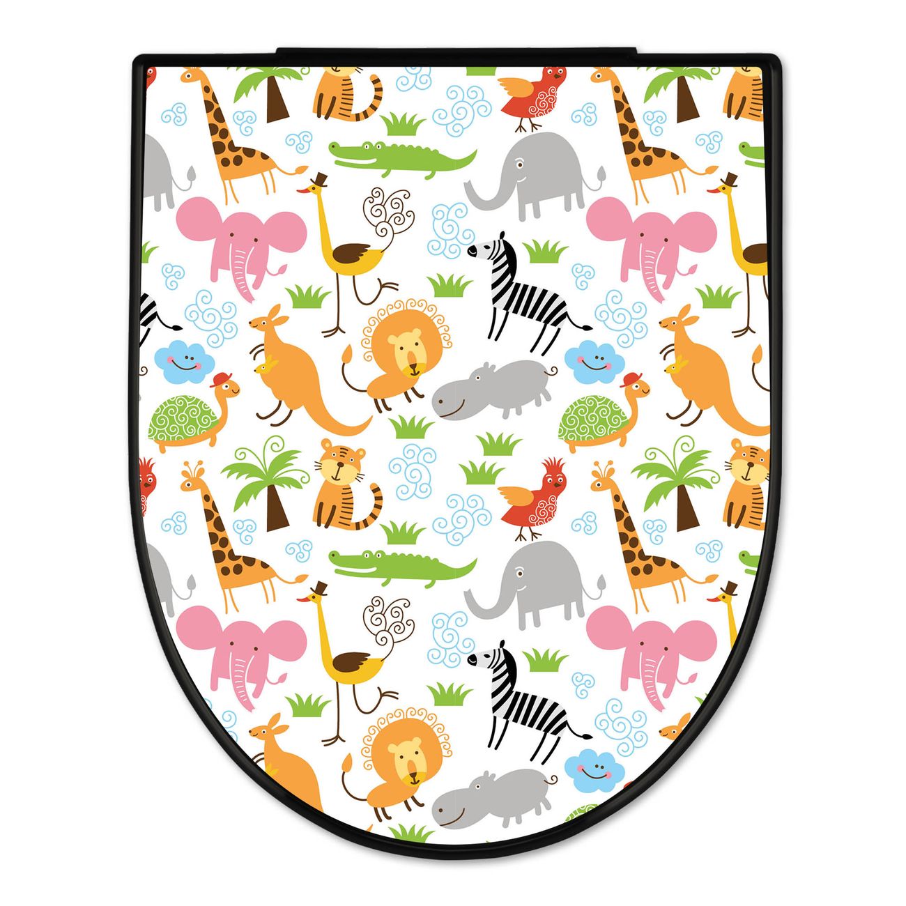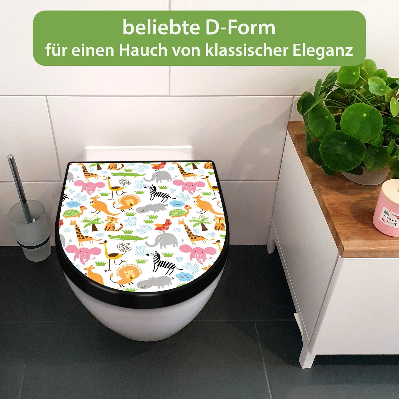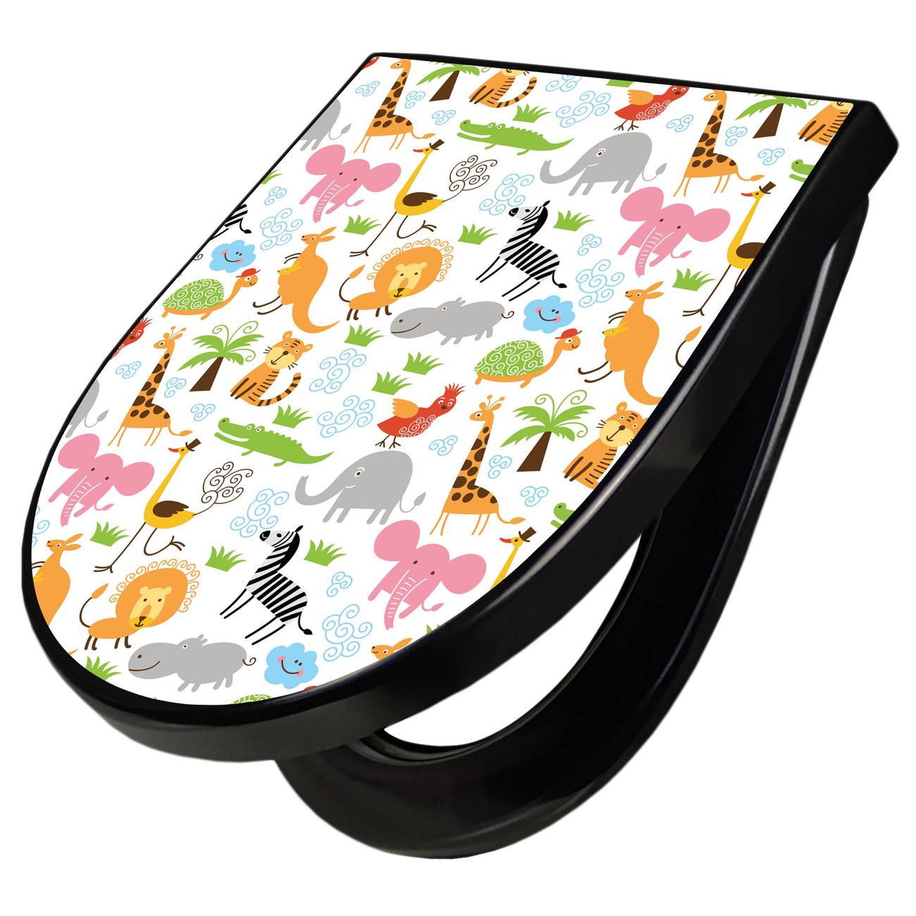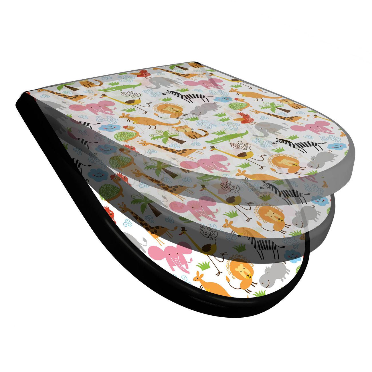 WC Sitz D-Form Schwarz mit Absenkautomatik Motiv Fröhliche Tiere