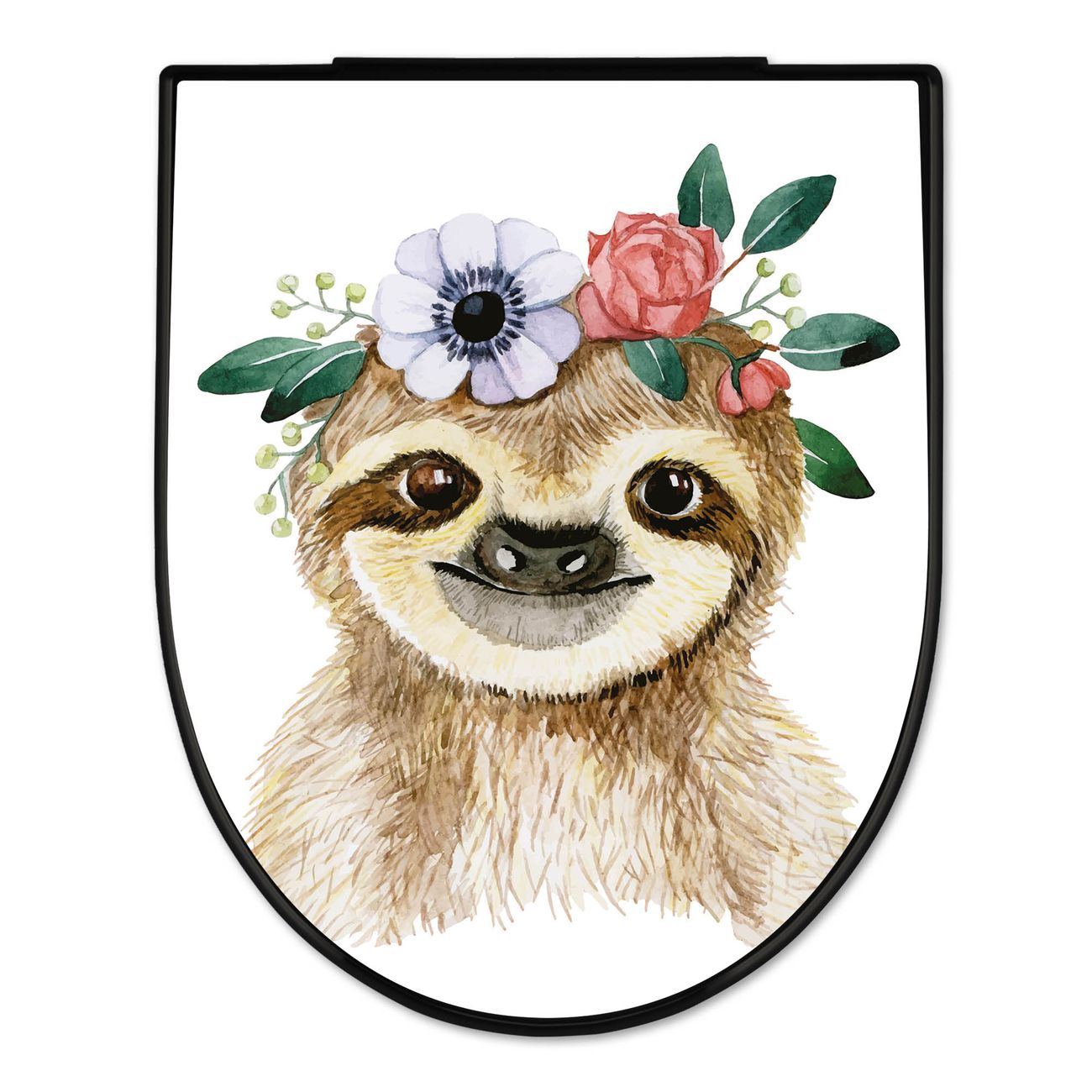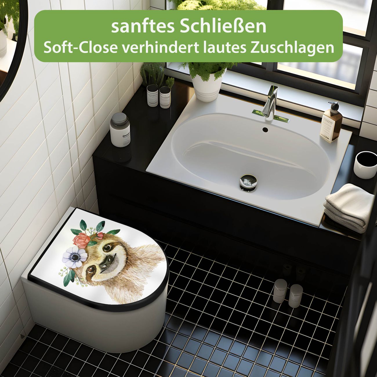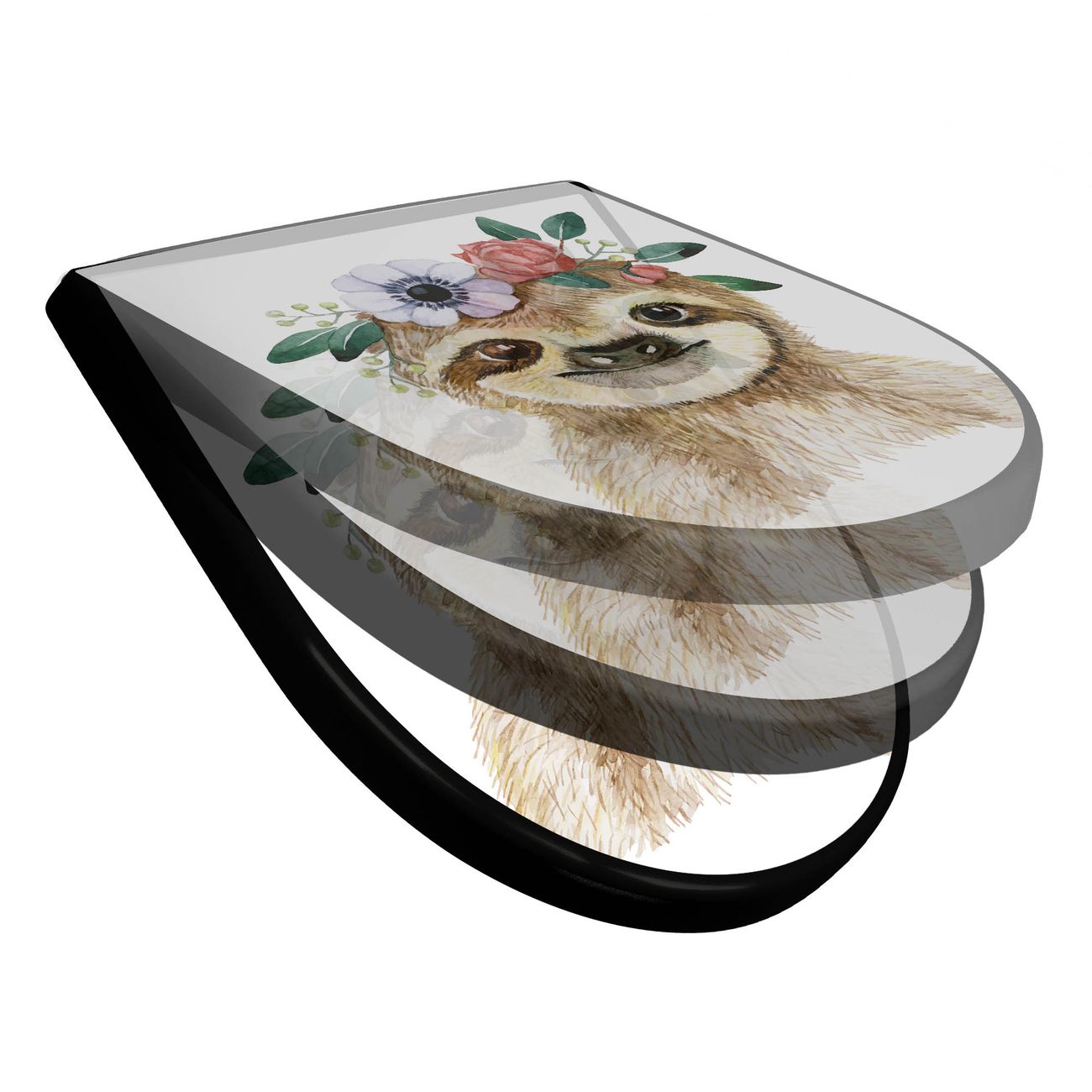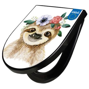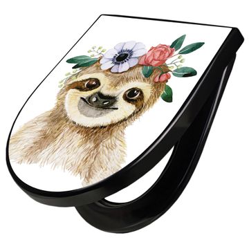 WC Sitz D-Form Schwarz mit Absenkautomatik Motiv Fröhliches Faultier mit Blumenkranz