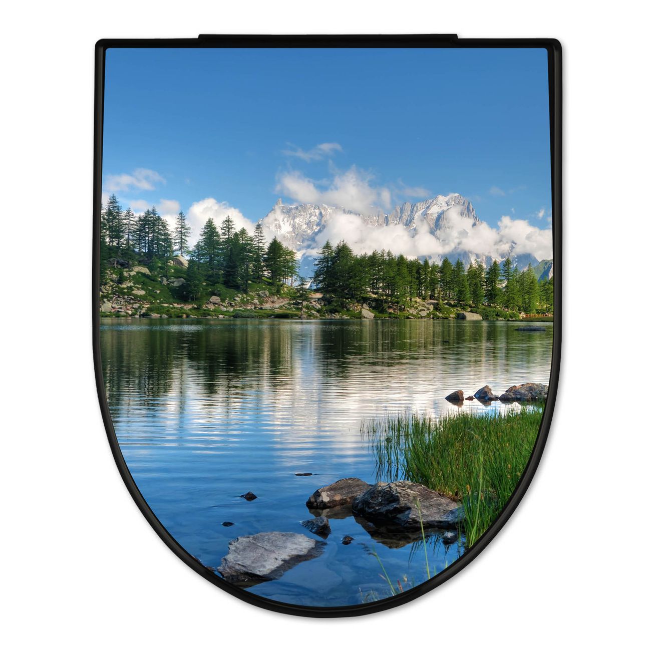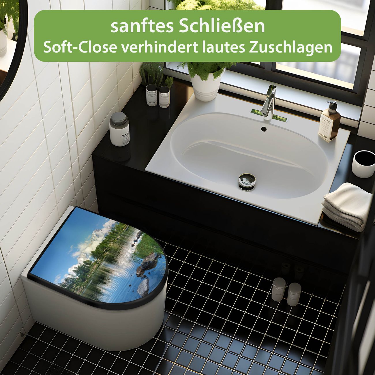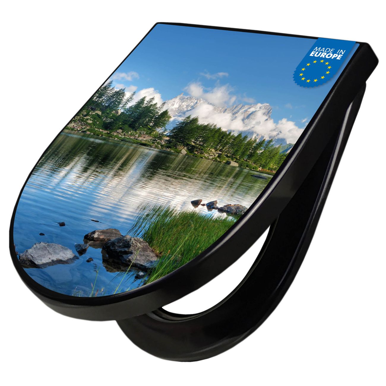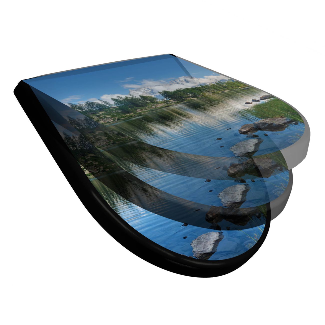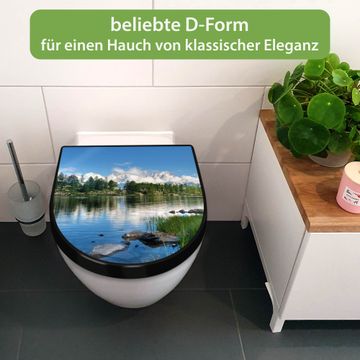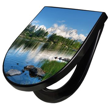 WC Sitz D-Form Schwarz mit Absenkautomatik Motiv Gebirgssee