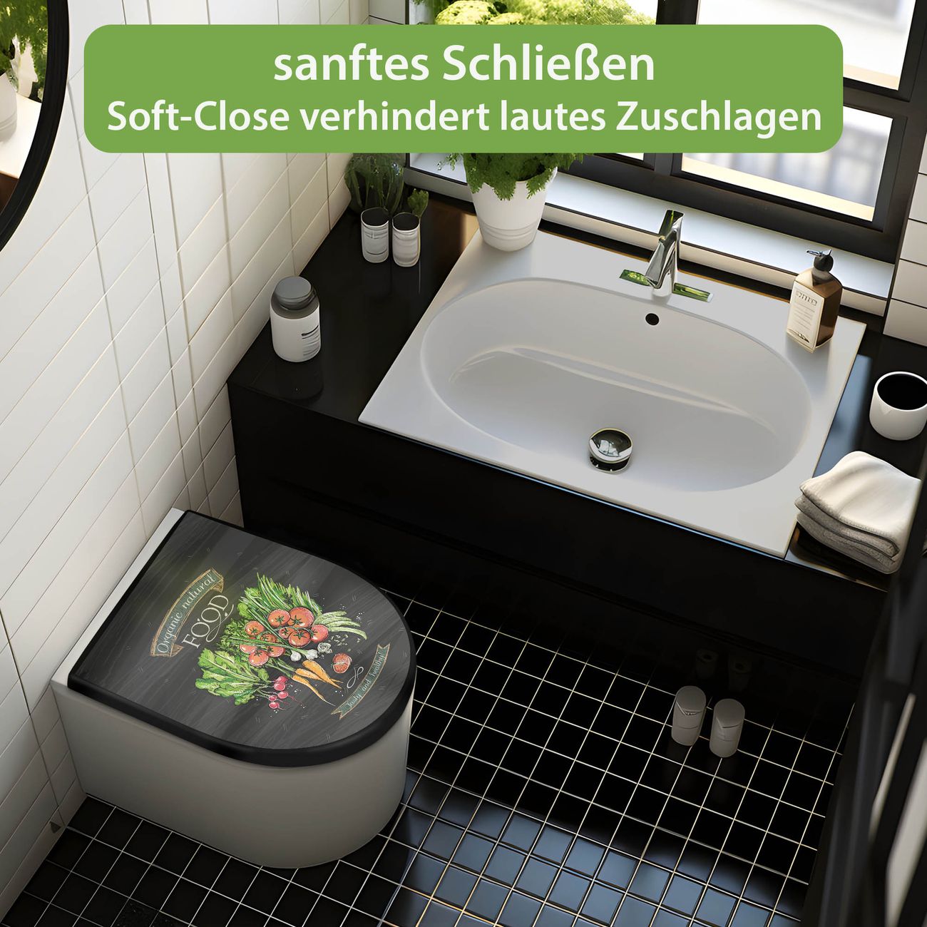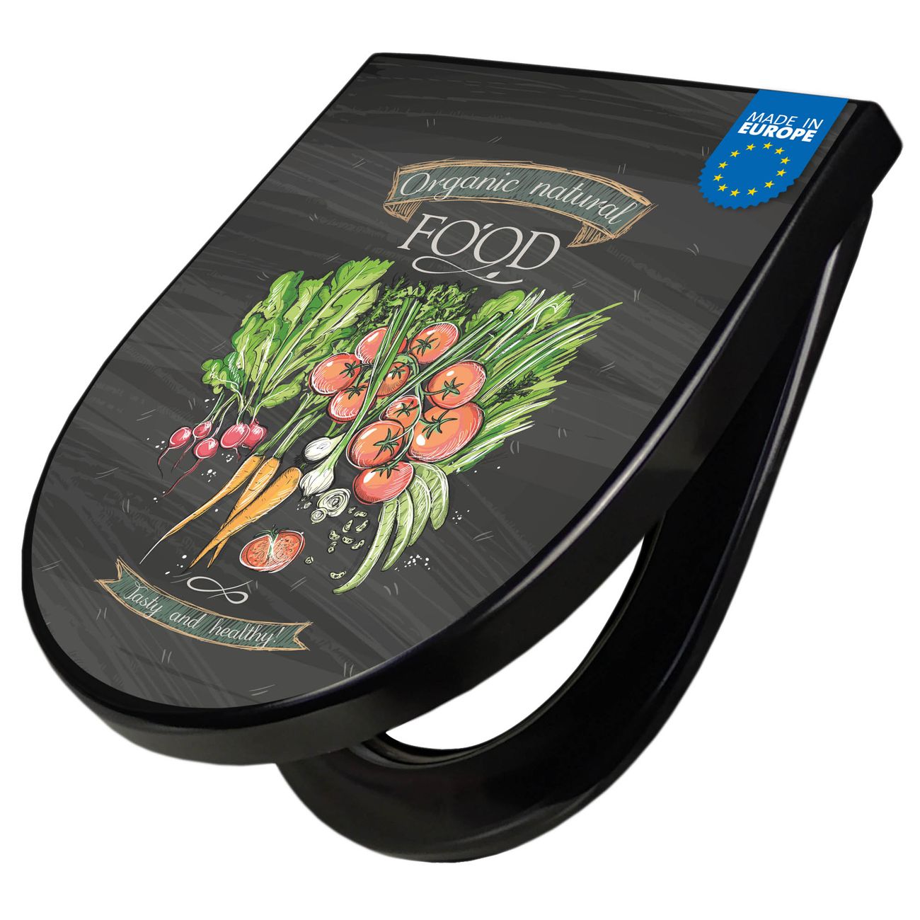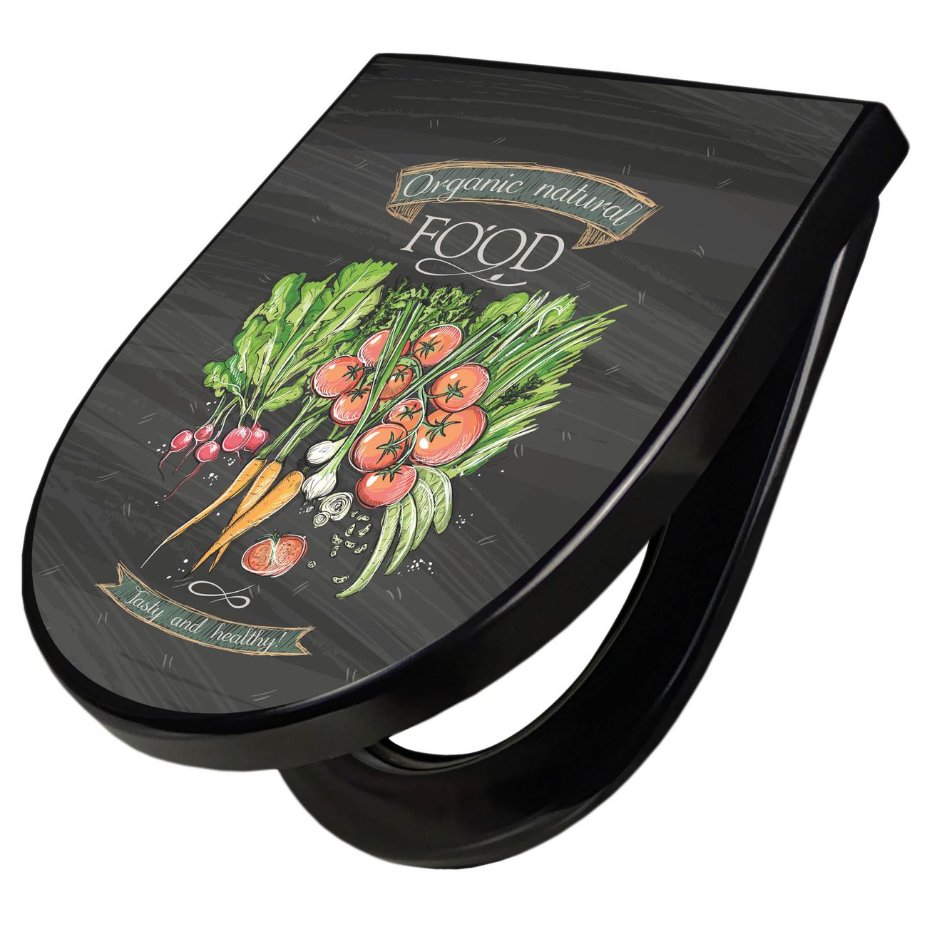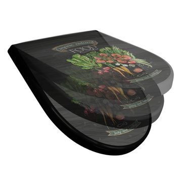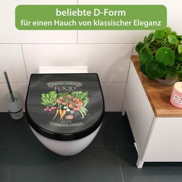 WC Sitz D-Form Schwarz mit Absenkautomatik Motiv Gesund Und Lecker
