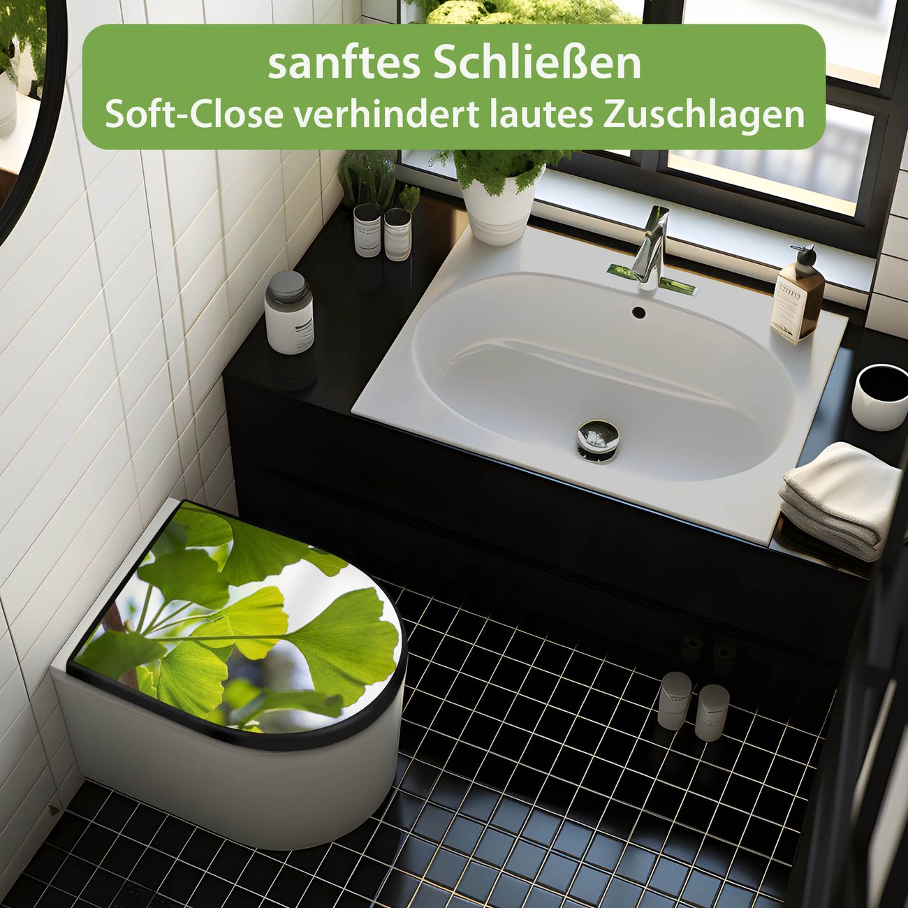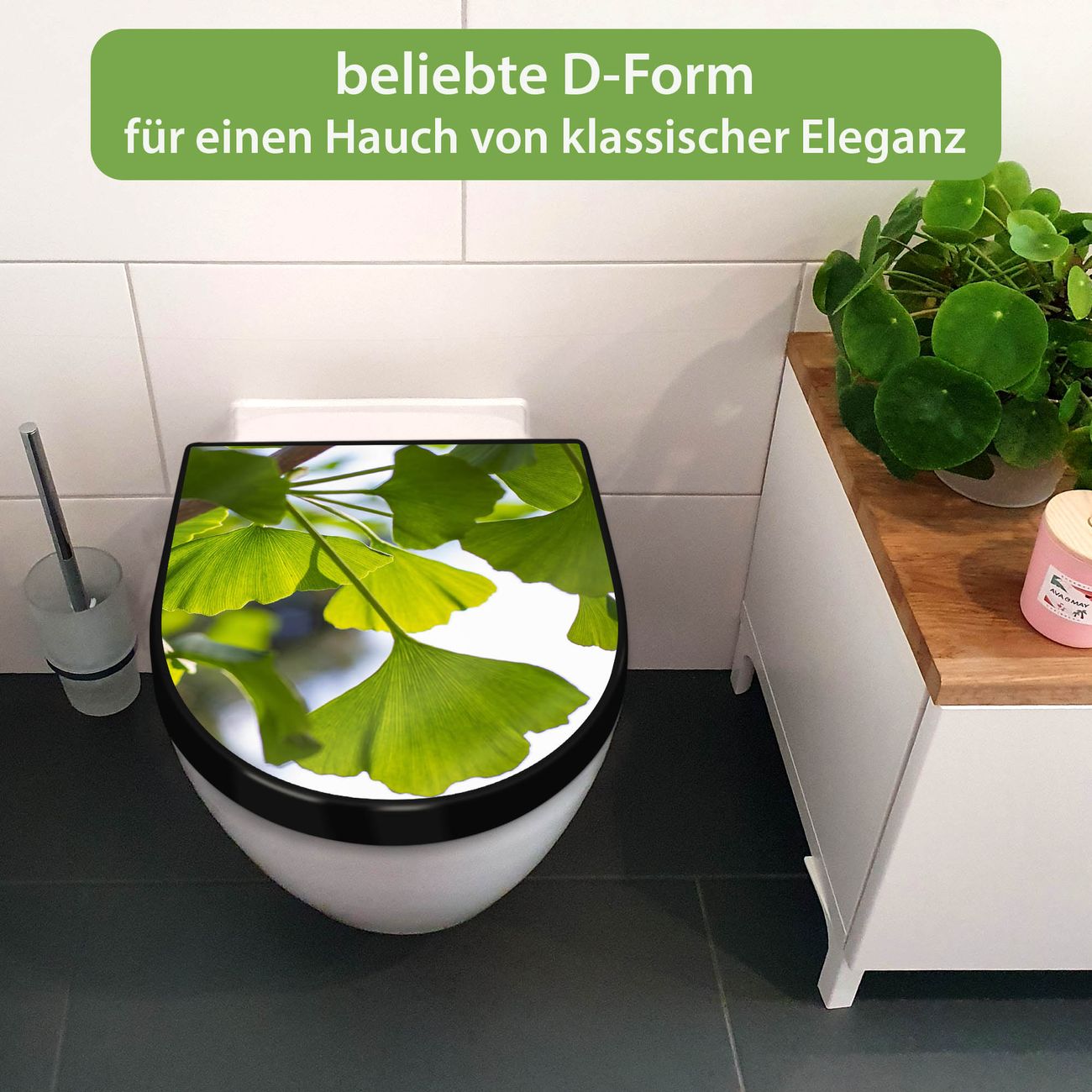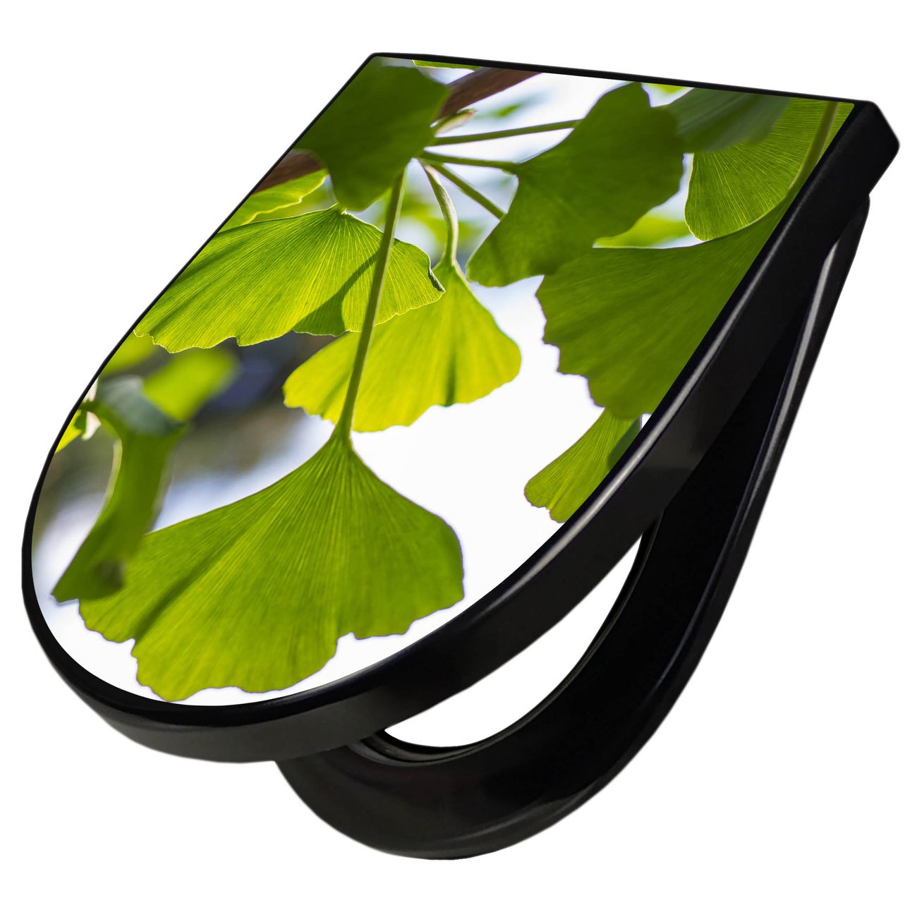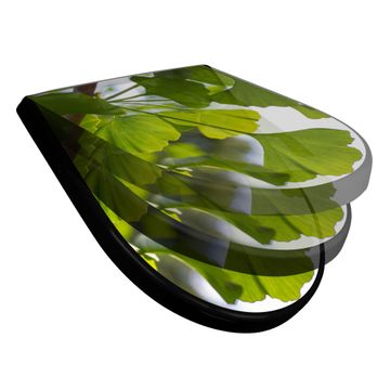 WC Sitz D-Form Schwarz mit Absenkautomatik Motiv Gingko