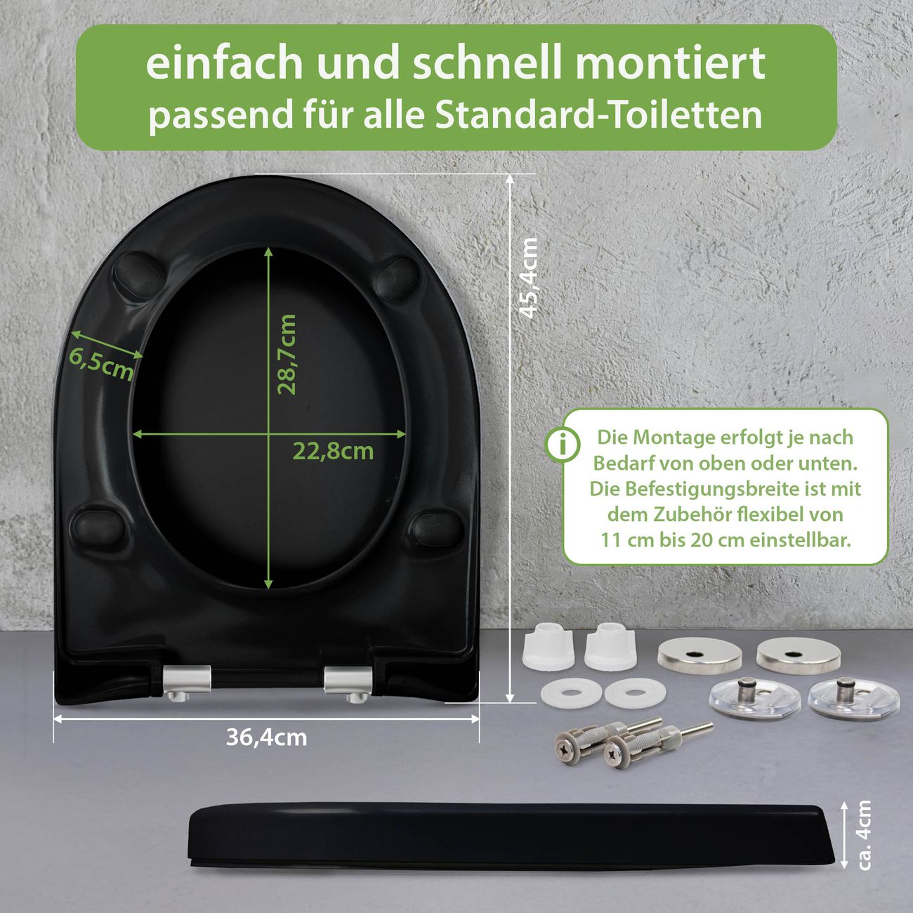 Der Toilettensitz mit Softclose Absenkautomatik besteht aus hochwertigem Duroplast. Ein Material, dass robust, angenehm in der Haptik und hygienisch ist. Die Montage erfolgt nach Bedarf von oben oder unten und ist kinderleicht.