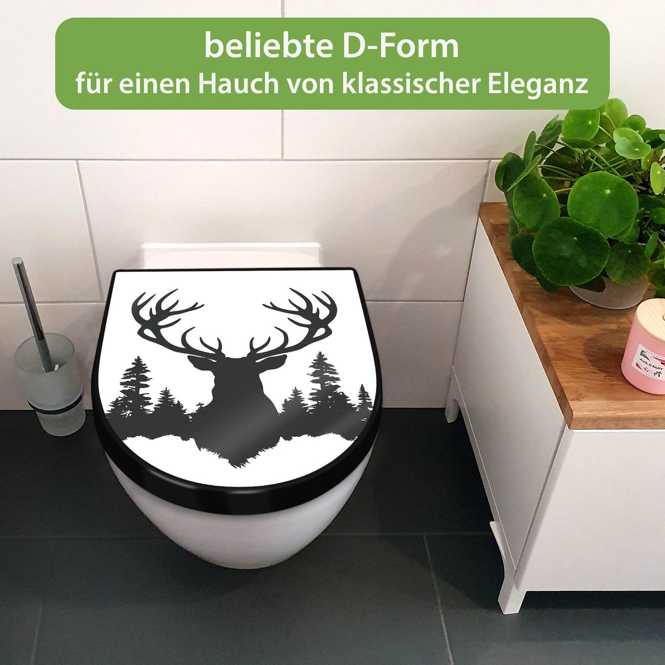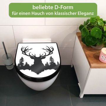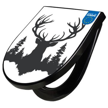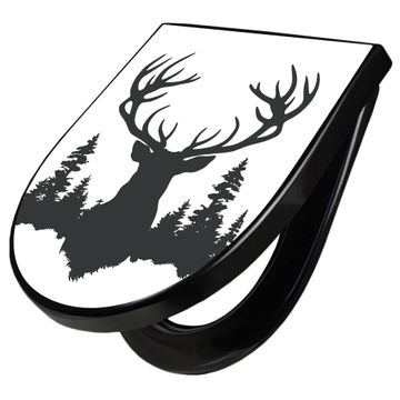WC Sitz D-Form Schwarz mit Absenkautomatik Motiv Hirsch im Wald Silhouette