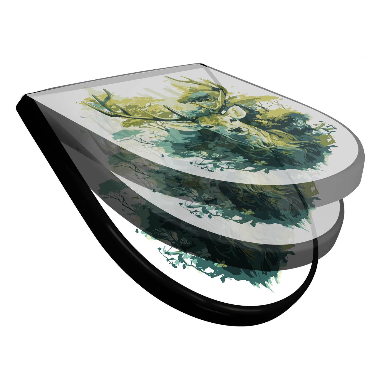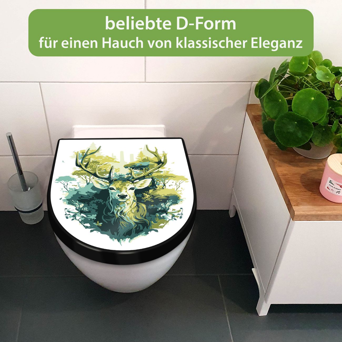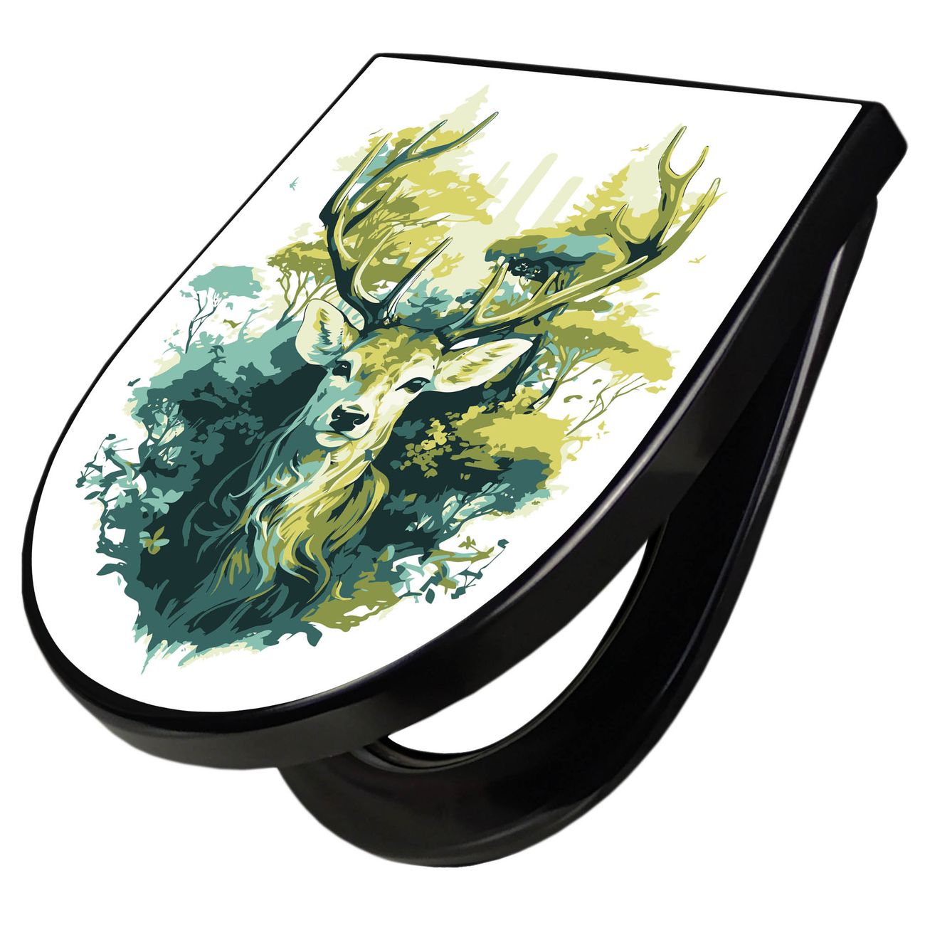 WC Sitz D-Form Schwarz mit Absenkautomatik Motiv Hirsch Wald Aquarell