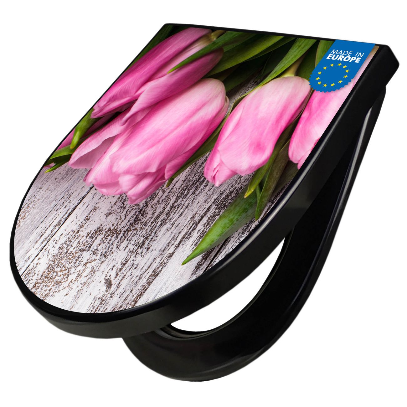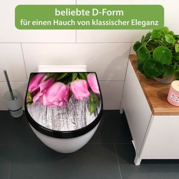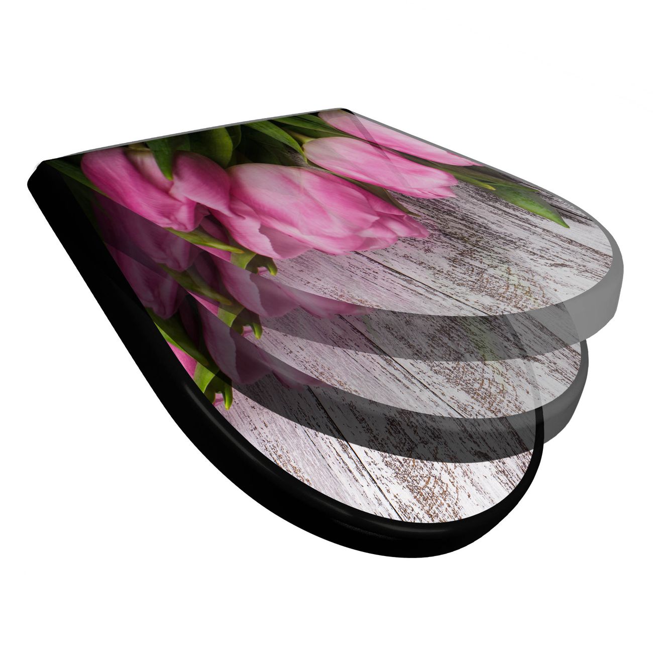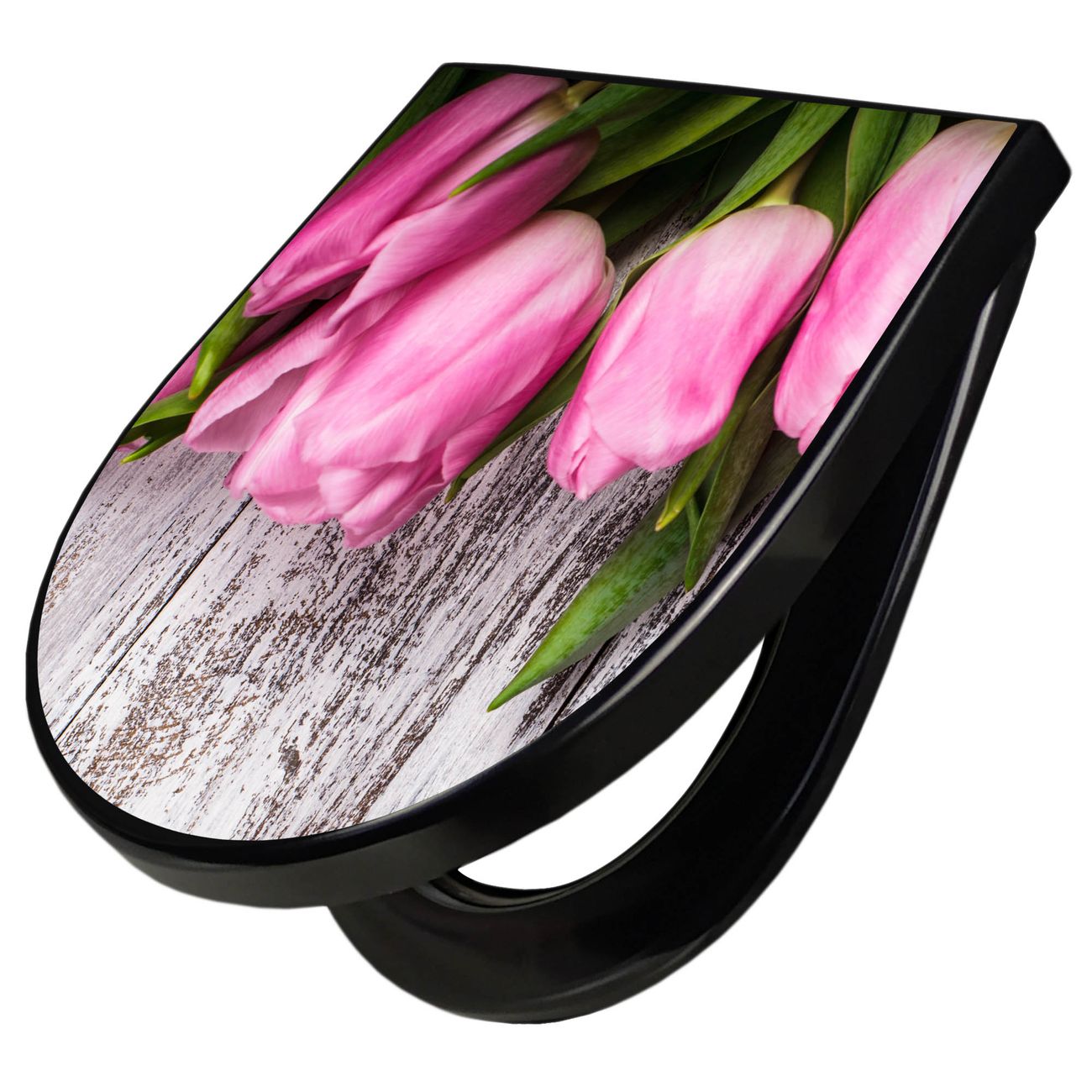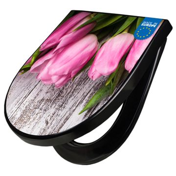 WC Sitz D-Form Schwarz mit Absenkautomatik Motiv Holz und Tulpen