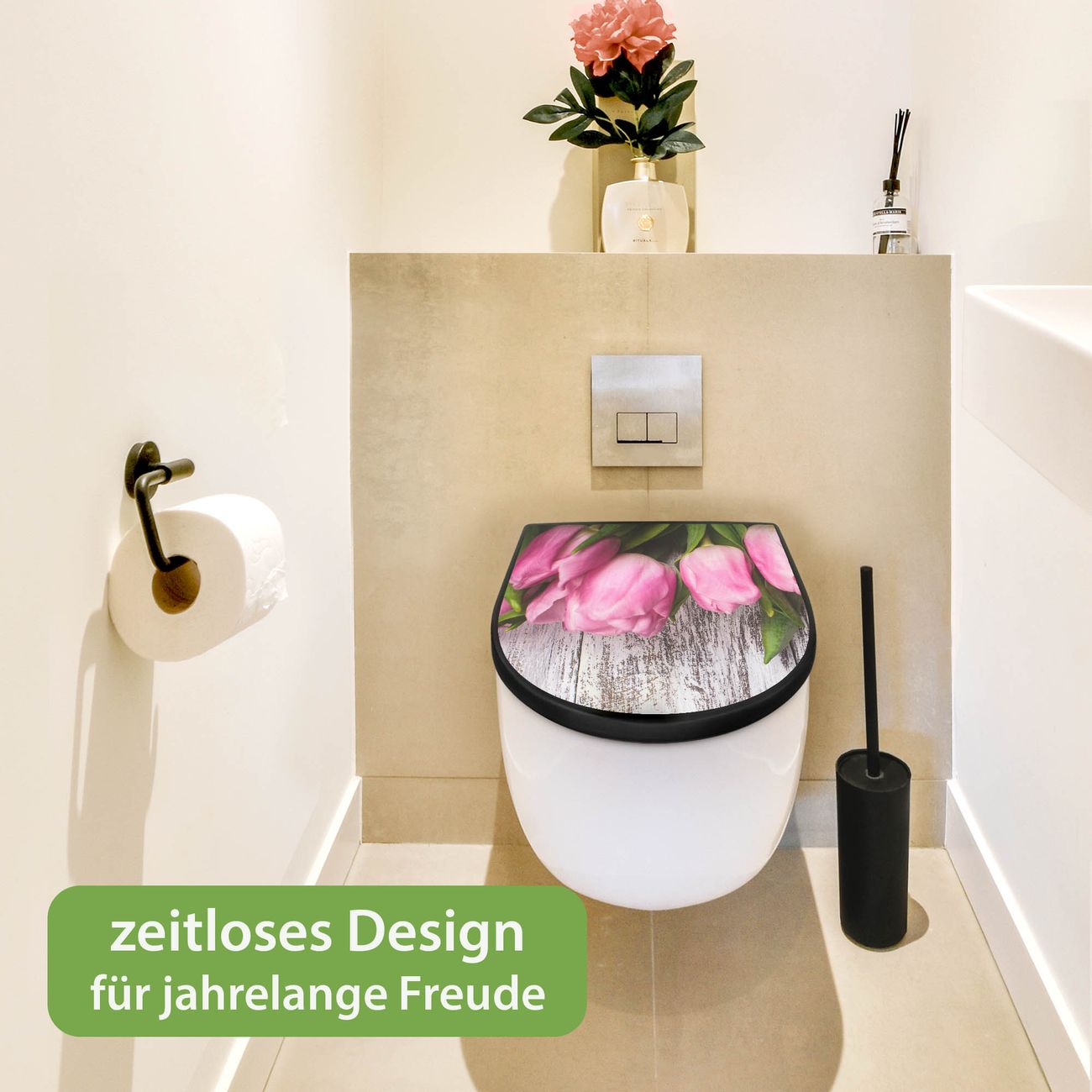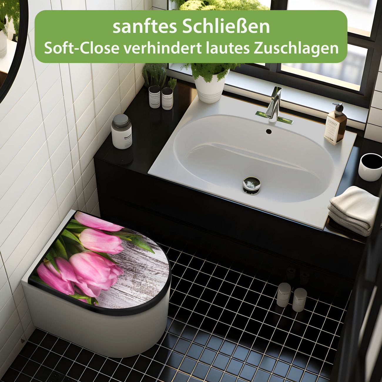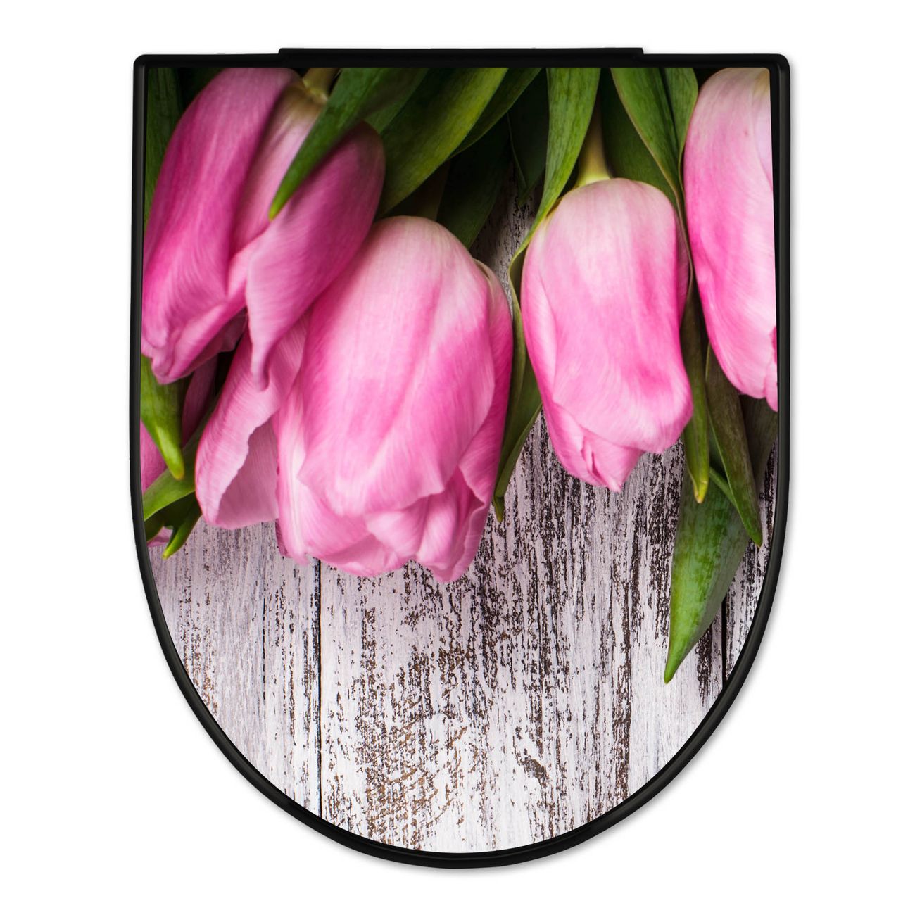 WC Sitz D-Form Schwarz mit Absenkautomatik Motiv Holz und Tulpen