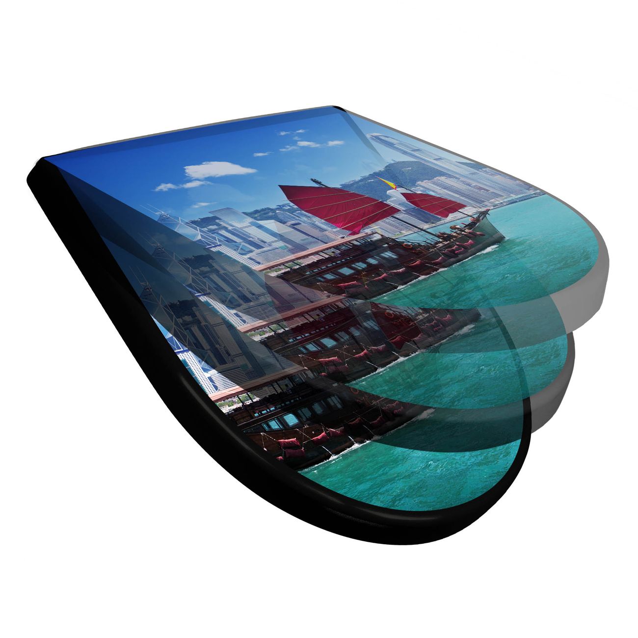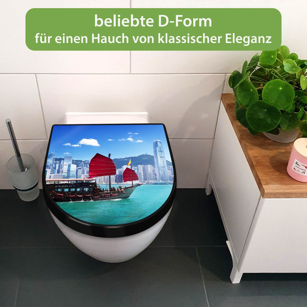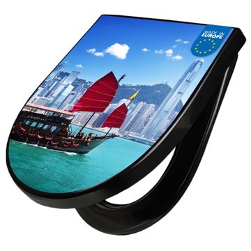 WC Sitz D-Form Schwarz mit Absenkautomatik Motiv Hong Kong