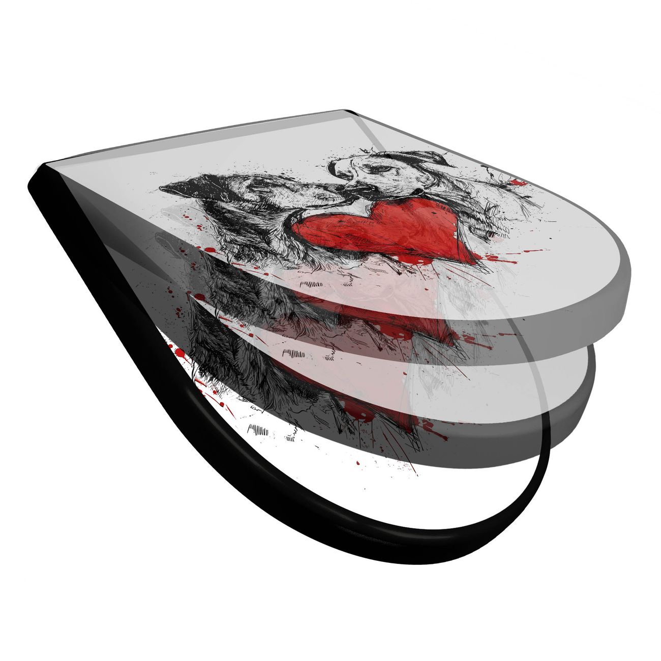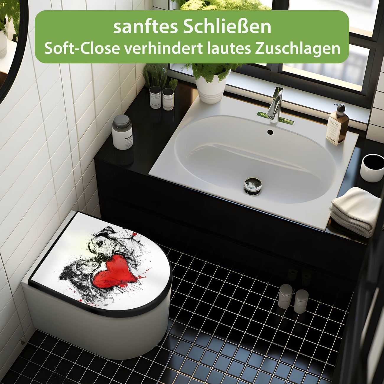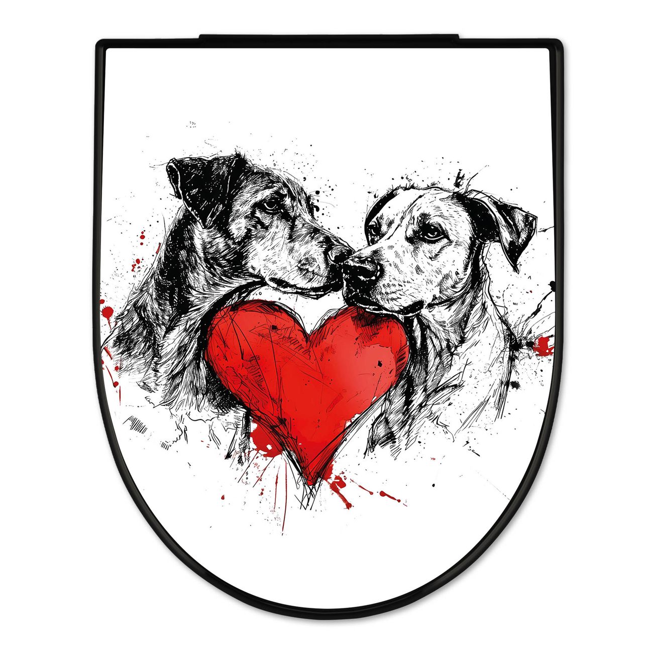 WC Sitz D-Form Schwarz mit Absenkautomatik Motiv Hunde mit Herz