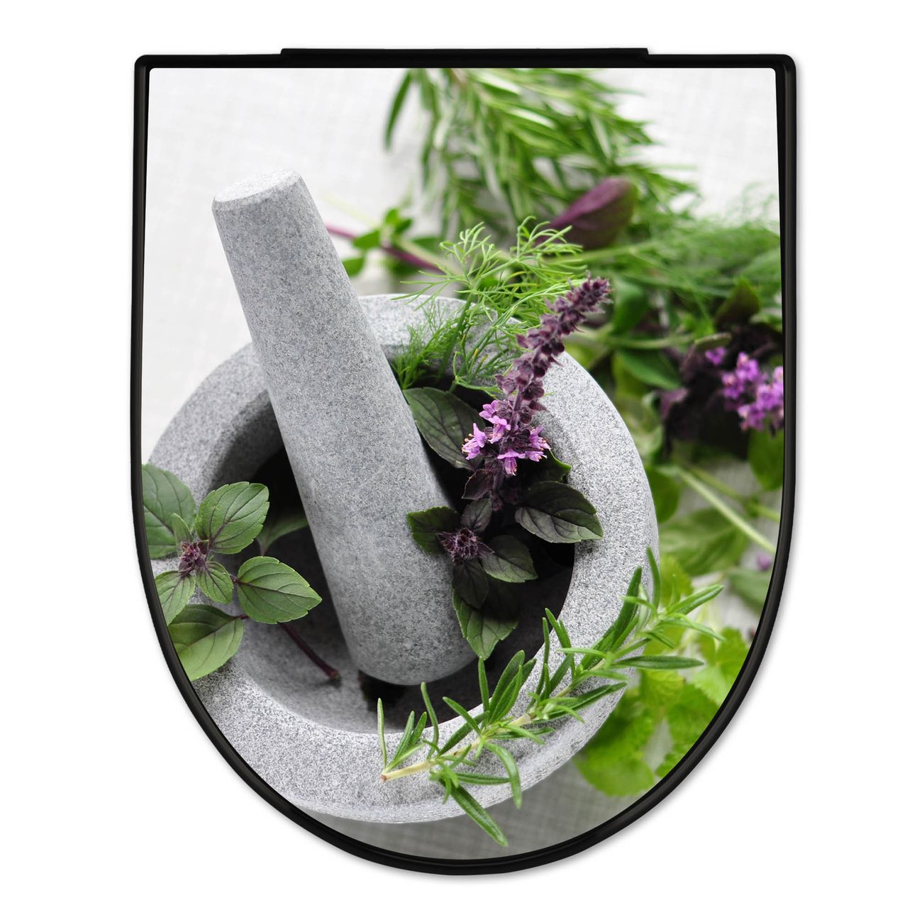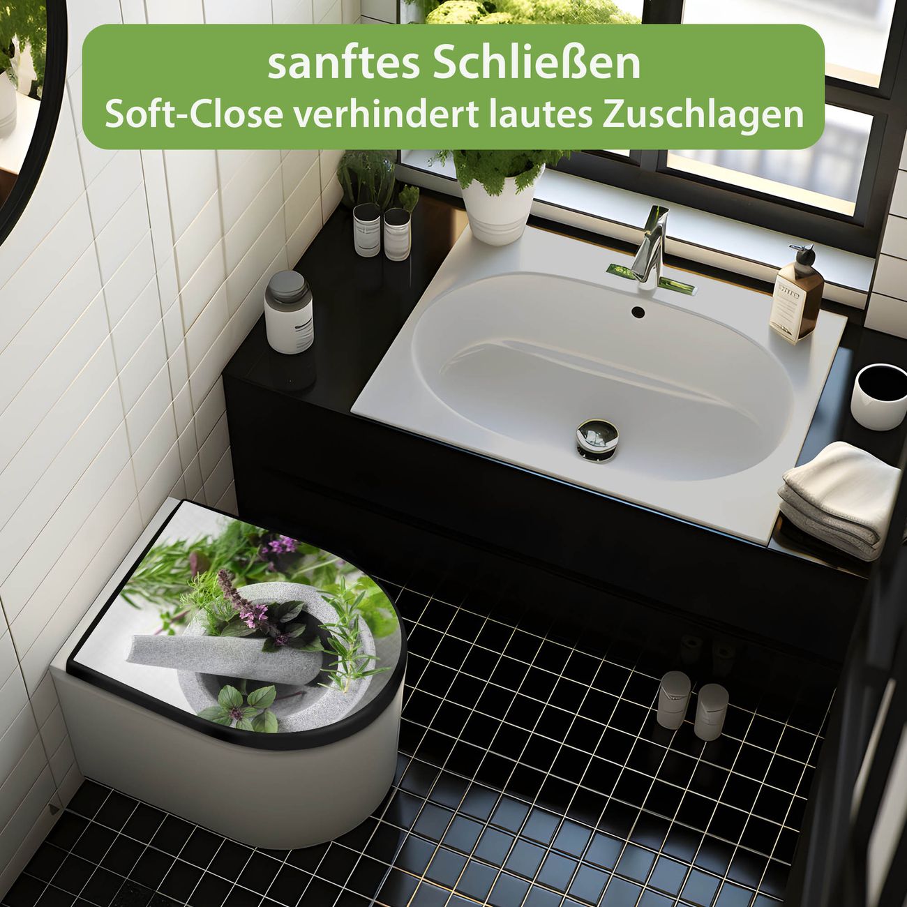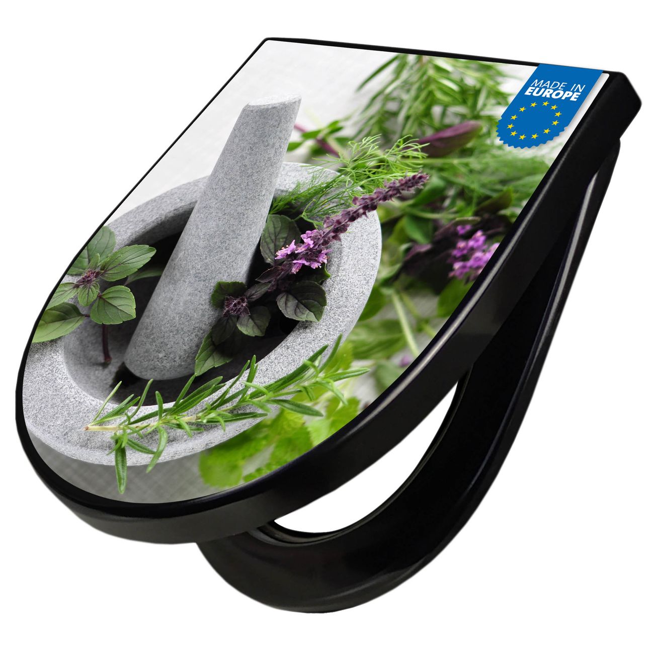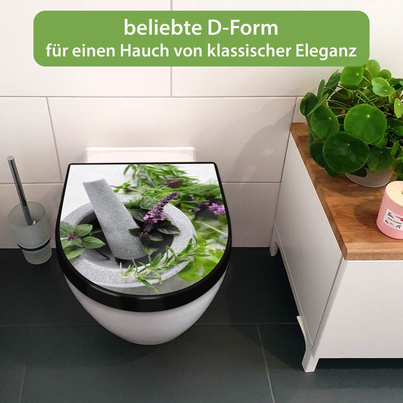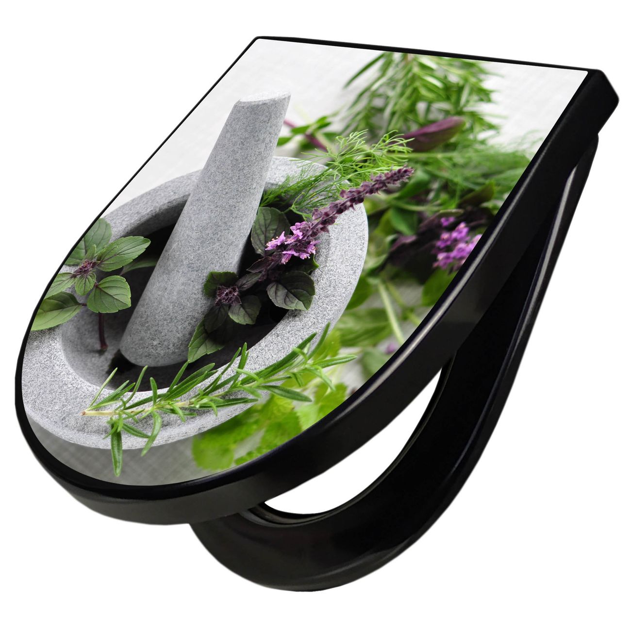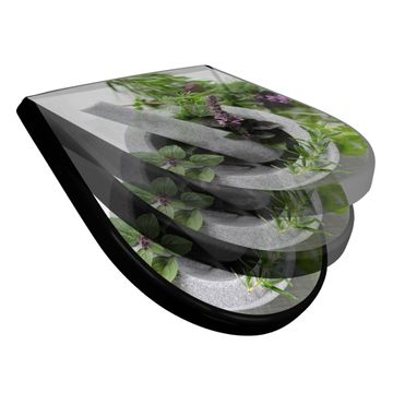 WC Sitz D-Form Schwarz mit Absenkautomatik Motiv Kräuter