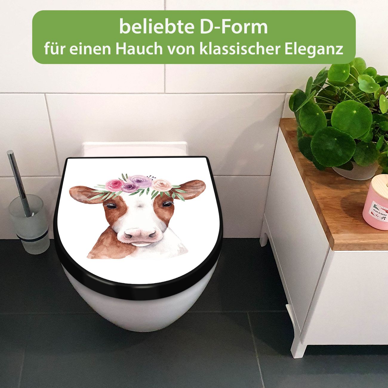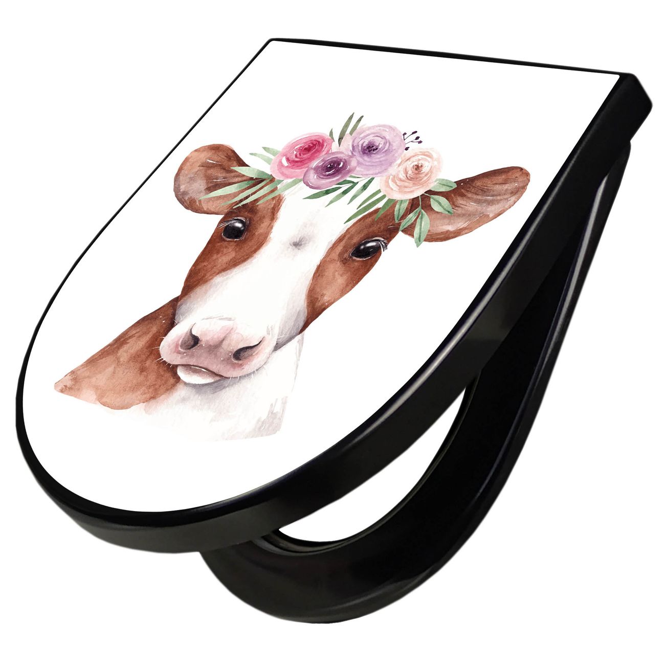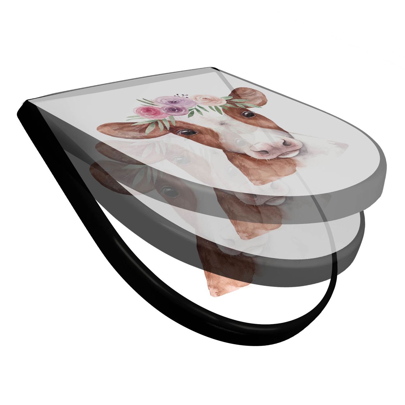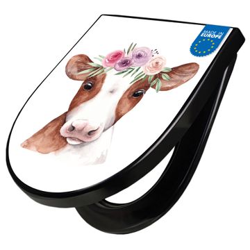 WC Sitz D-Form Schwarz mit Absenkautomatik Motiv Kuh mit Blumenkrone