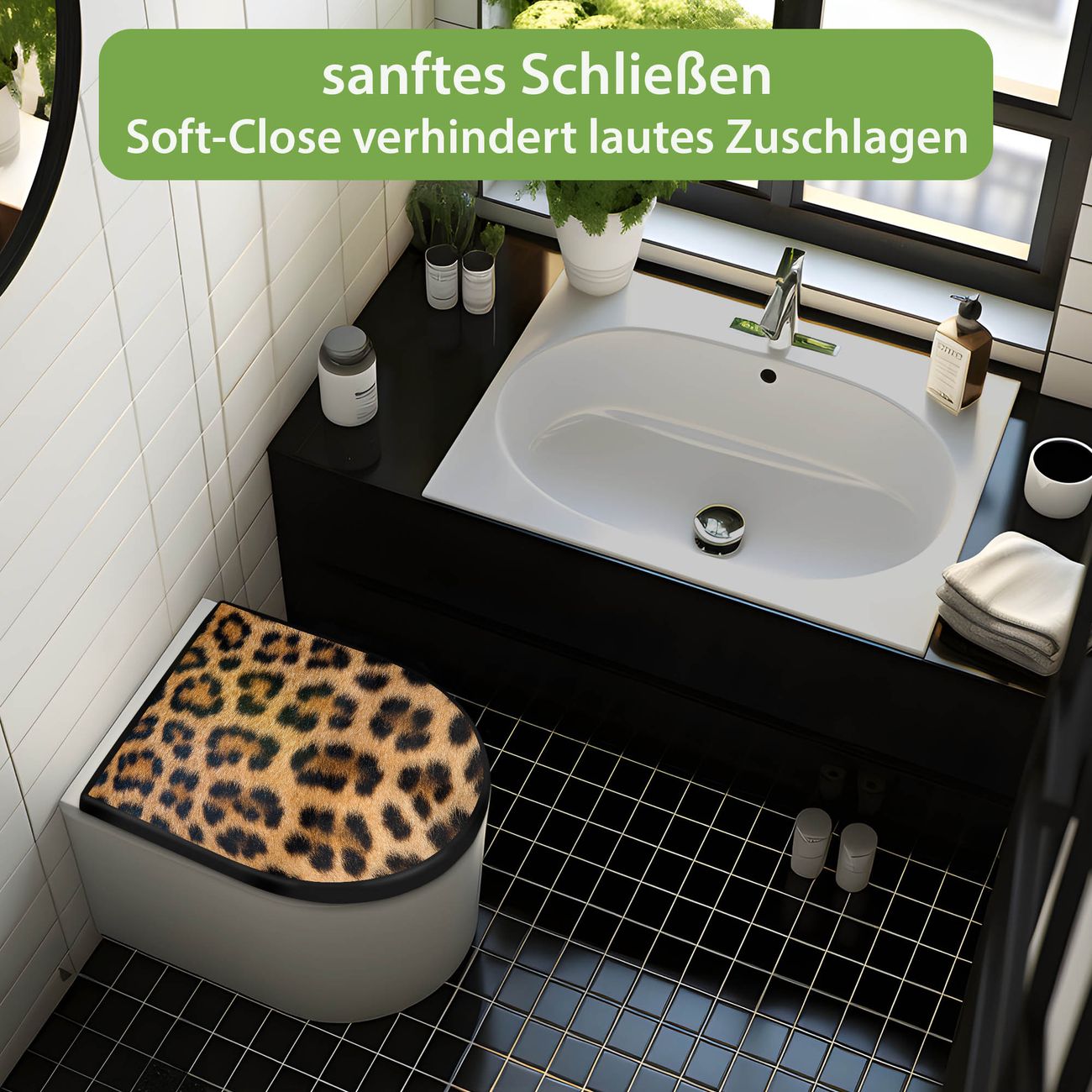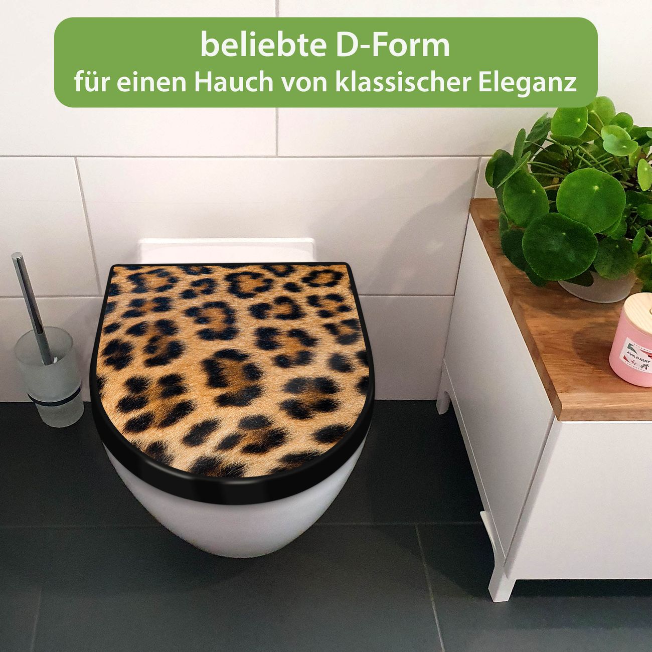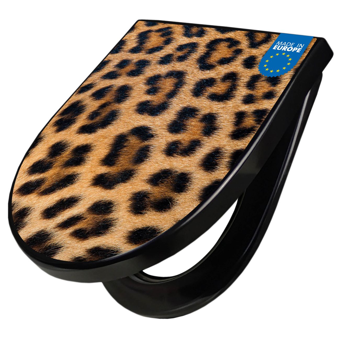 WC Sitz D-Form Schwarz mit Absenkautomatik Motiv Leopardenfell