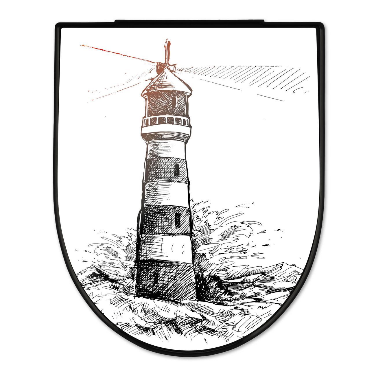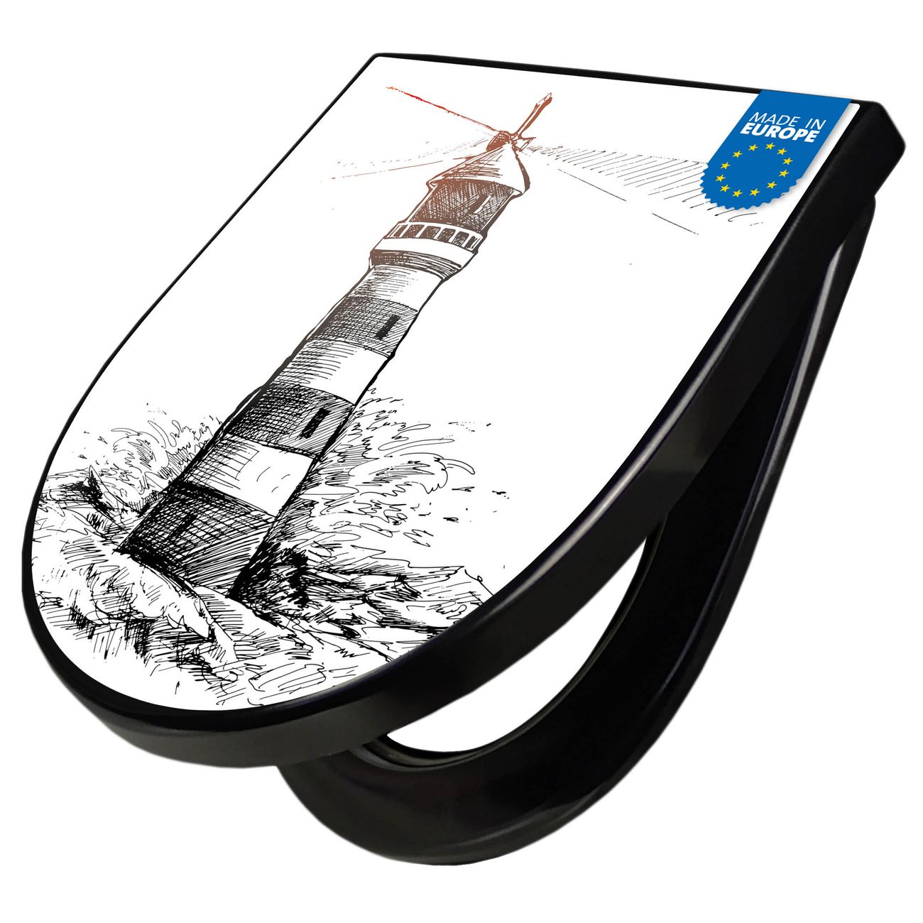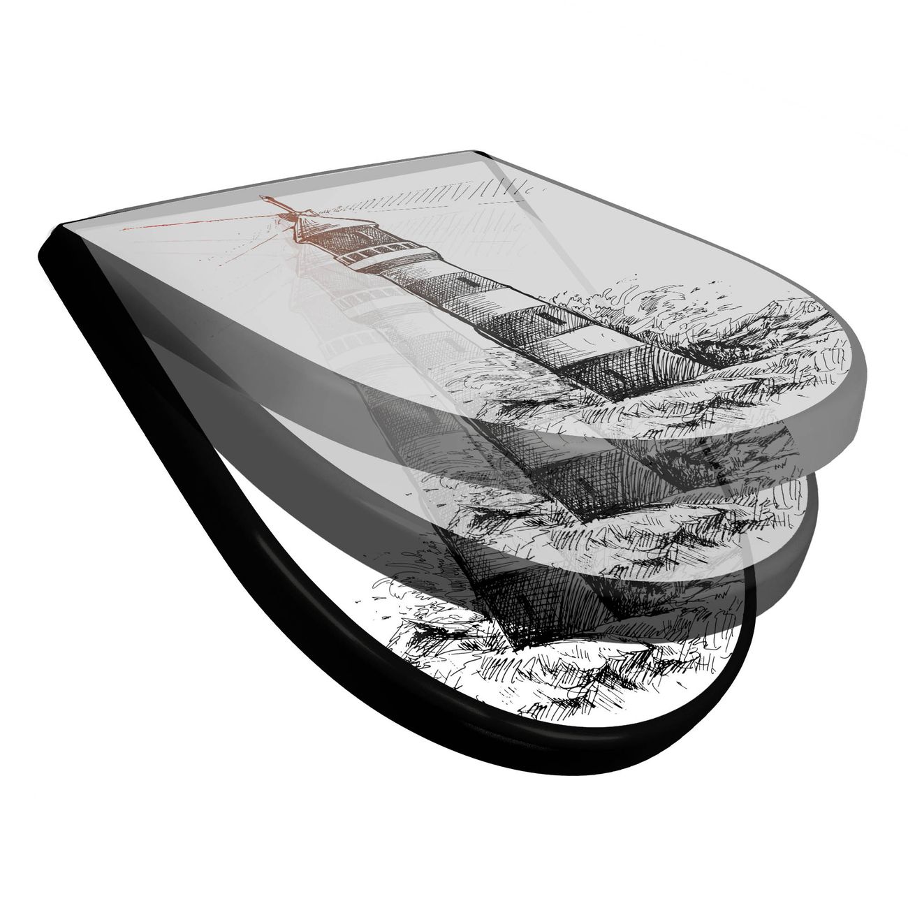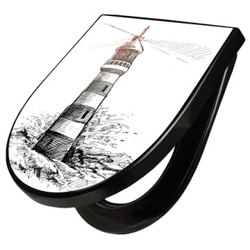 WC Sitz D-Form Schwarz mit Absenkautomatik Motiv Leuchtturm in der Brandung