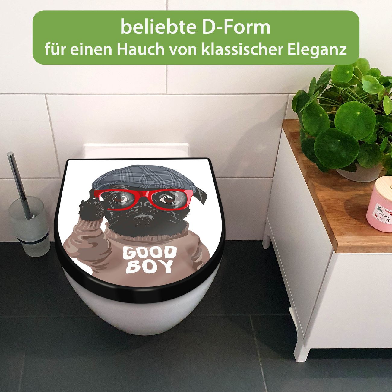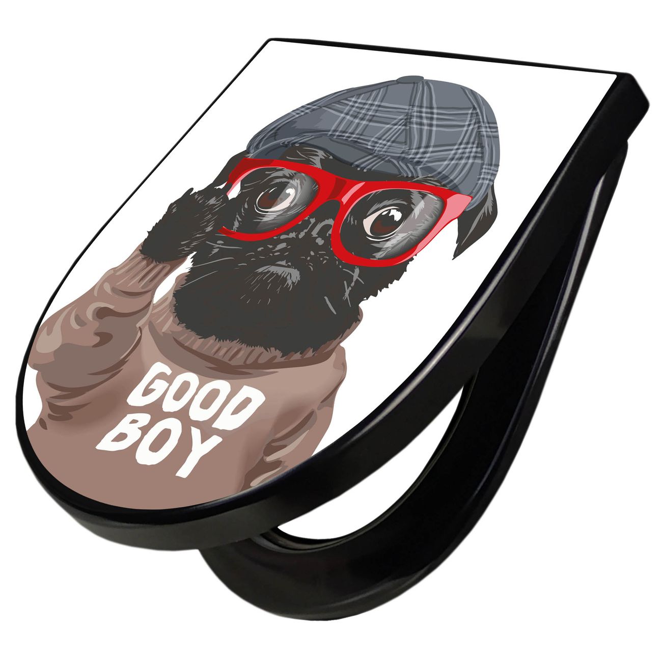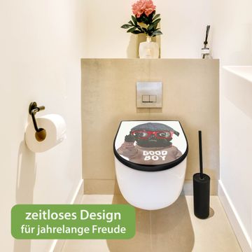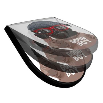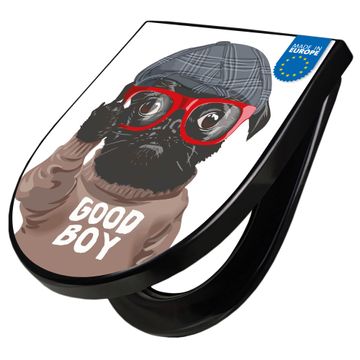 WC Sitz D-Form Schwarz mit Absenkautomatik Motiv Lustiger Mops mit Brille
