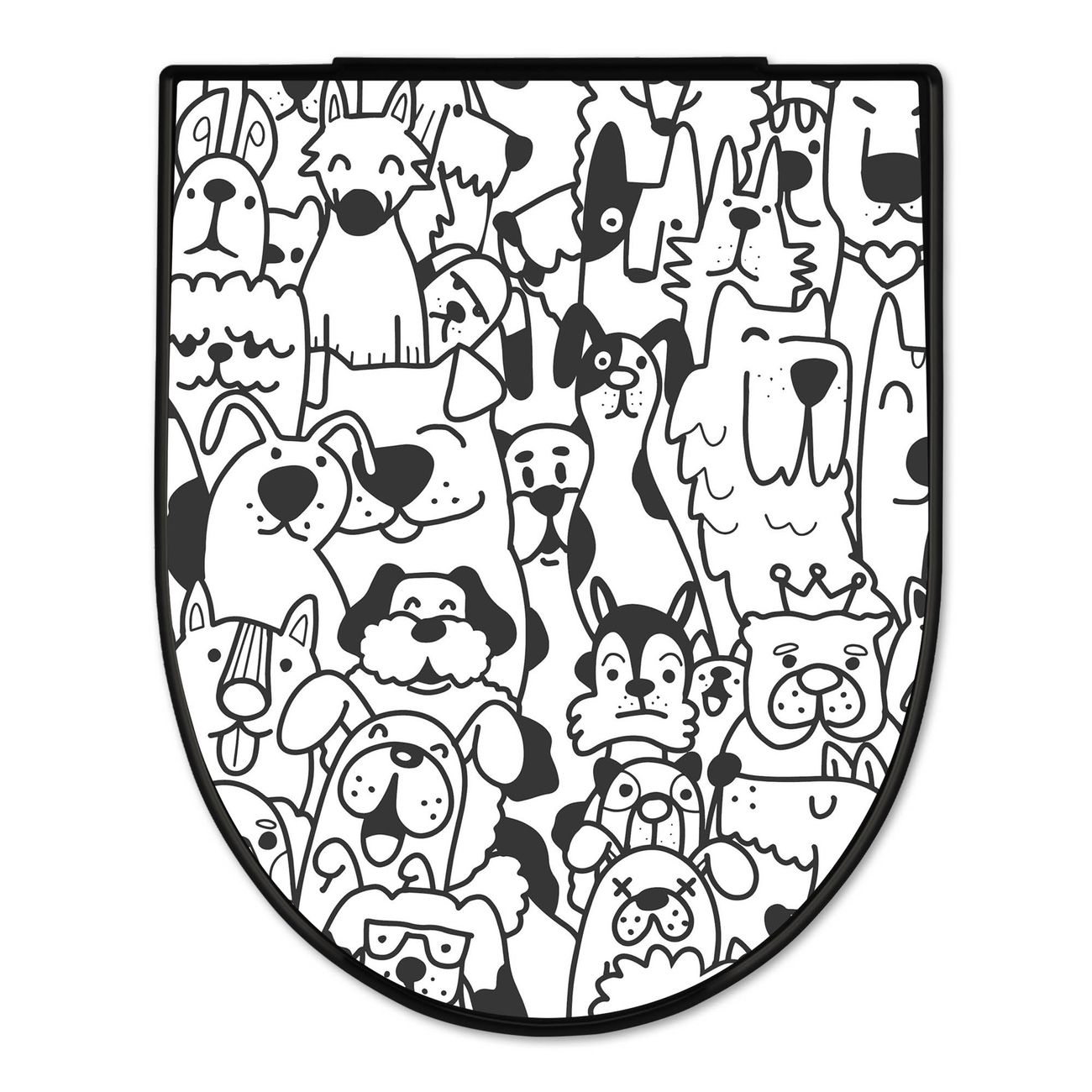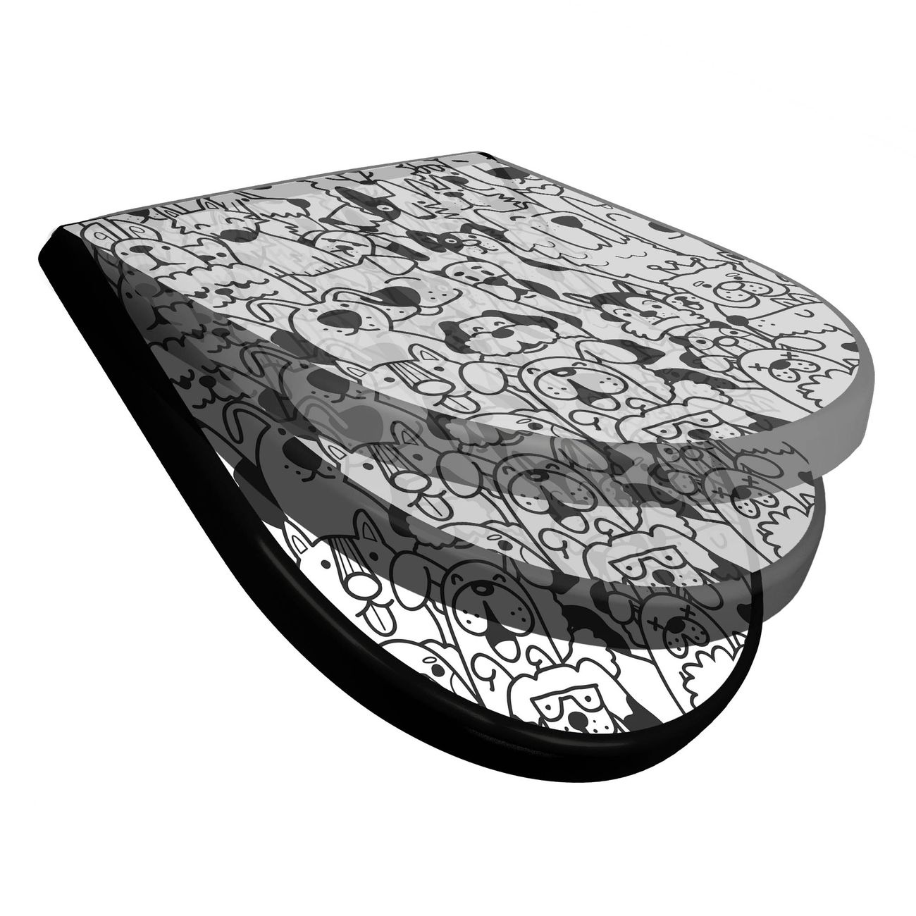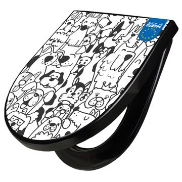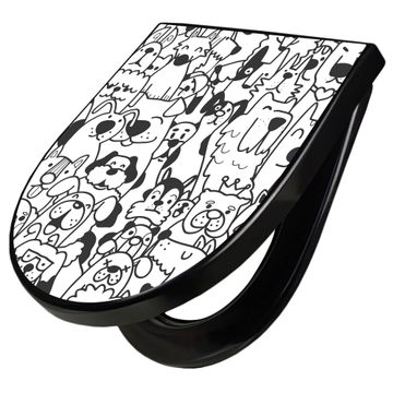 WC Sitz D-Form Schwarz mit Absenkautomatik Motiv Lustiges Hundemuster