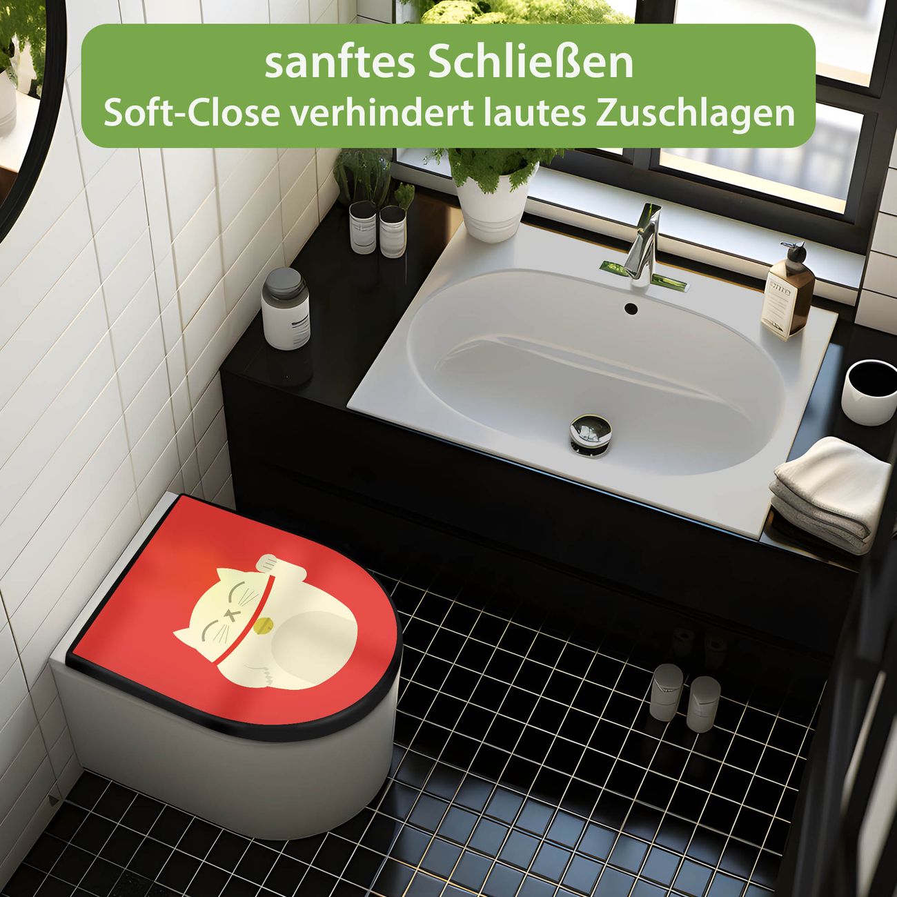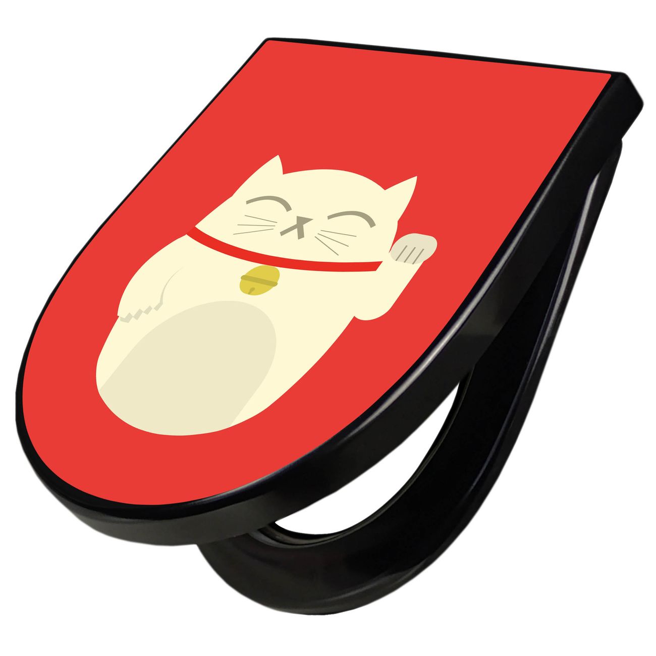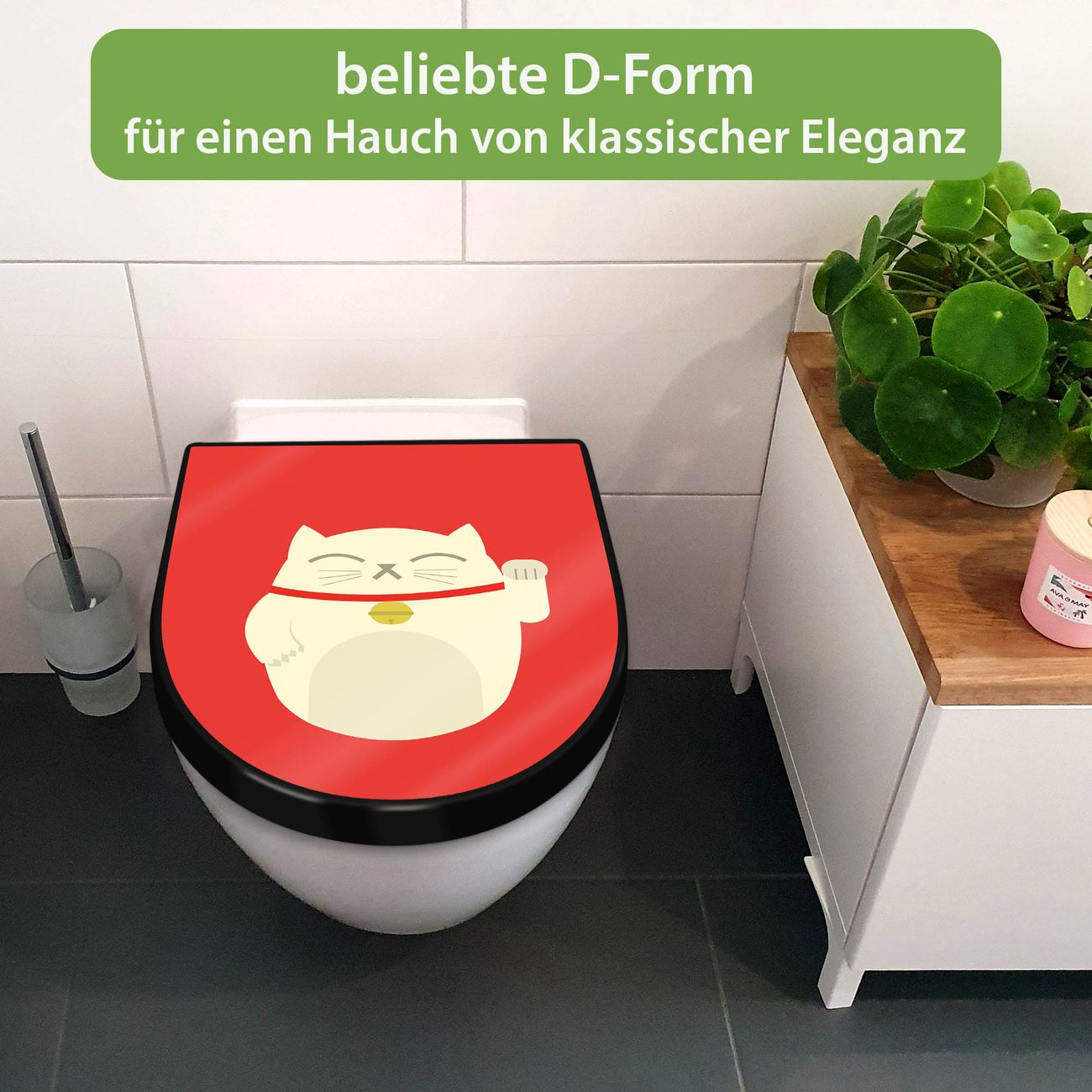 WC Sitz D-Form Schwarz mit Absenkautomatik Motiv Manekineko