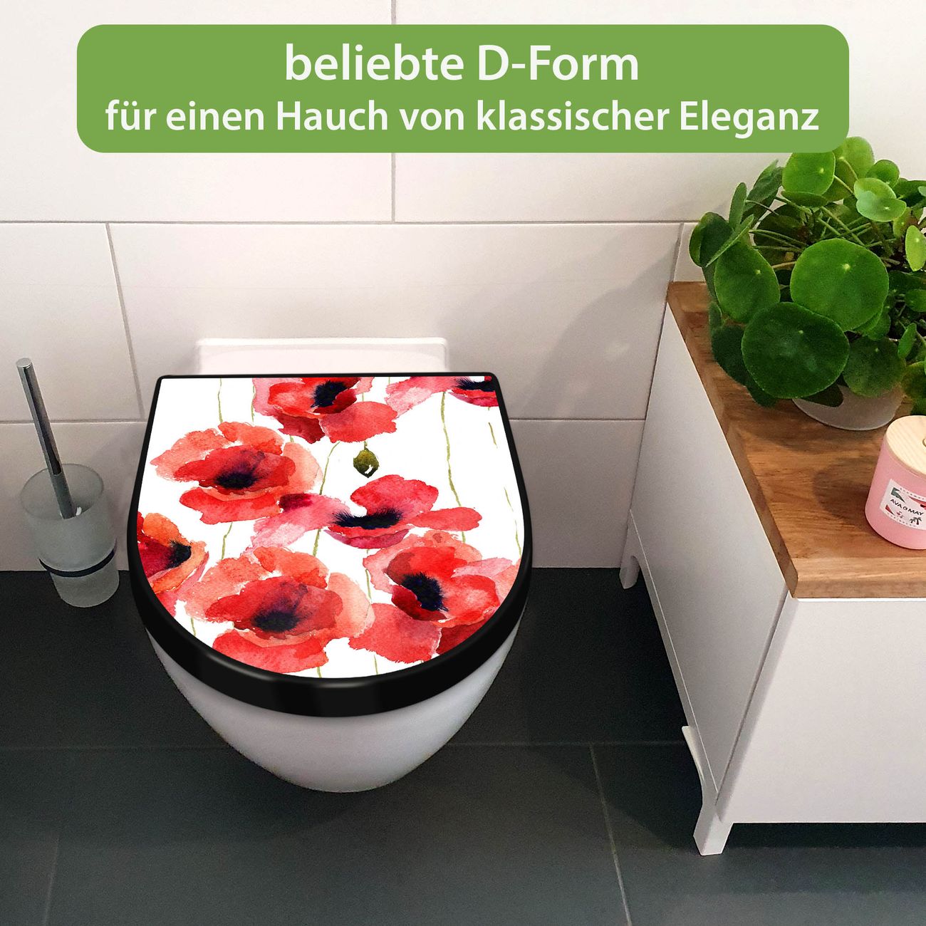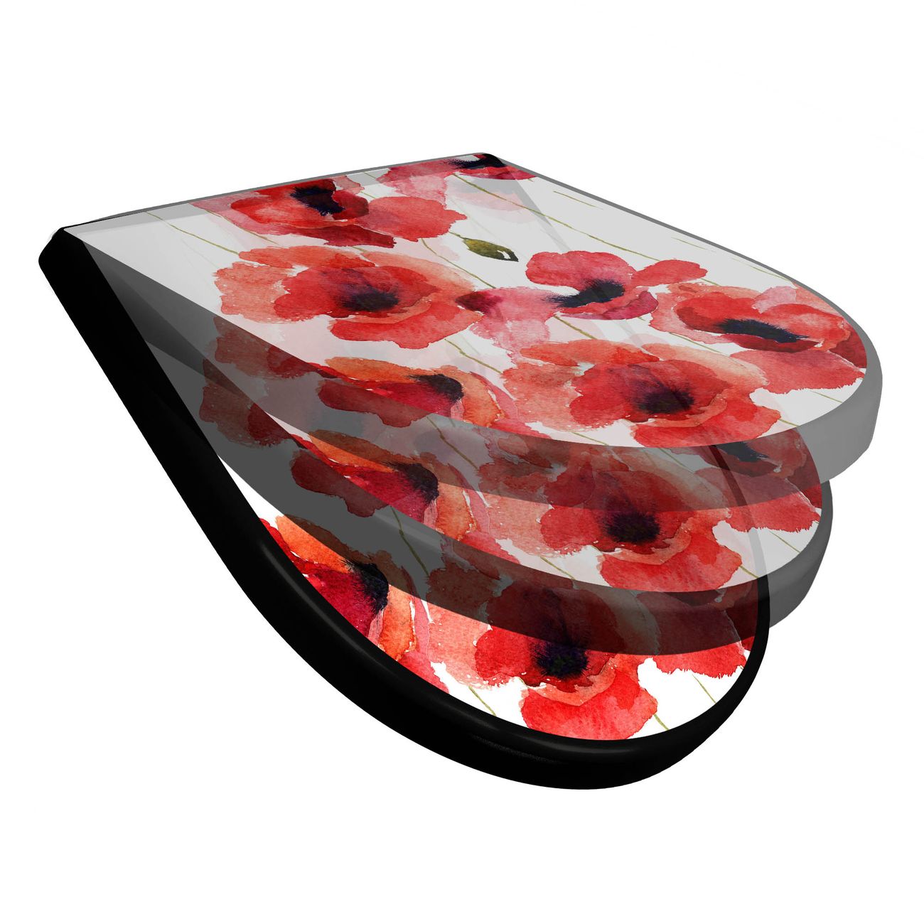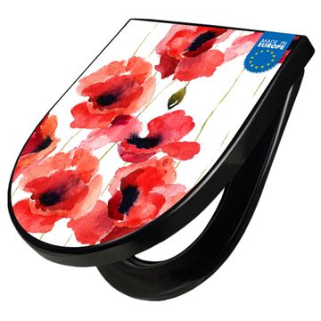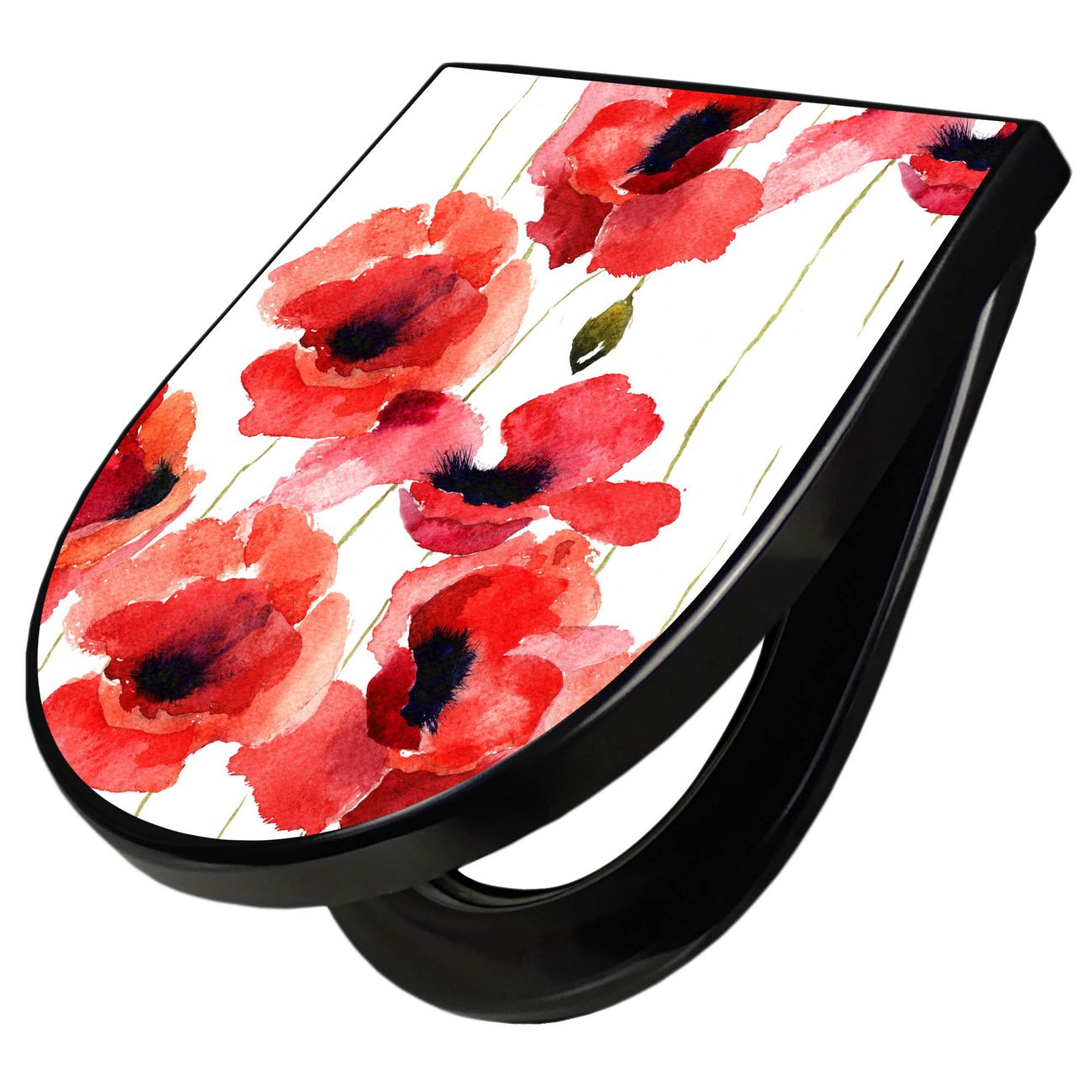 WC Sitz D-Form Schwarz mit Absenkautomatik Motiv Mohn Aquarell