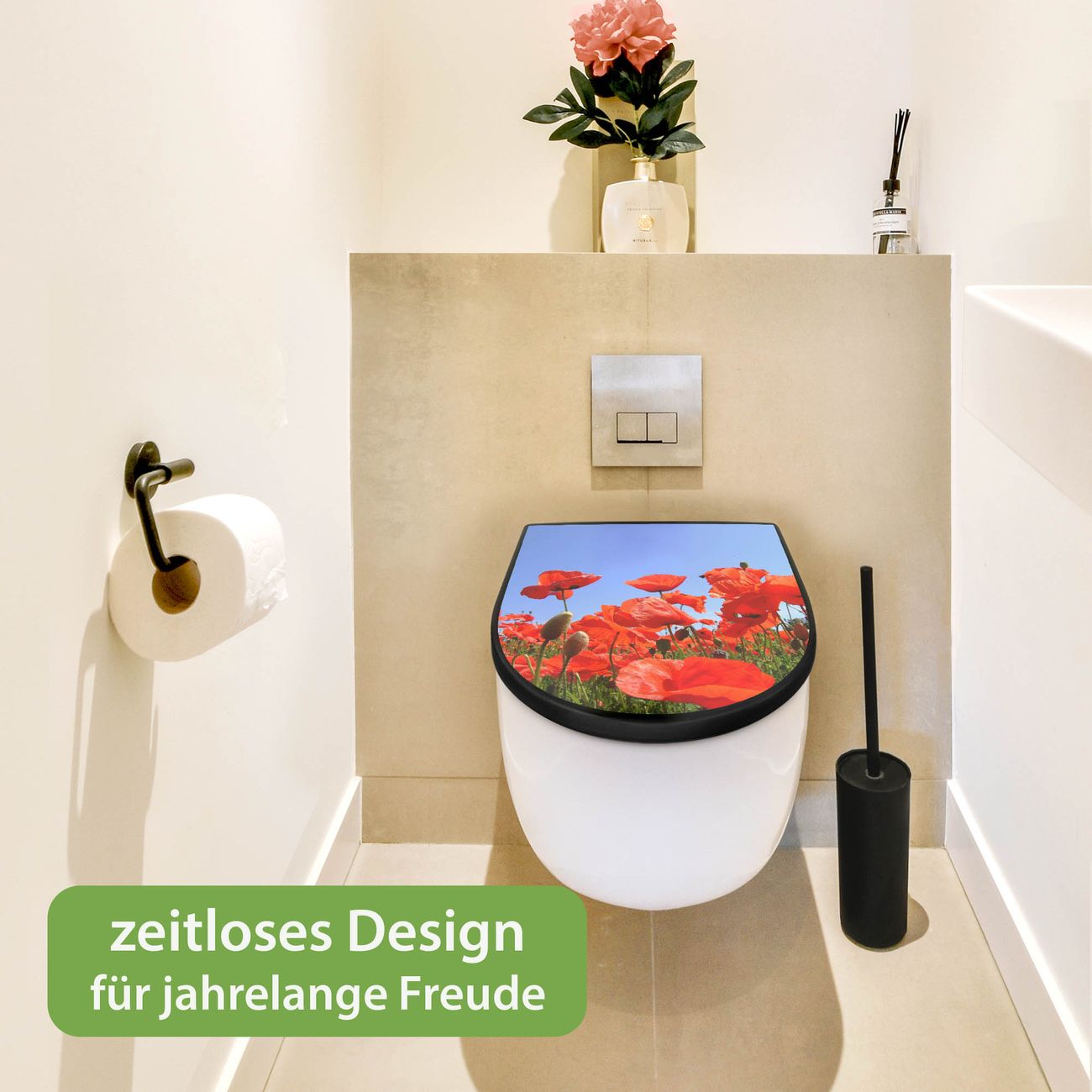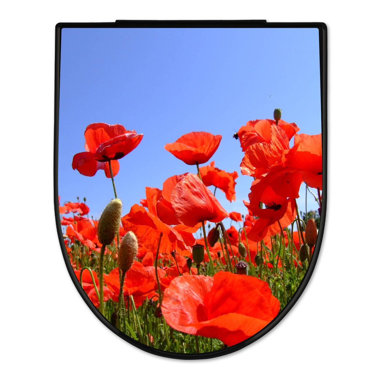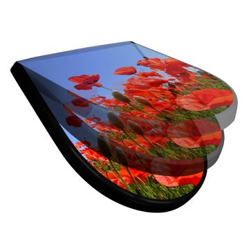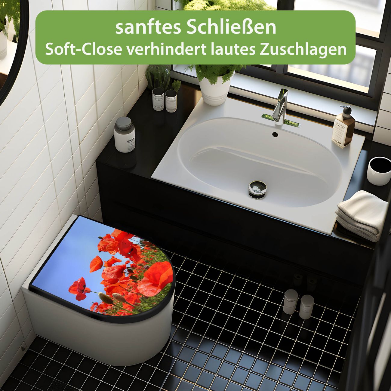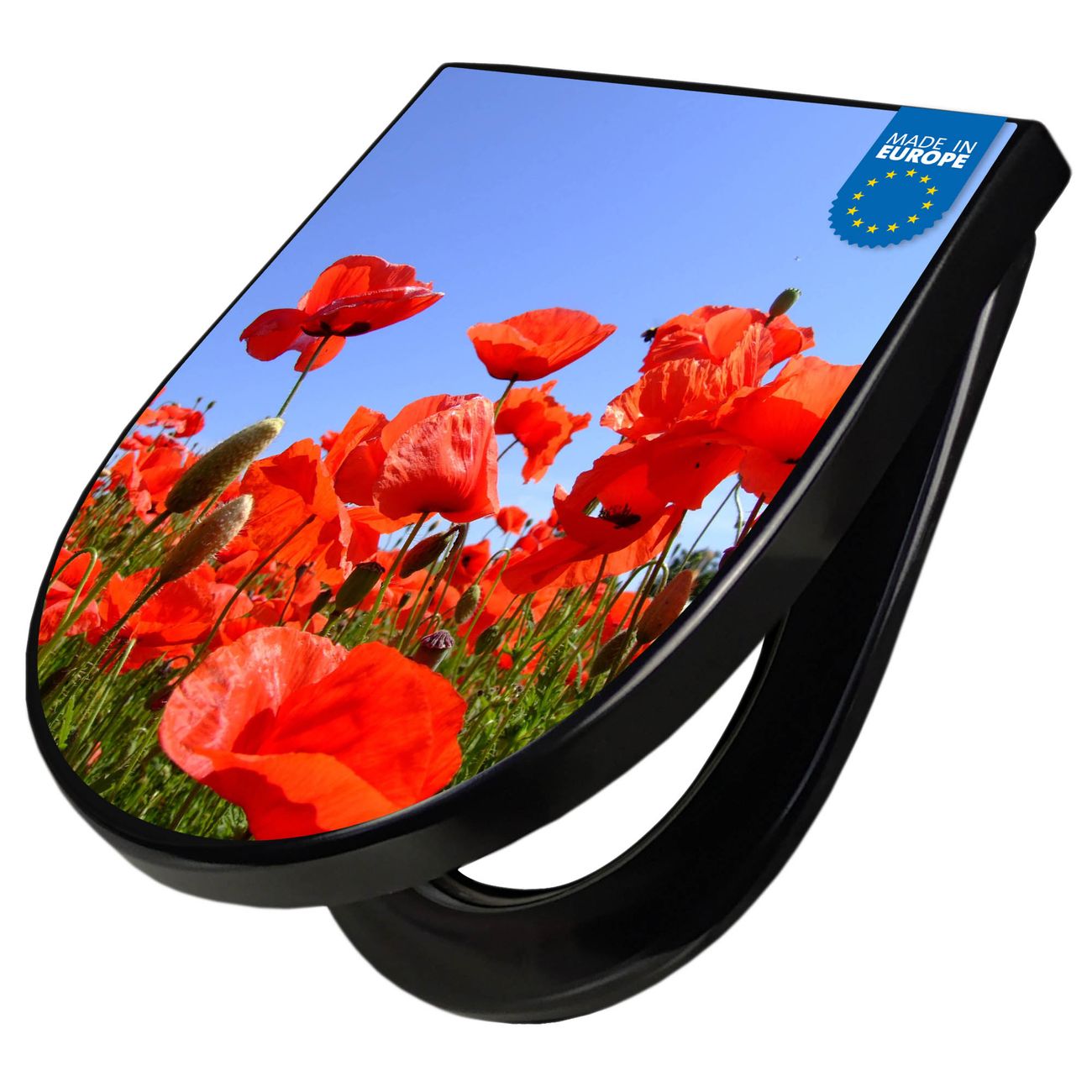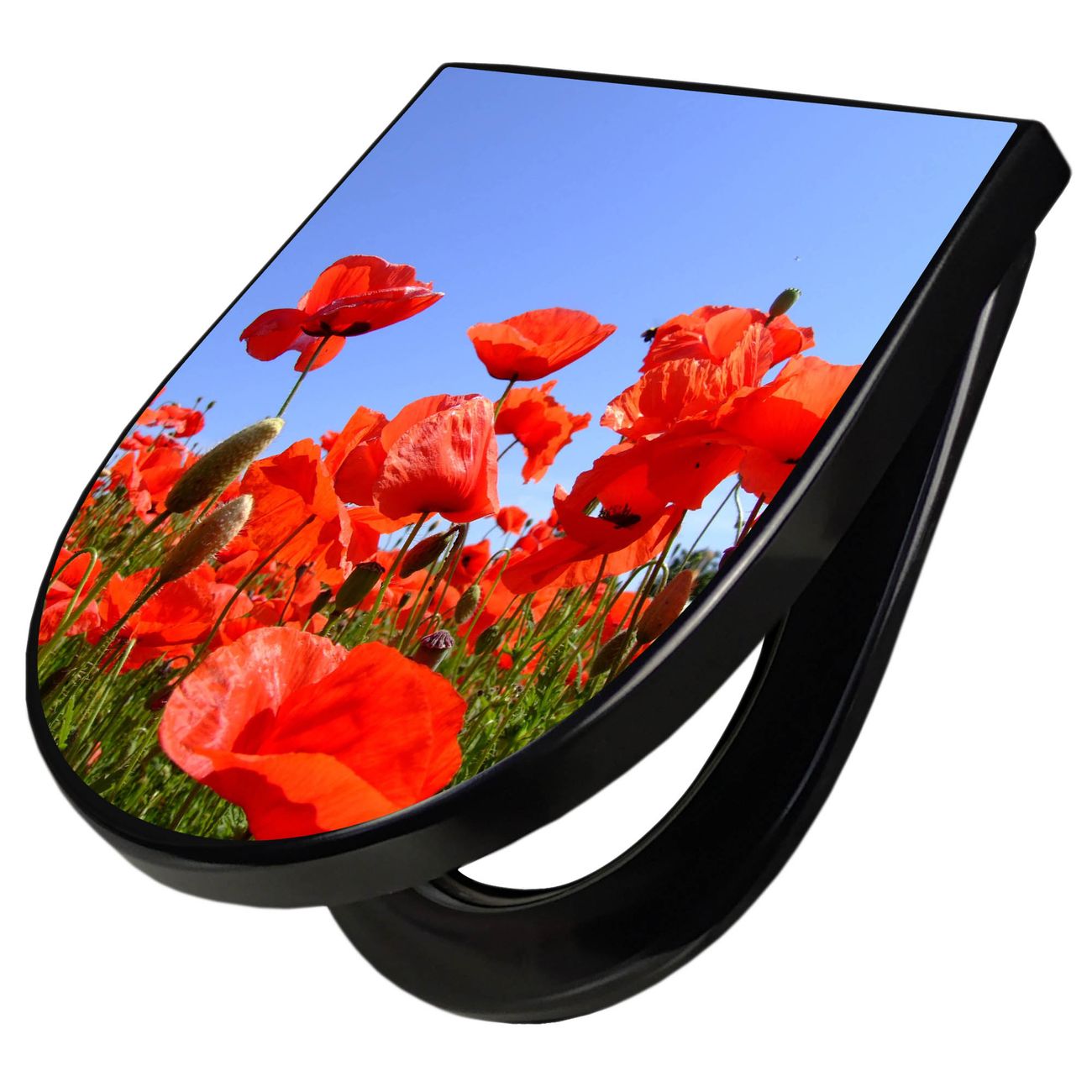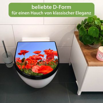 WC Sitz D-Form Schwarz mit Absenkautomatik Motiv Mohnblumen