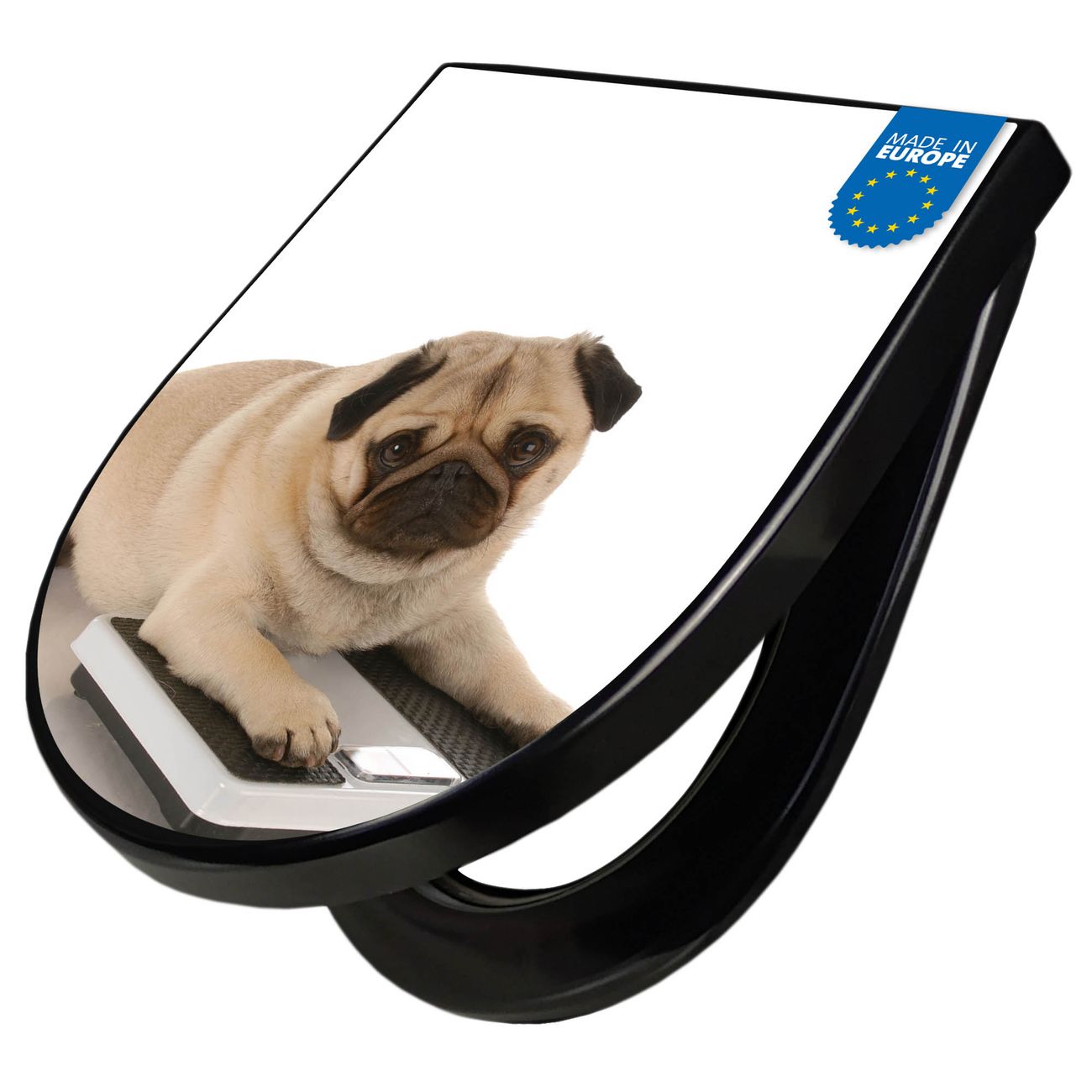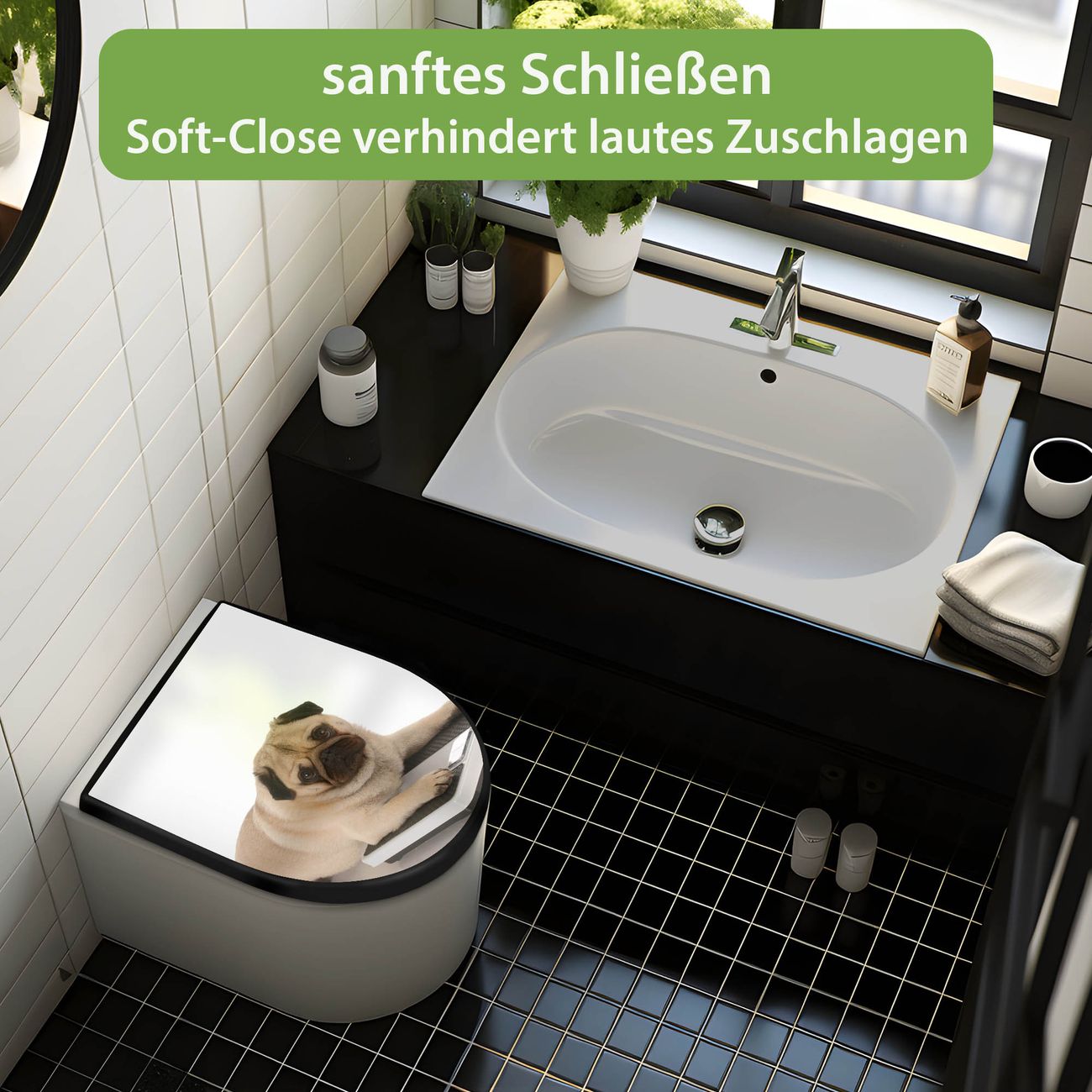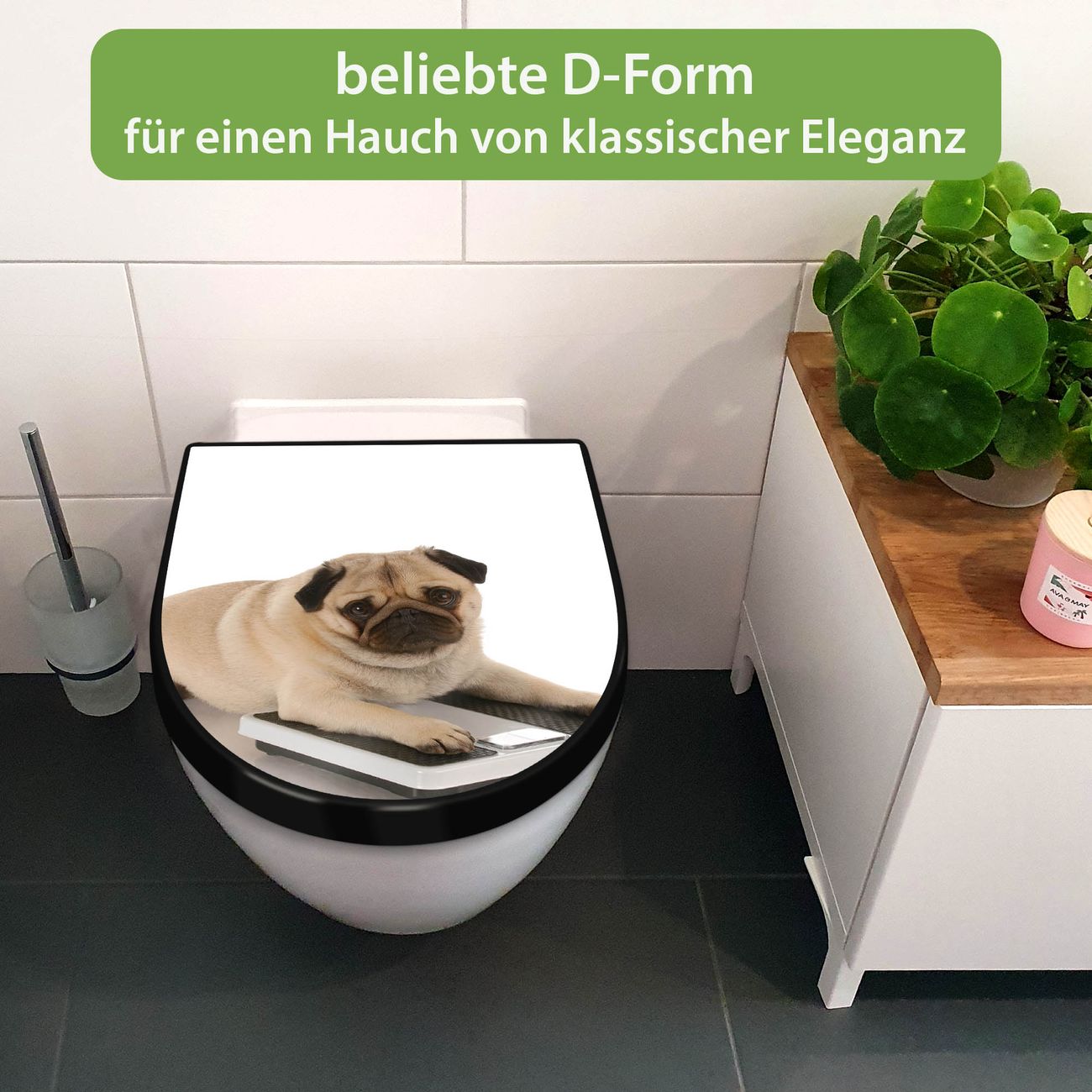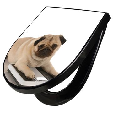 WC Sitz D-Form Schwarz mit Absenkautomatik Motiv Mops