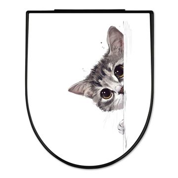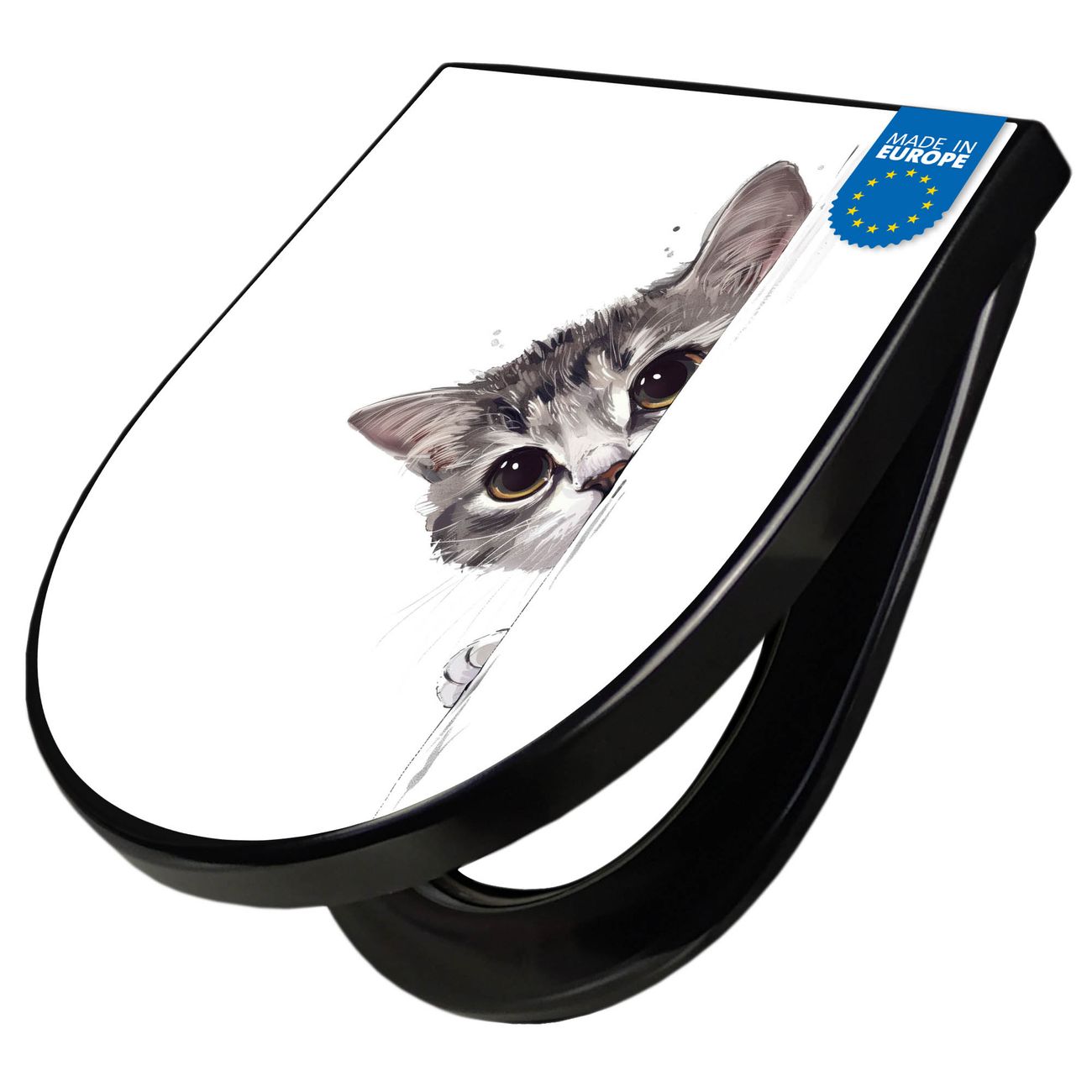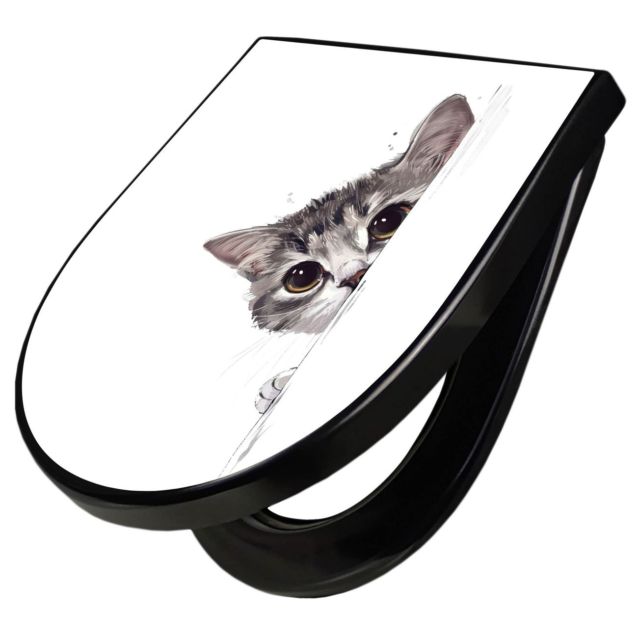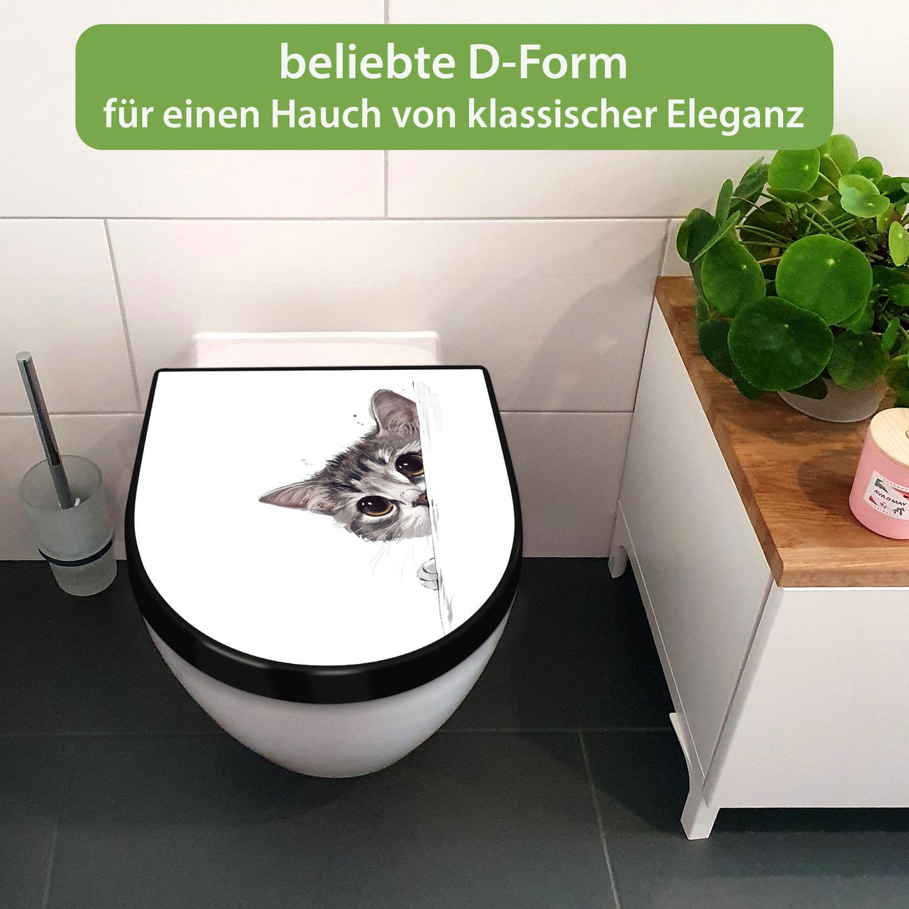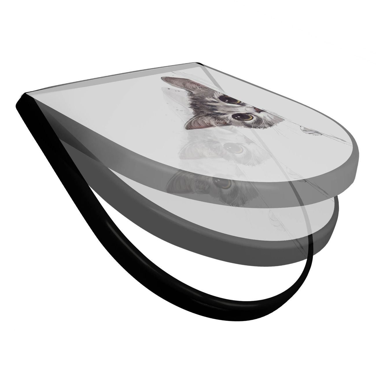 WC Sitz D-Form Schwarz mit Absenkautomatik Motiv Neugierige Katze