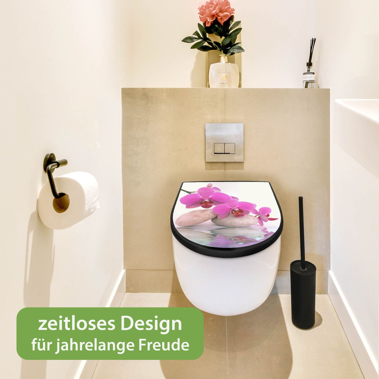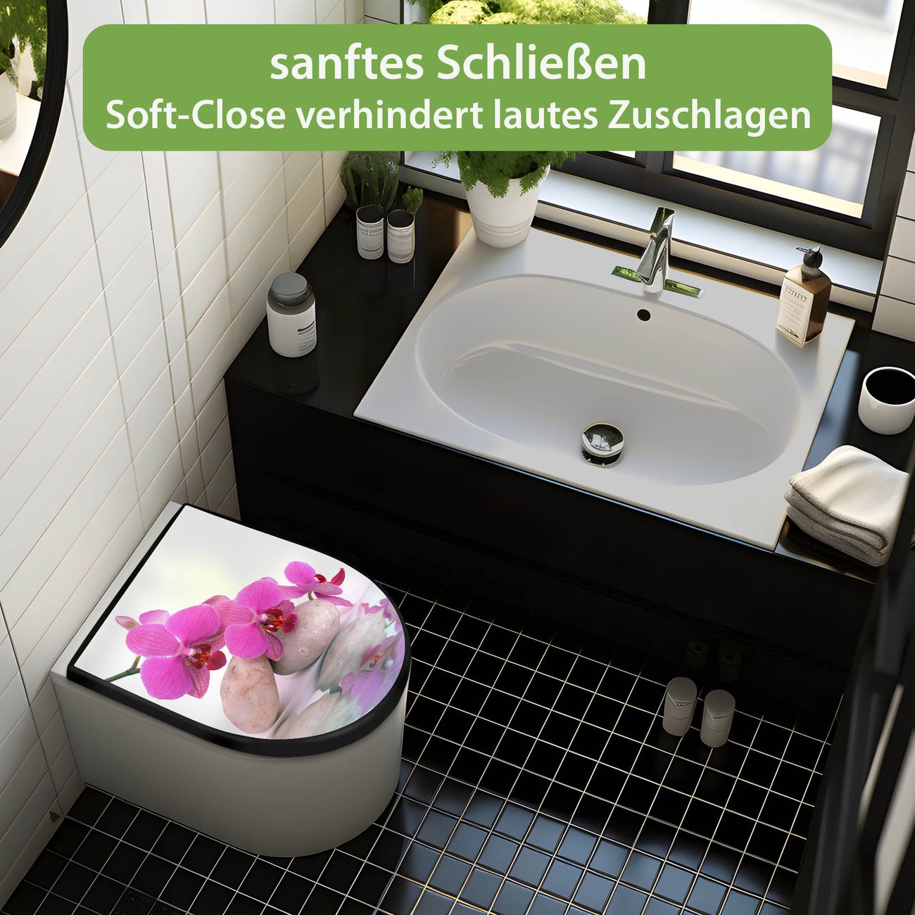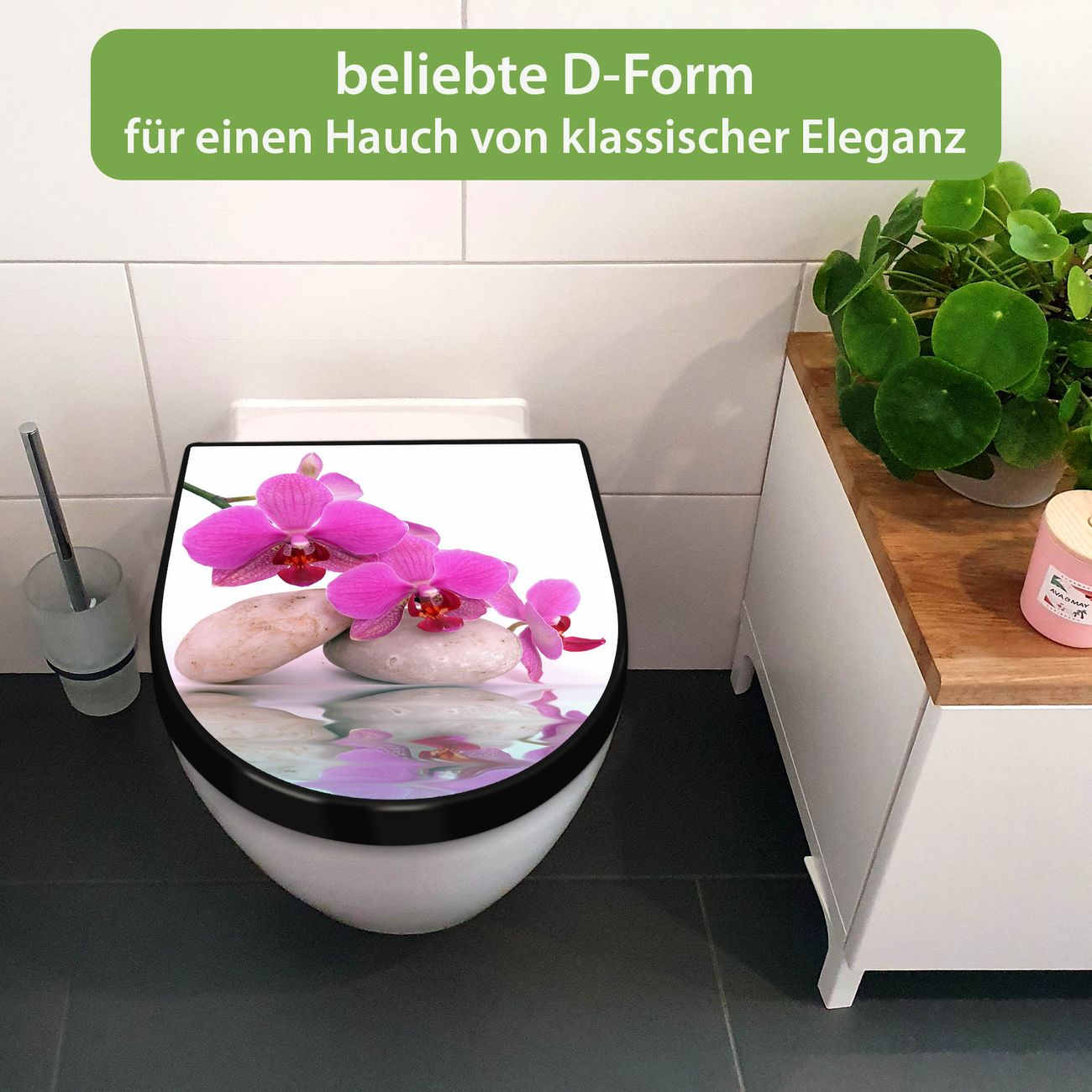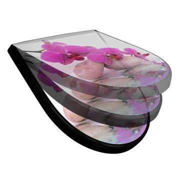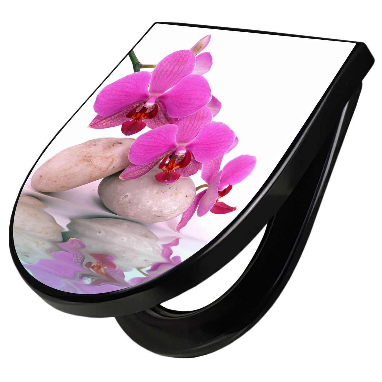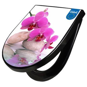 WC Sitz D-Form Schwarz mit Absenkautomatik Motiv Orchidee