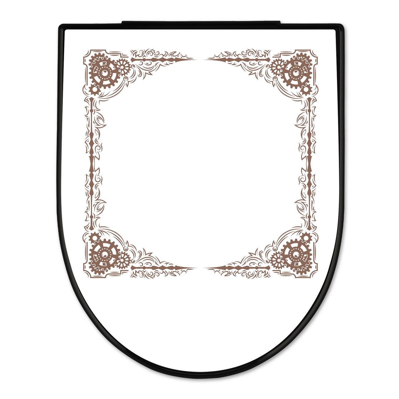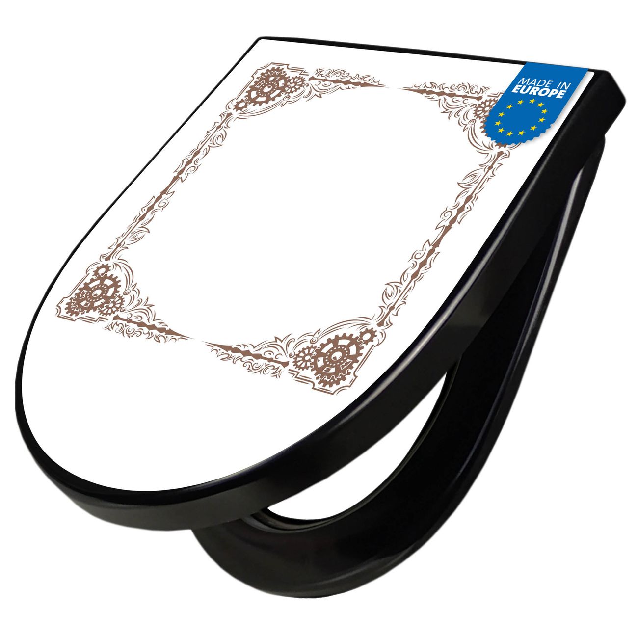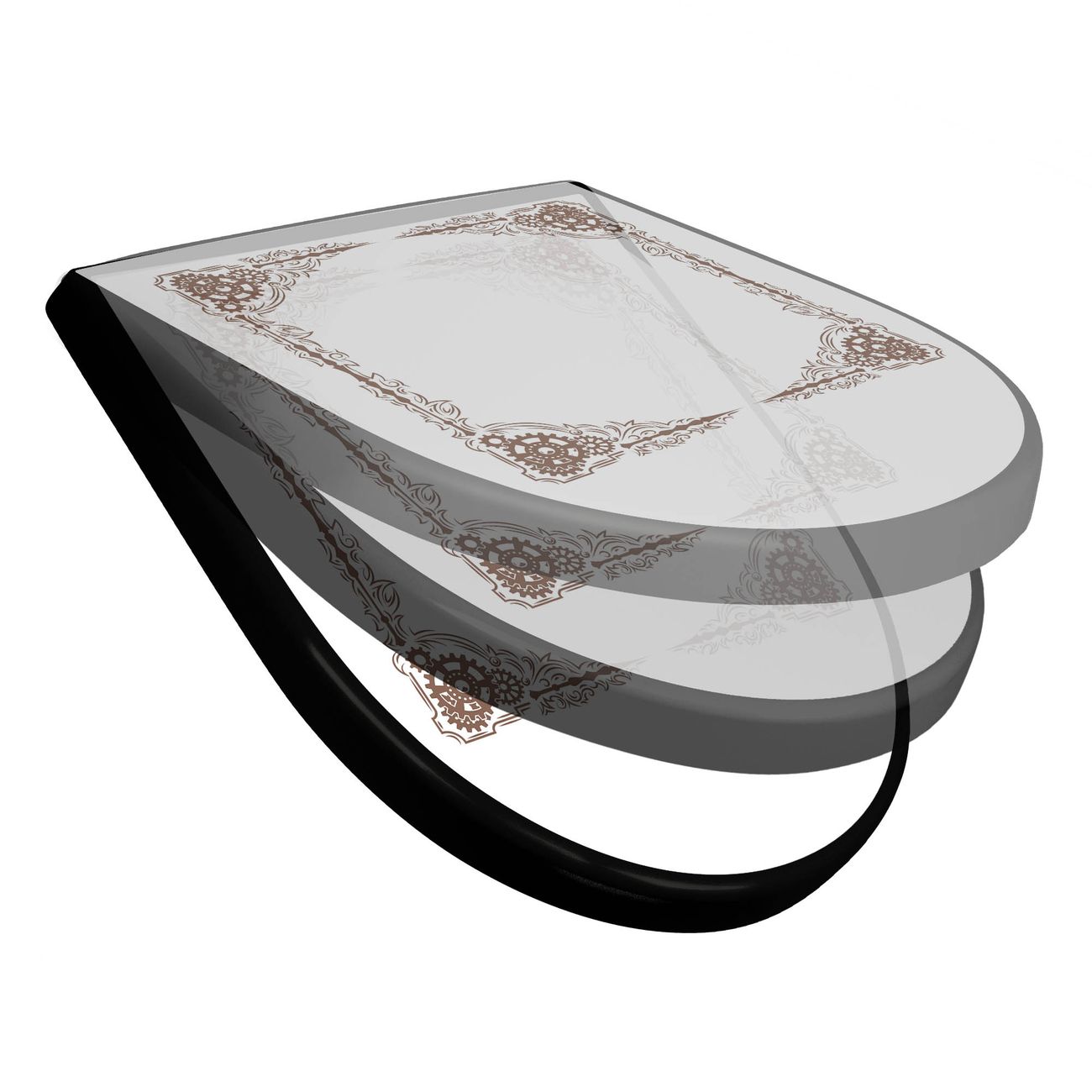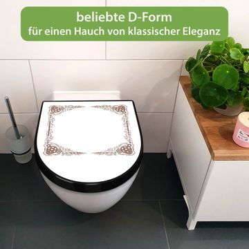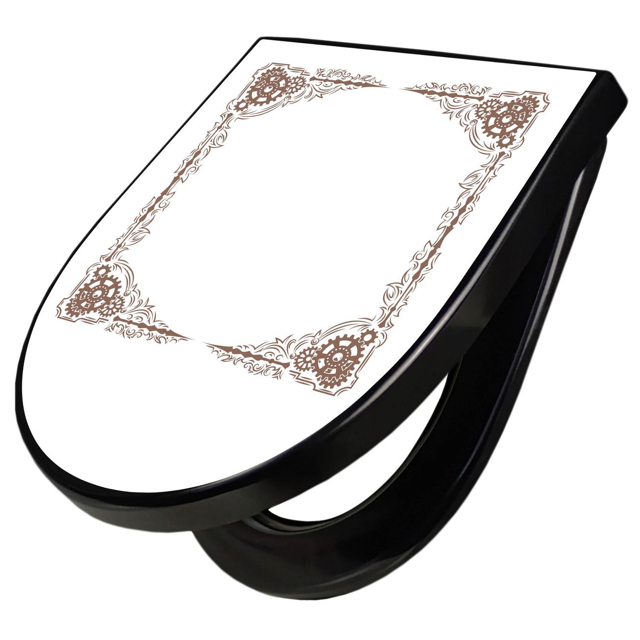 WC Sitz D-Form Schwarz mit Absenkautomatik Motiv Ornamentaler Zahnräderrahmen