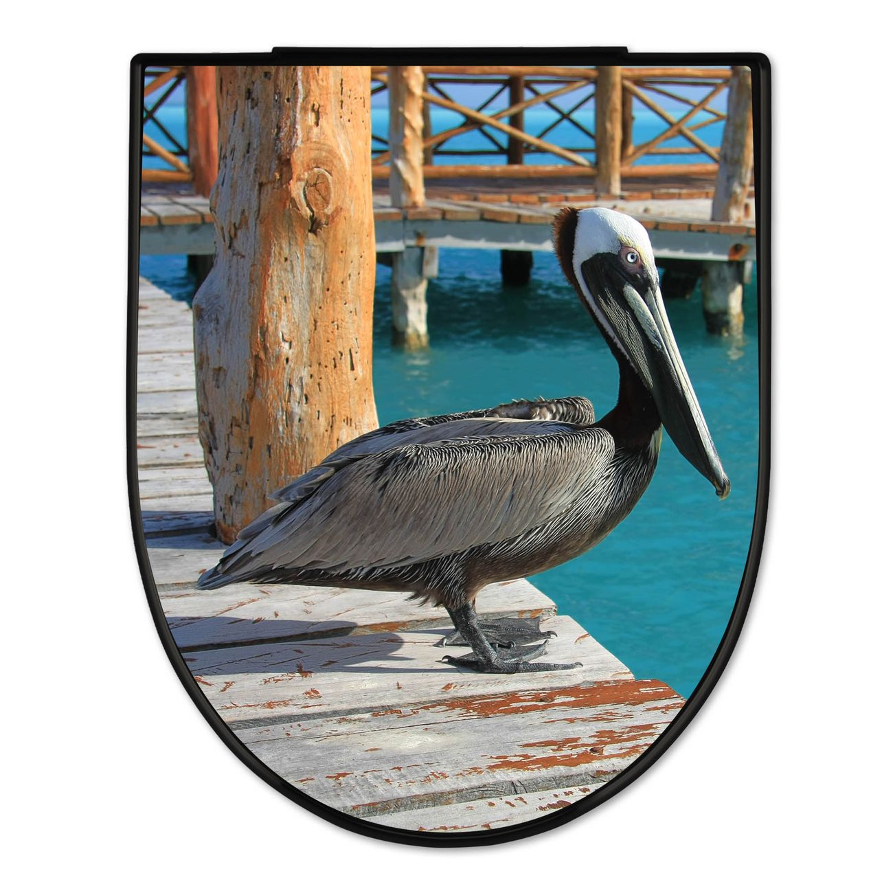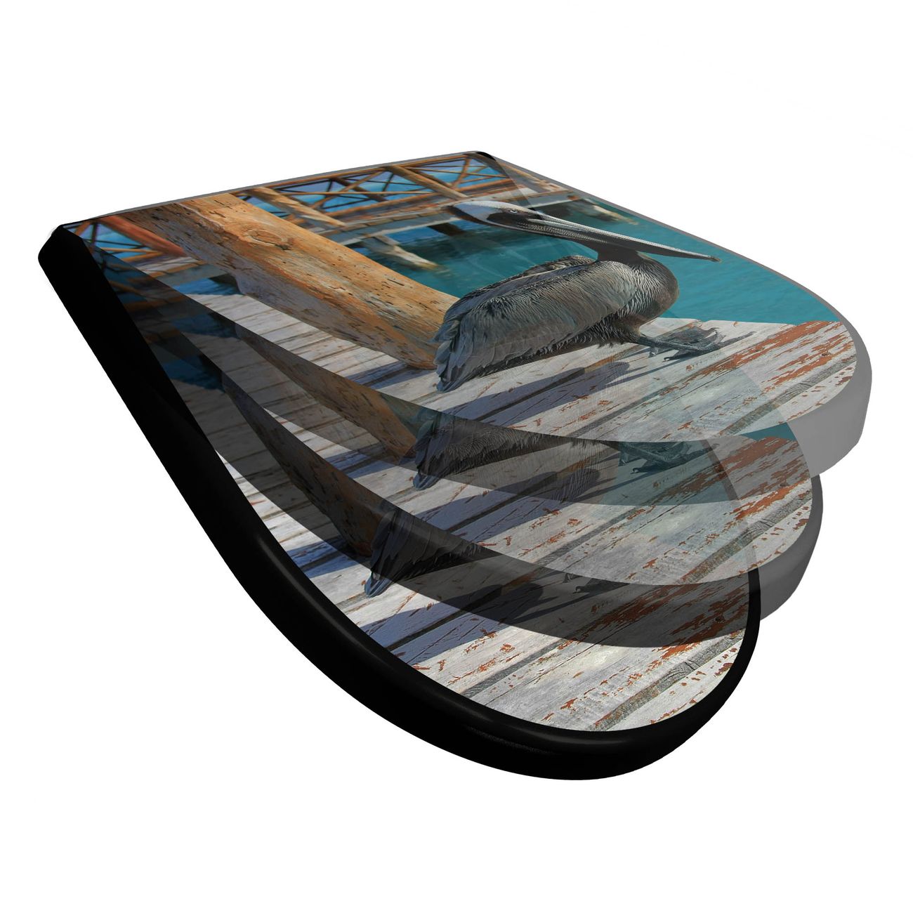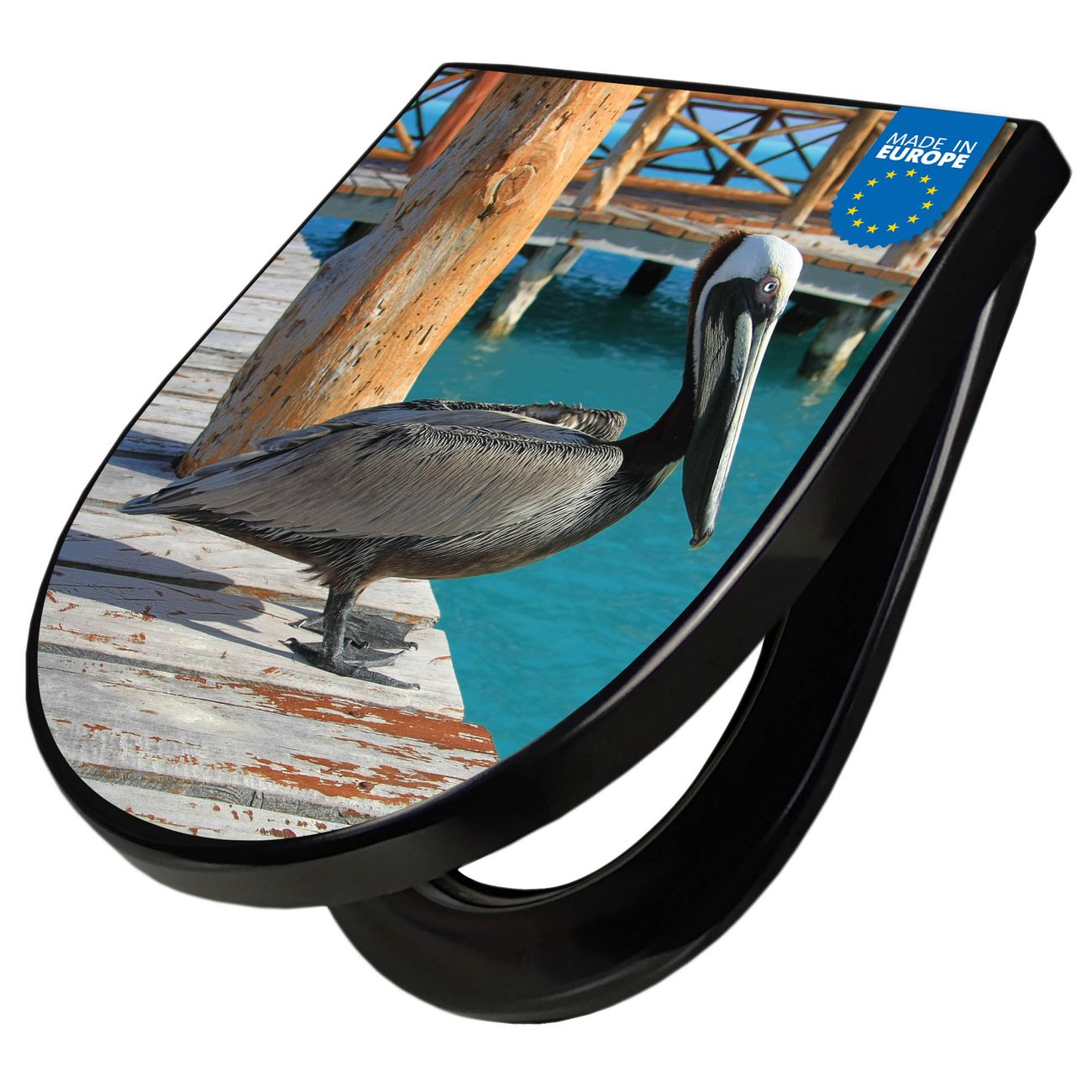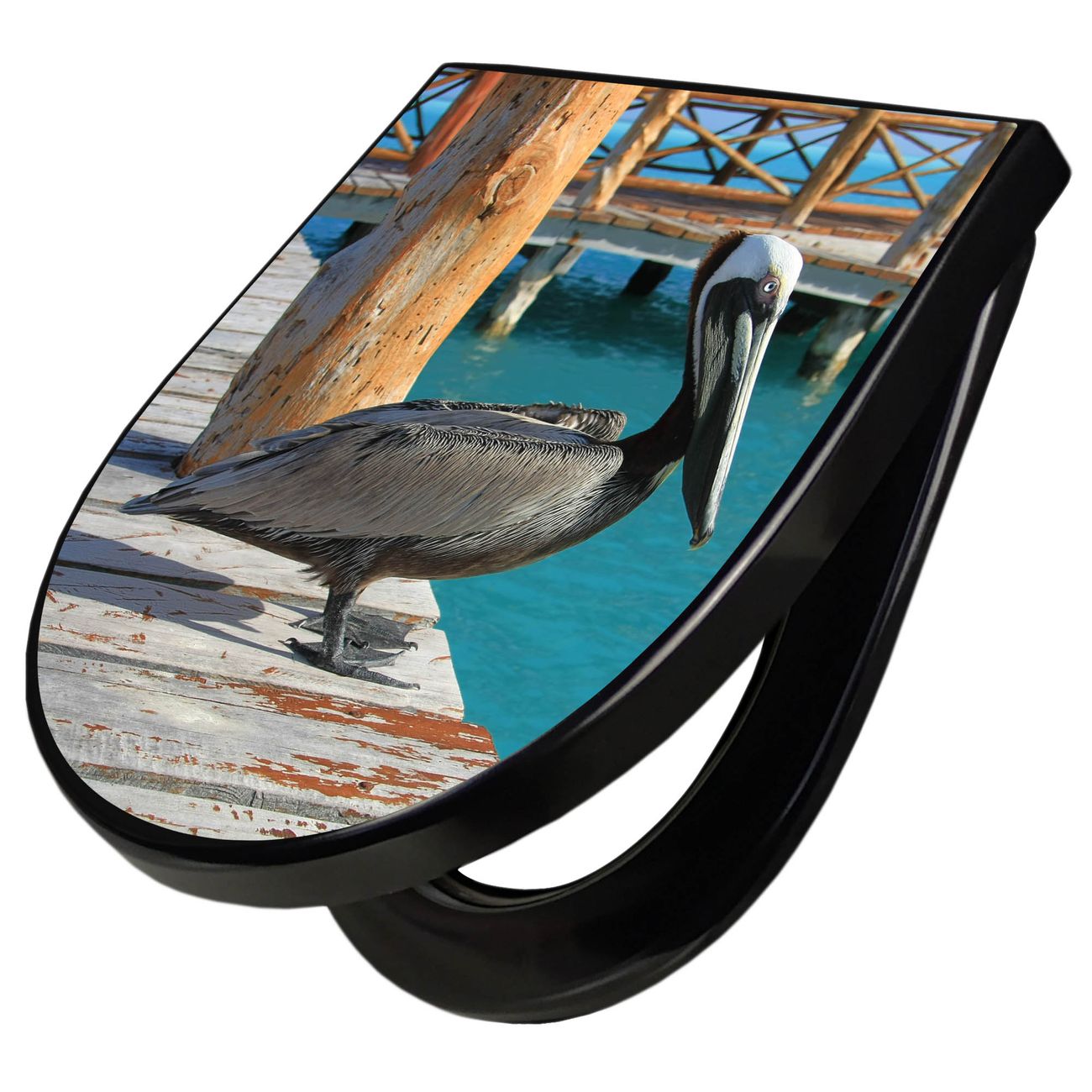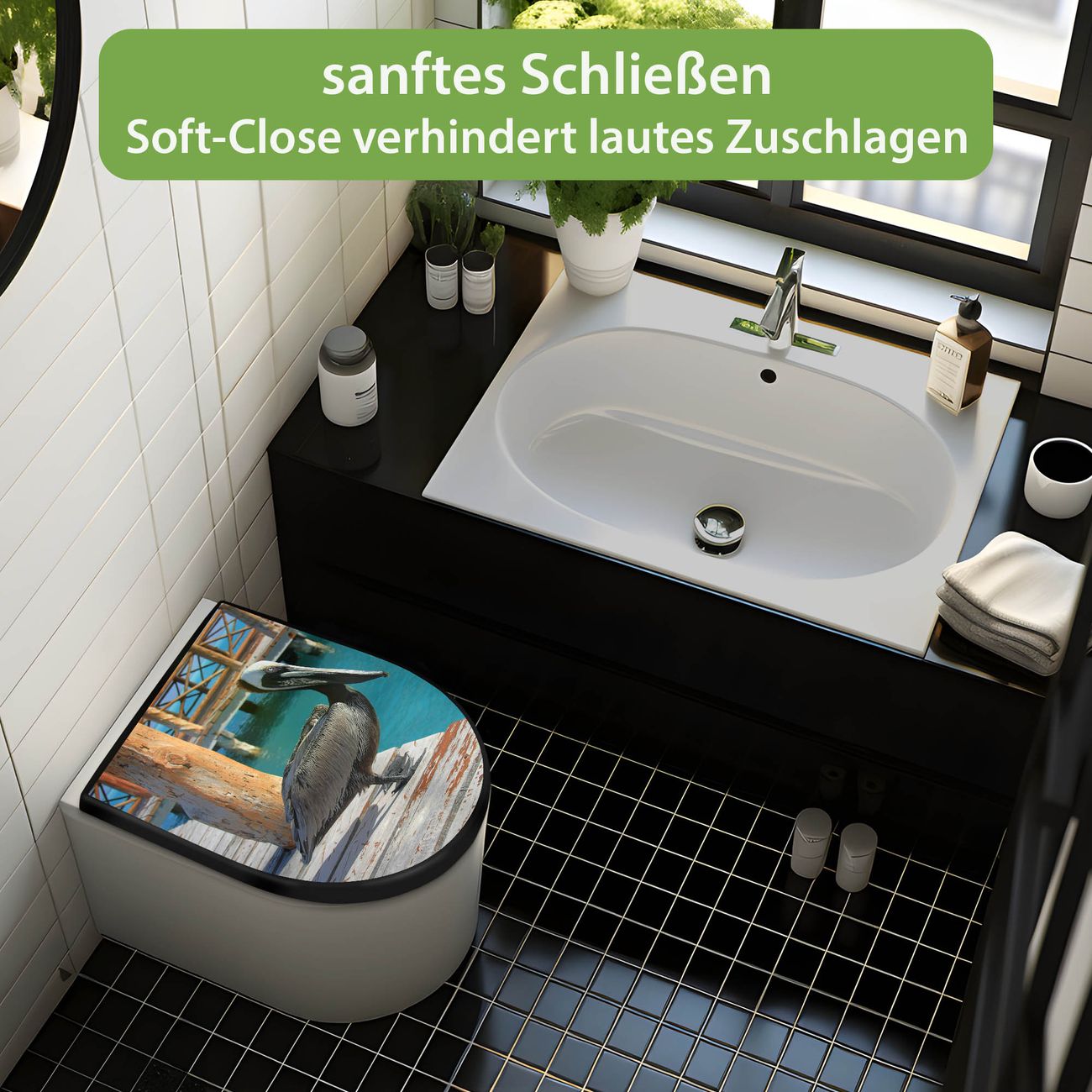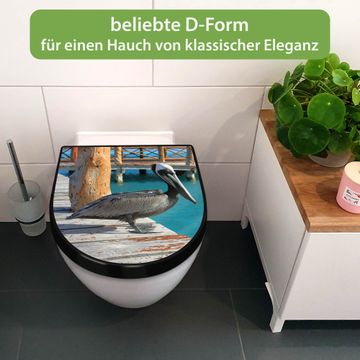 WC Sitz D-Form Schwarz mit Absenkautomatik Motiv Pelikan