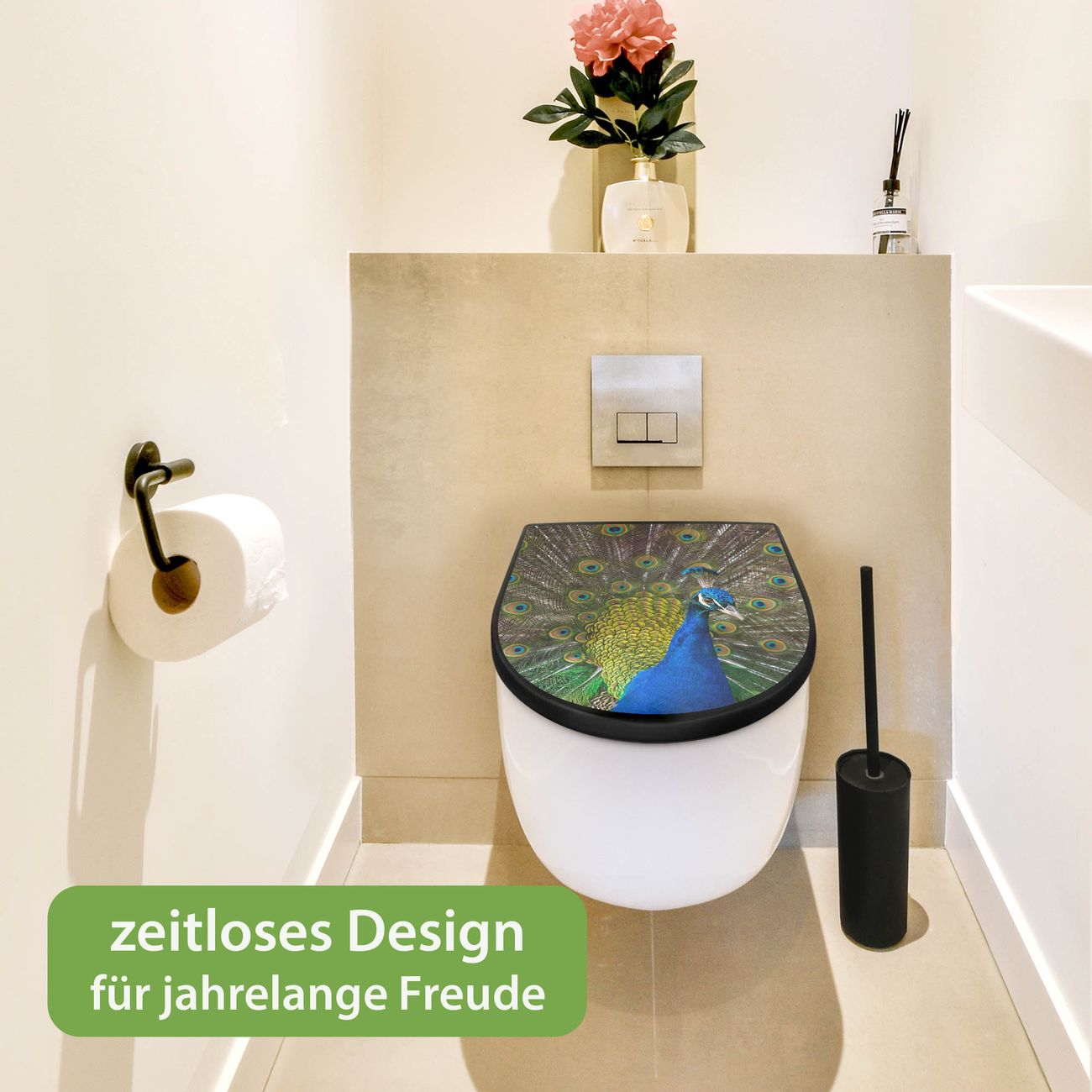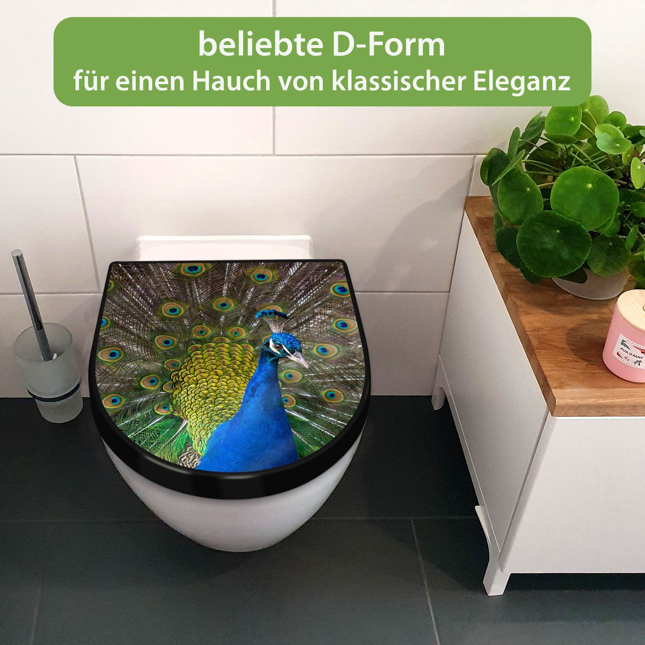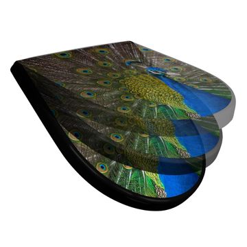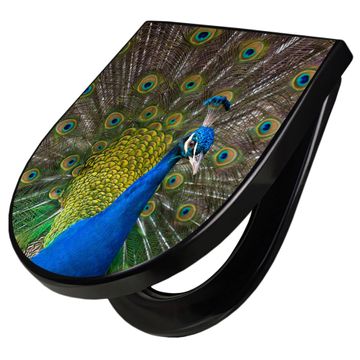 WC Sitz D-Form Schwarz mit Absenkautomatik Motiv Pfau