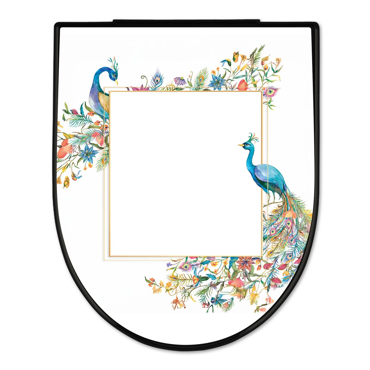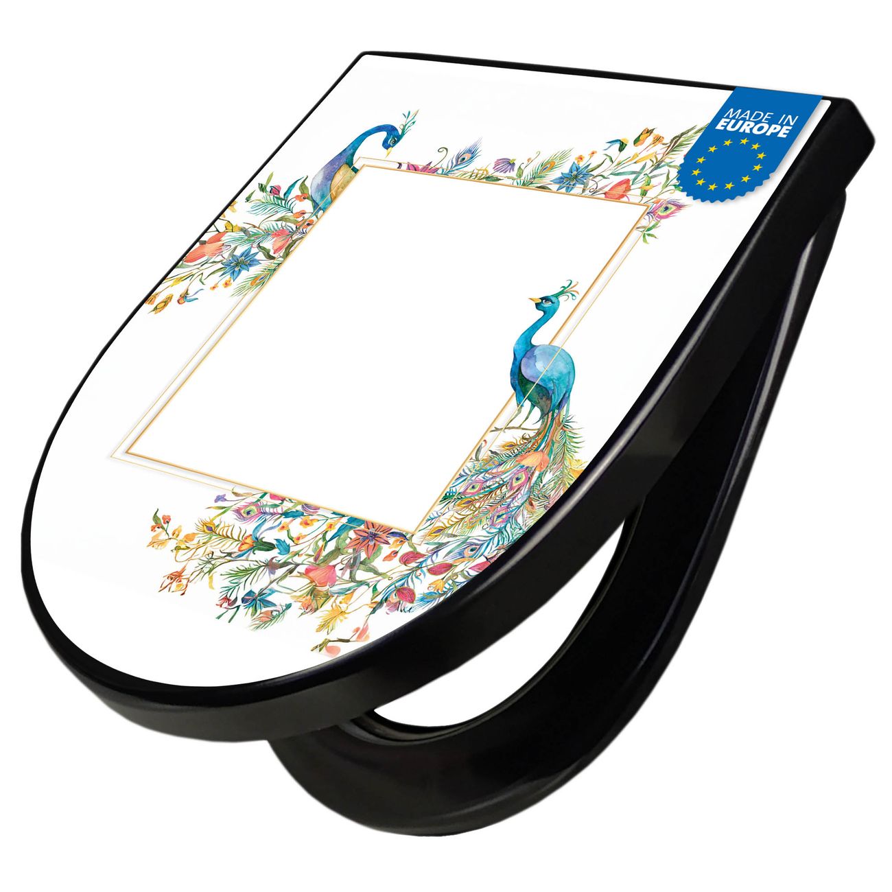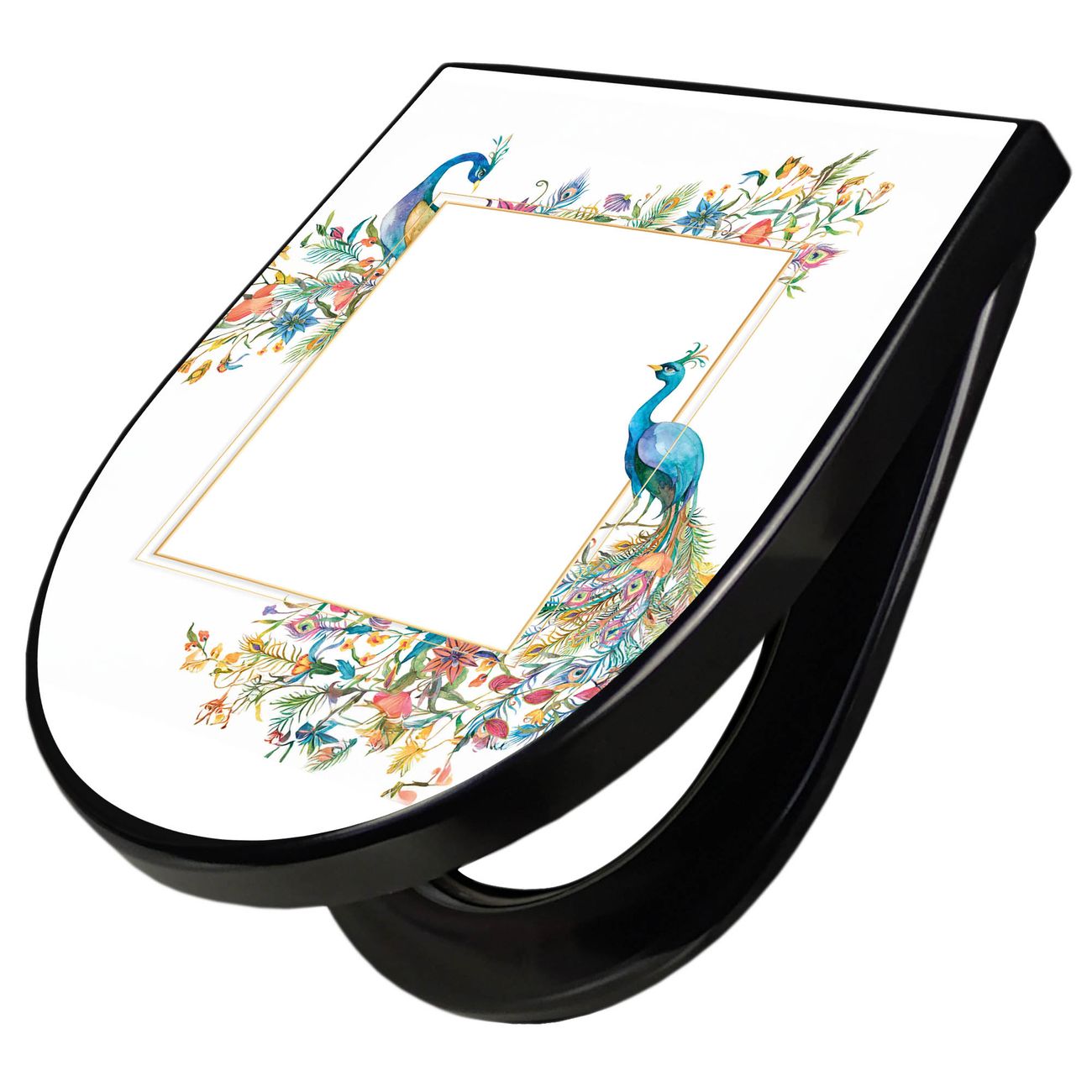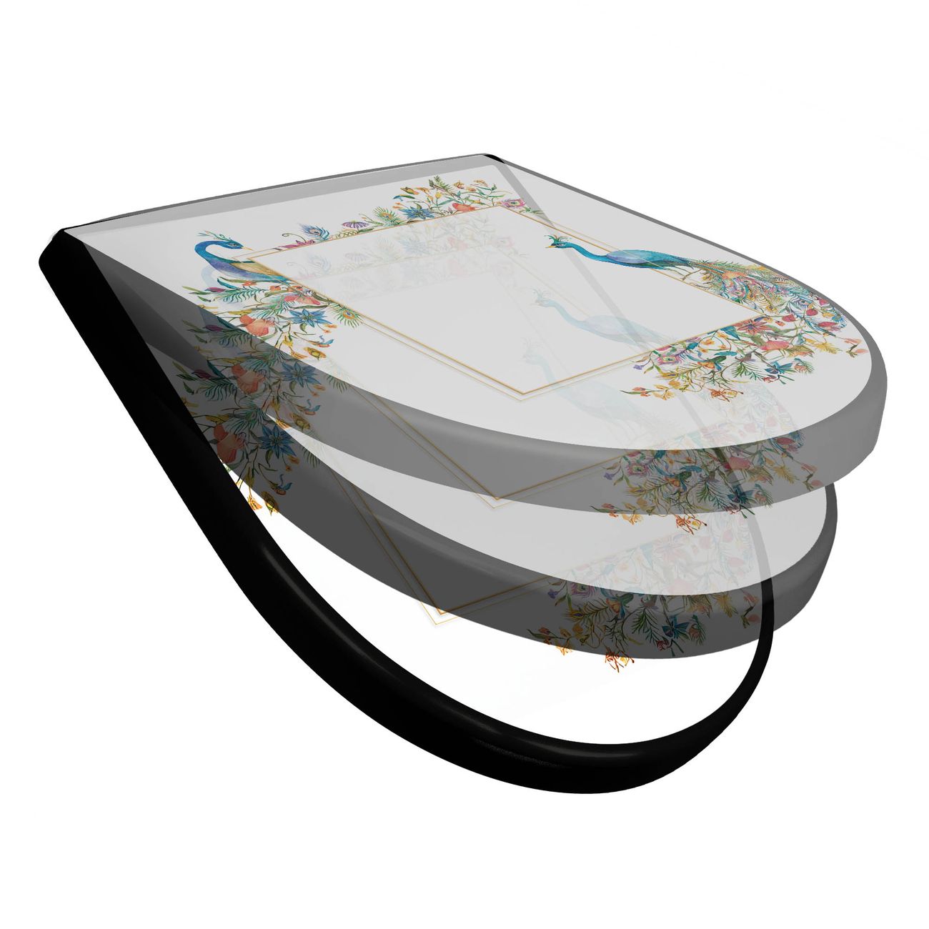 WC Sitz D-Form Schwarz mit Absenkautomatik Motiv Pfauenparadies