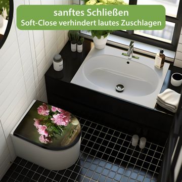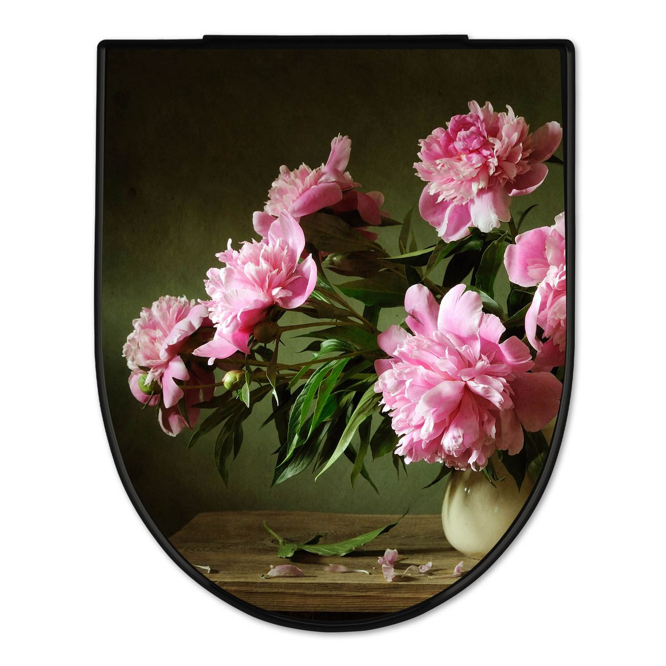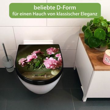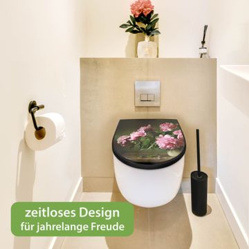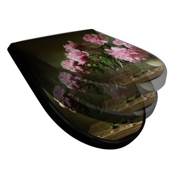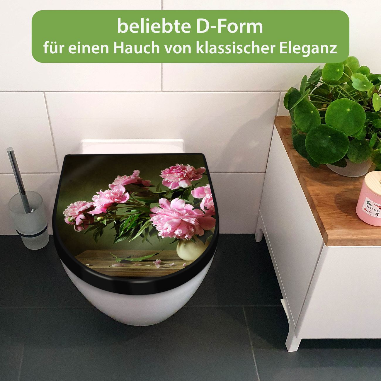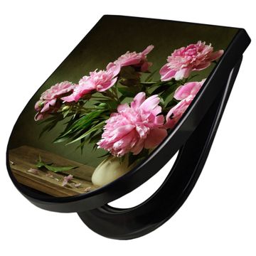 WC Sitz D-Form Schwarz mit Absenkautomatik Motiv Pinke Pfingstrosen