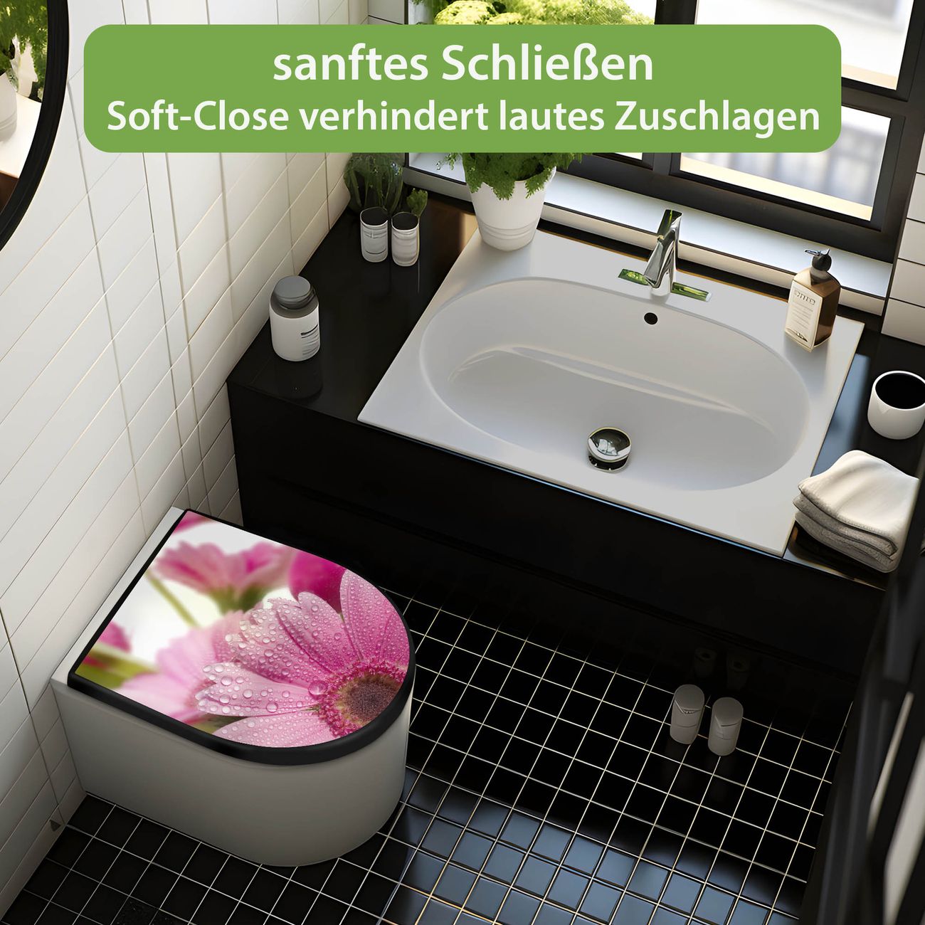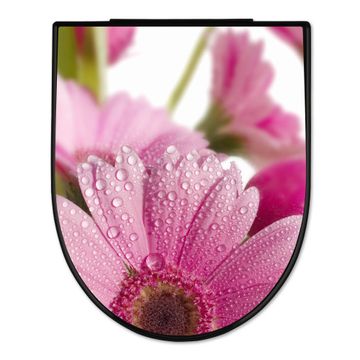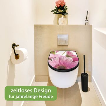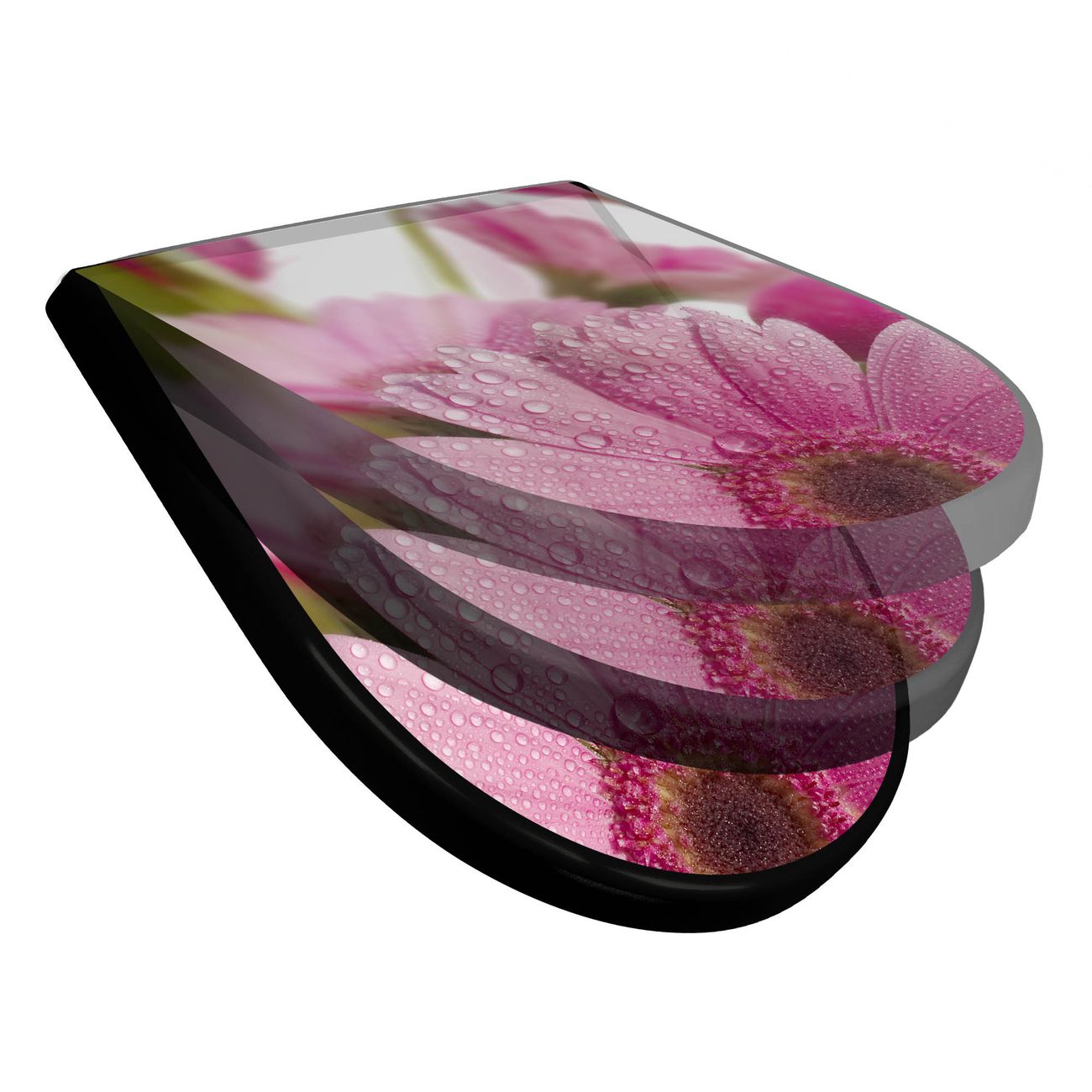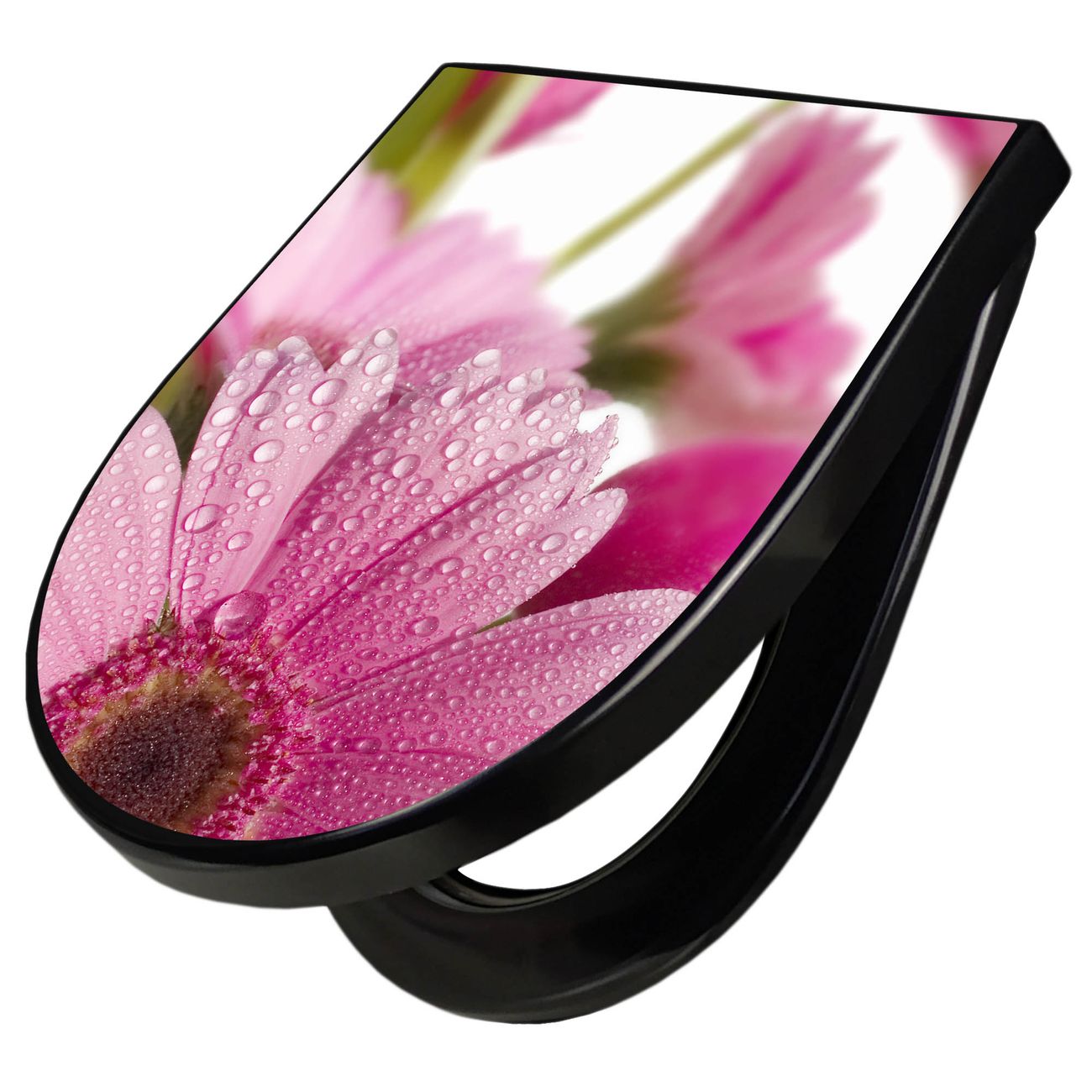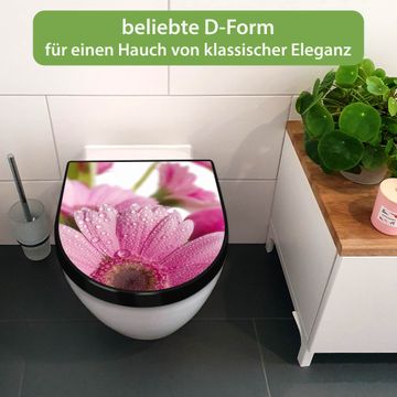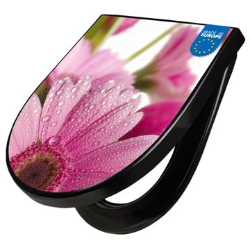 WC Sitz D-Form Schwarz mit Absenkautomatik Motiv Rosa Gerbera