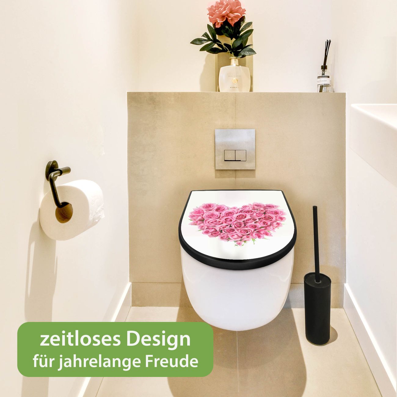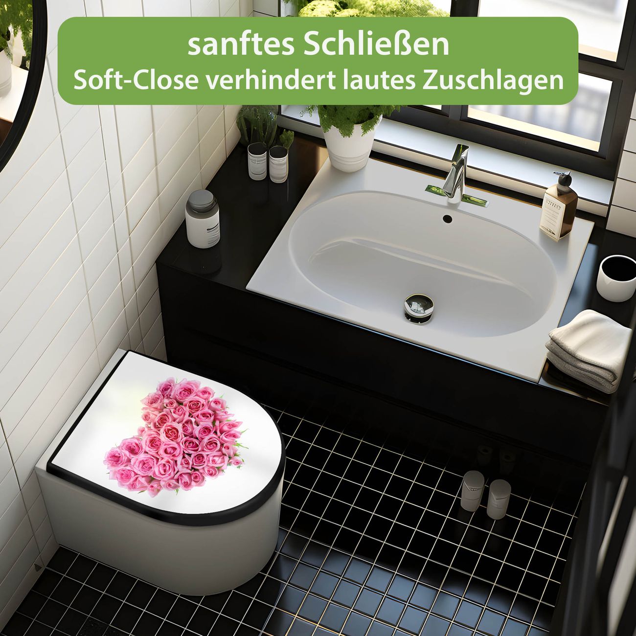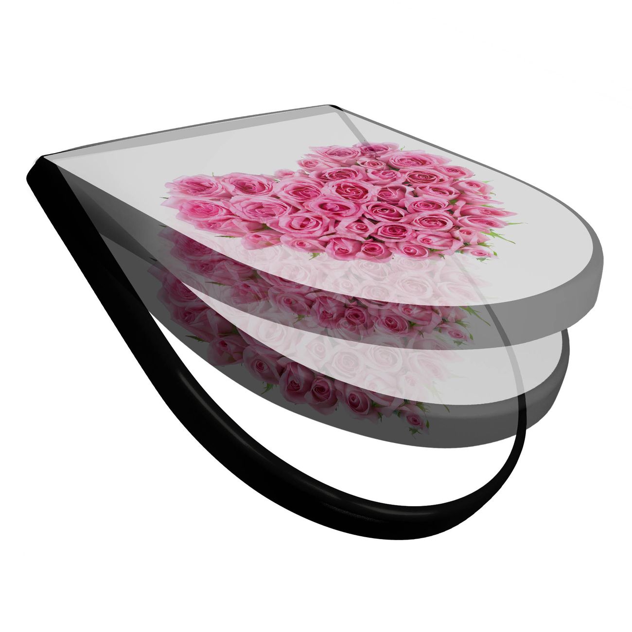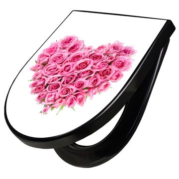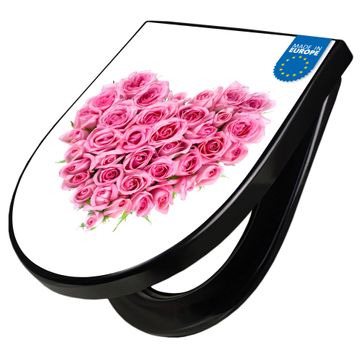 WC Sitz D-Form Schwarz mit Absenkautomatik Motiv Rosenherz