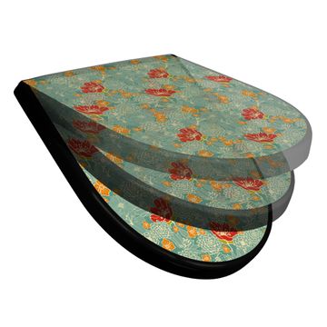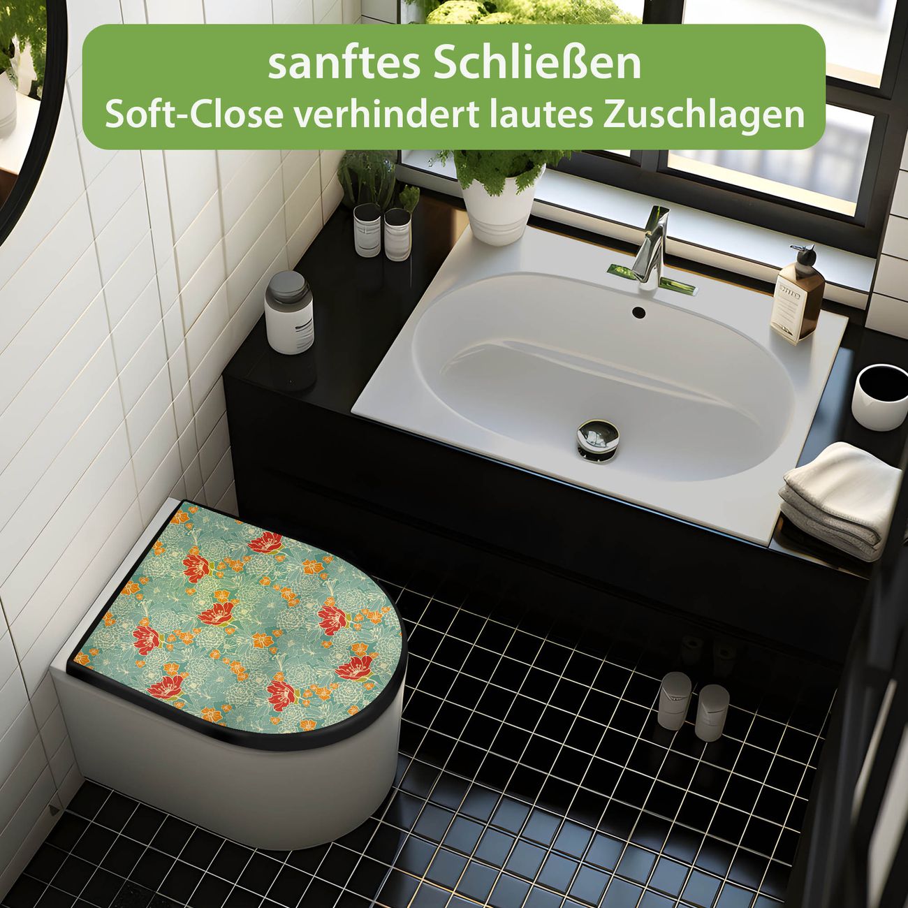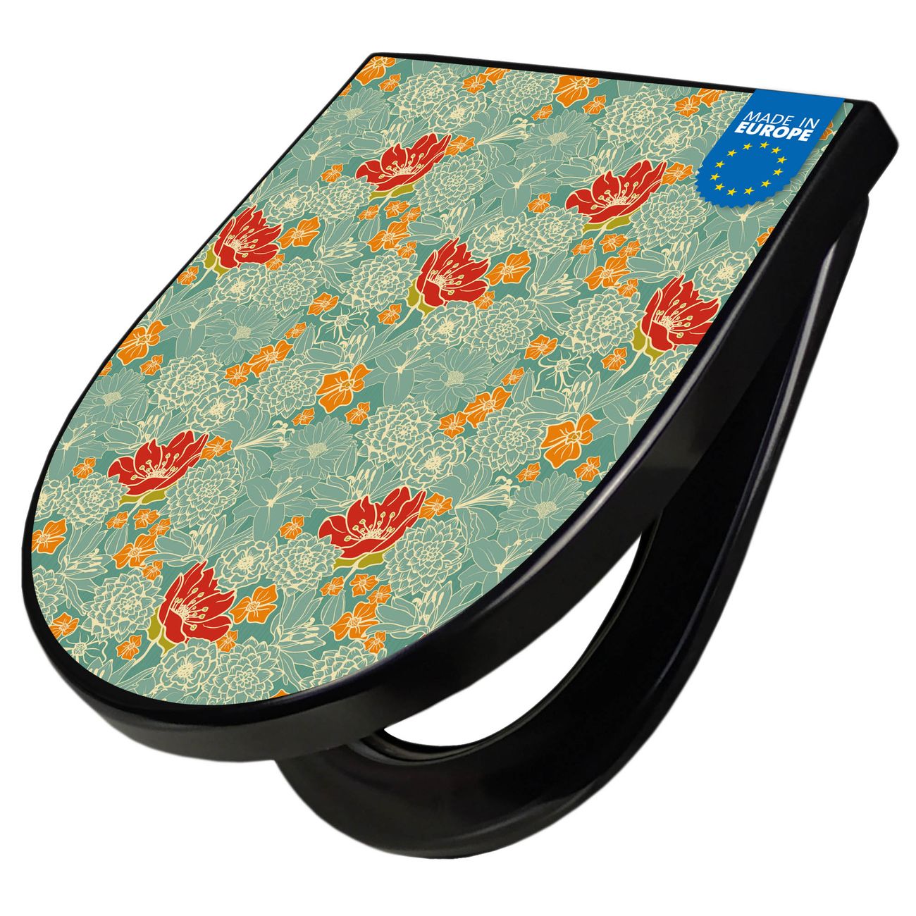 WC Sitz D-Form Schwarz mit Absenkautomatik Motiv Rote Blumen