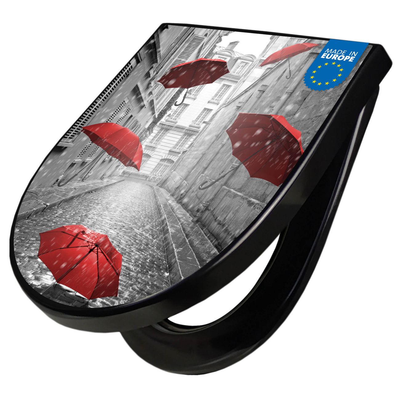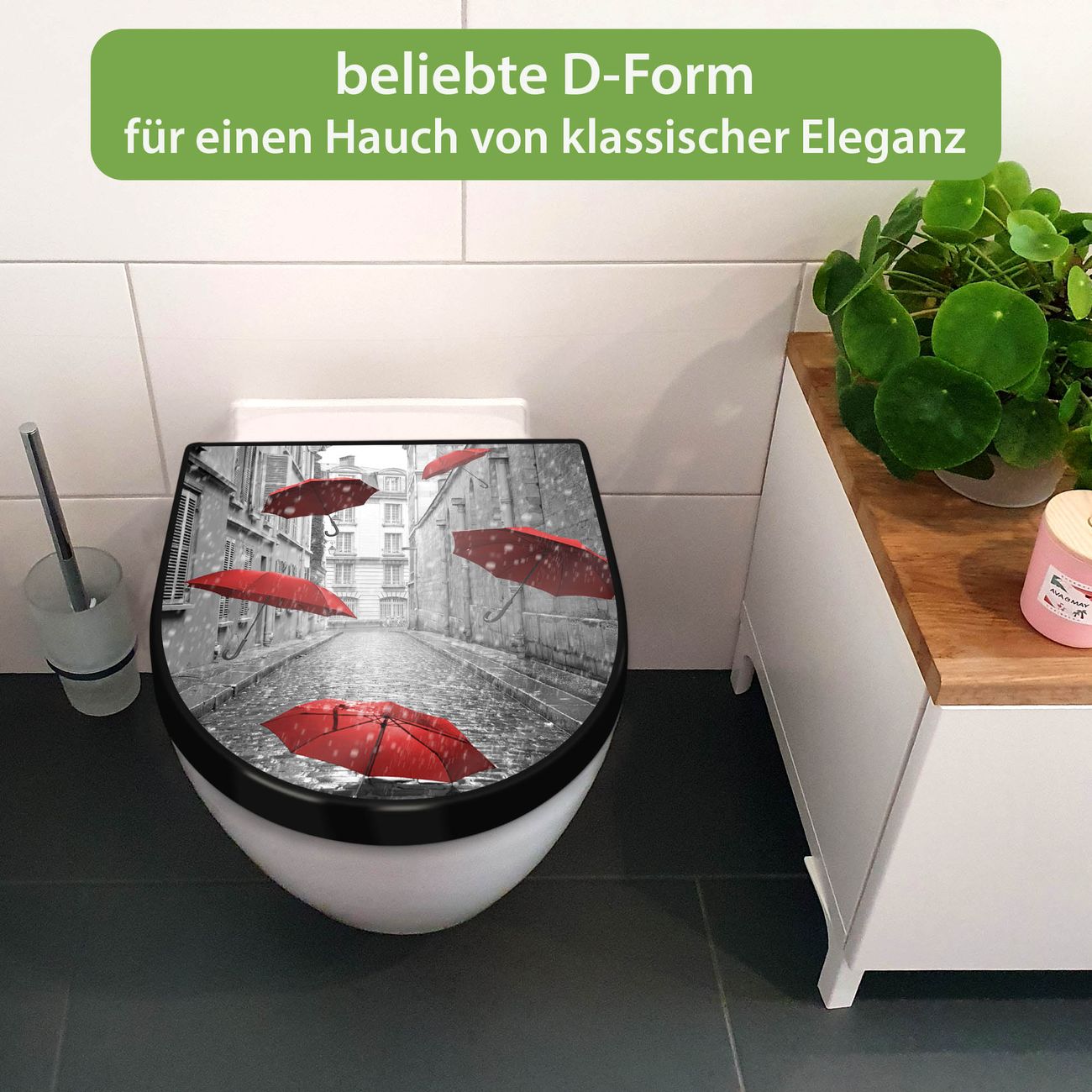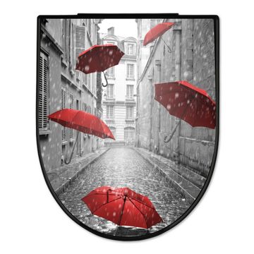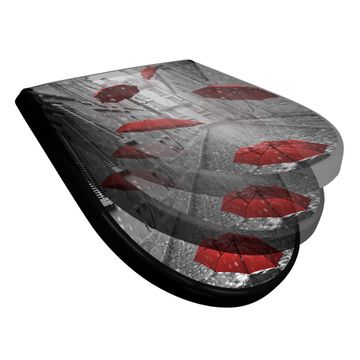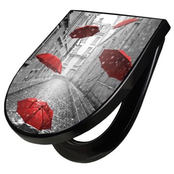 WC Sitz D-Form Schwarz mit Absenkautomatik Motiv Rote Schirme