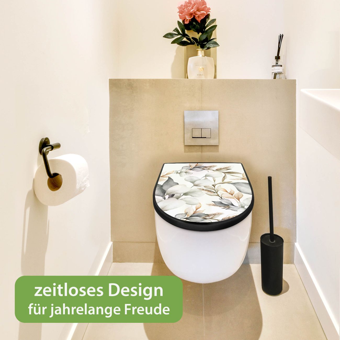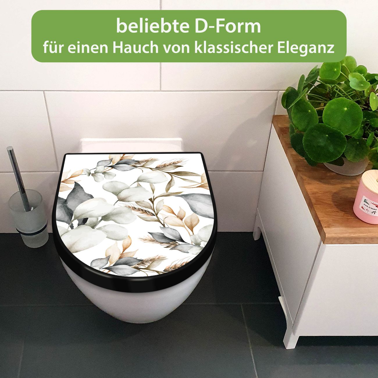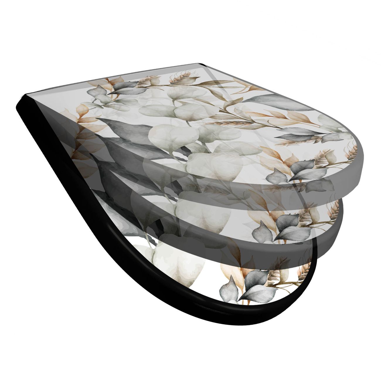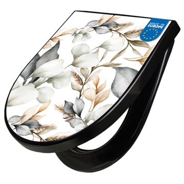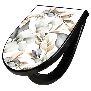 WC Sitz D-Form Schwarz mit Absenkautomatik Motiv Sanfte Blätter