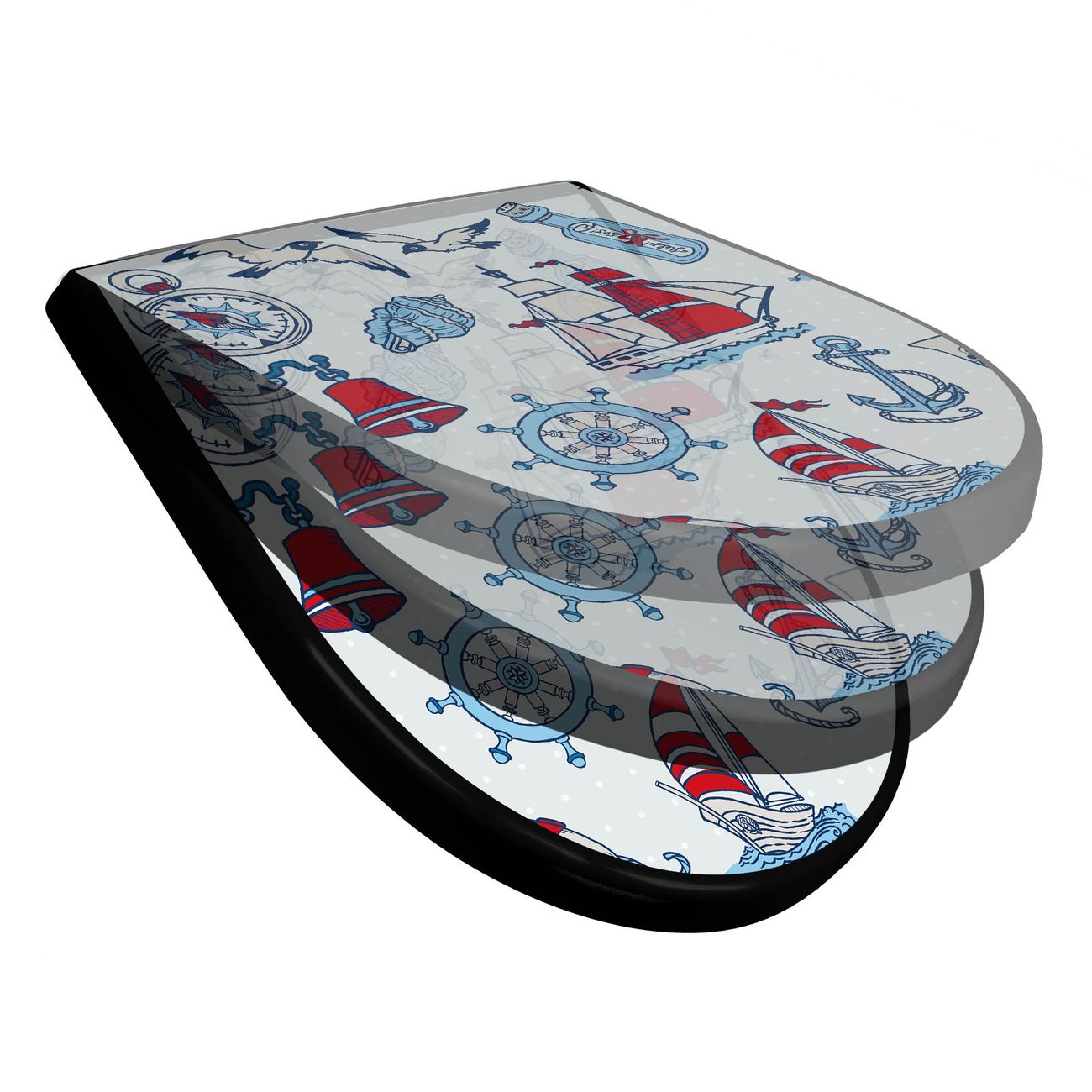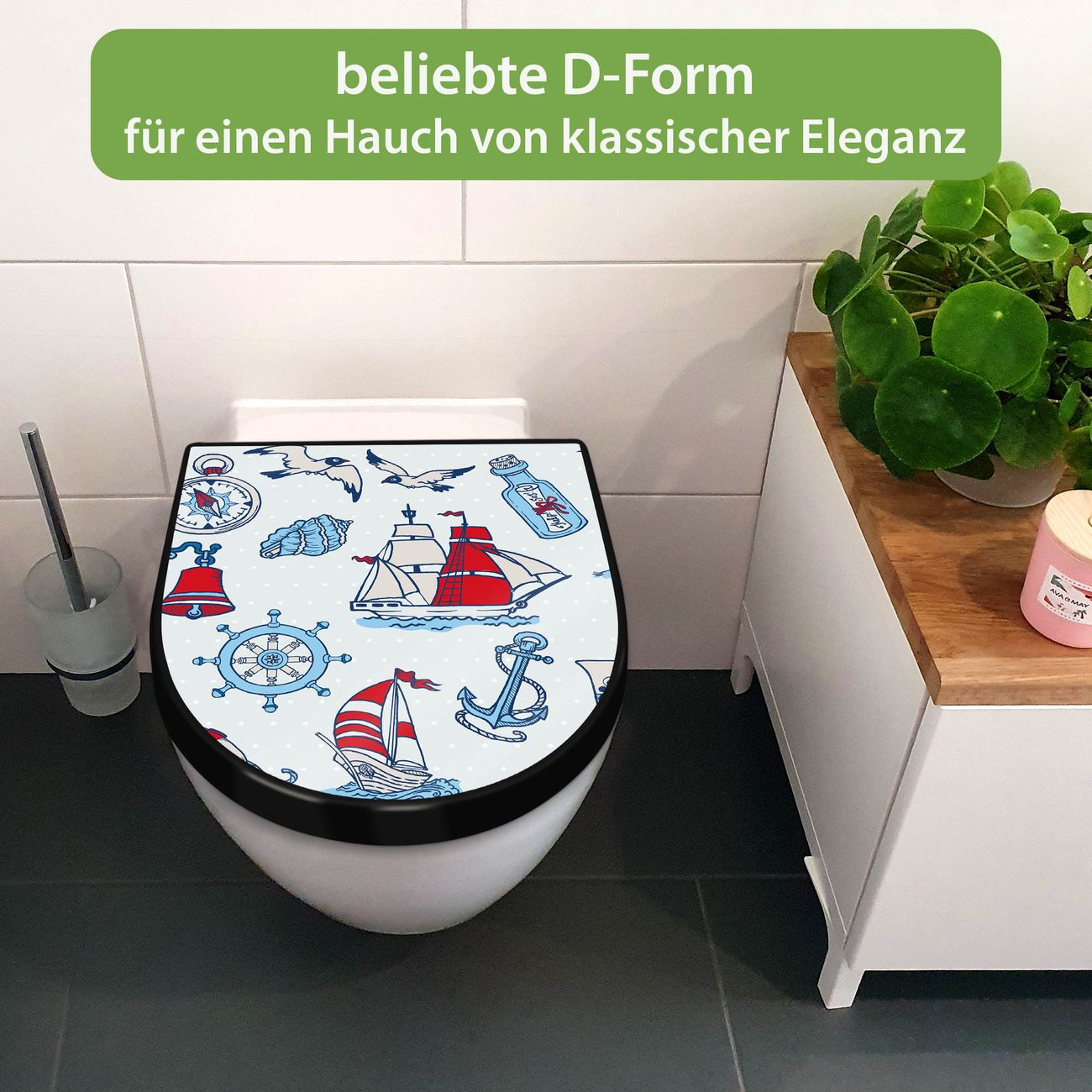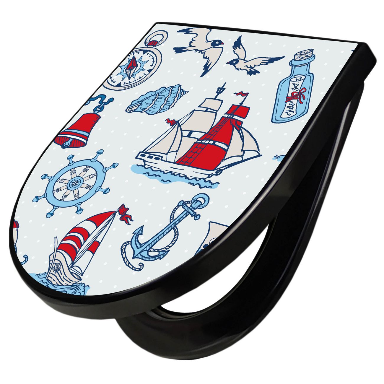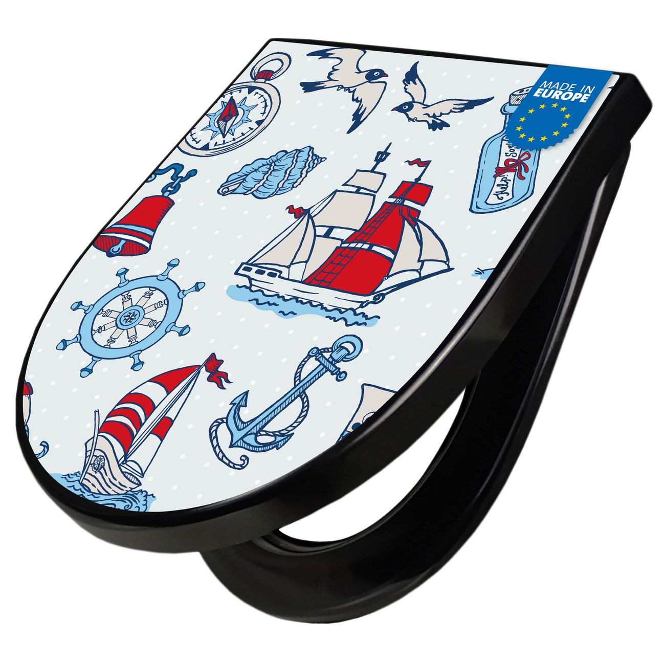 WC Sitz D-Form Schwarz mit Absenkautomatik Motiv Schiff Ahoj