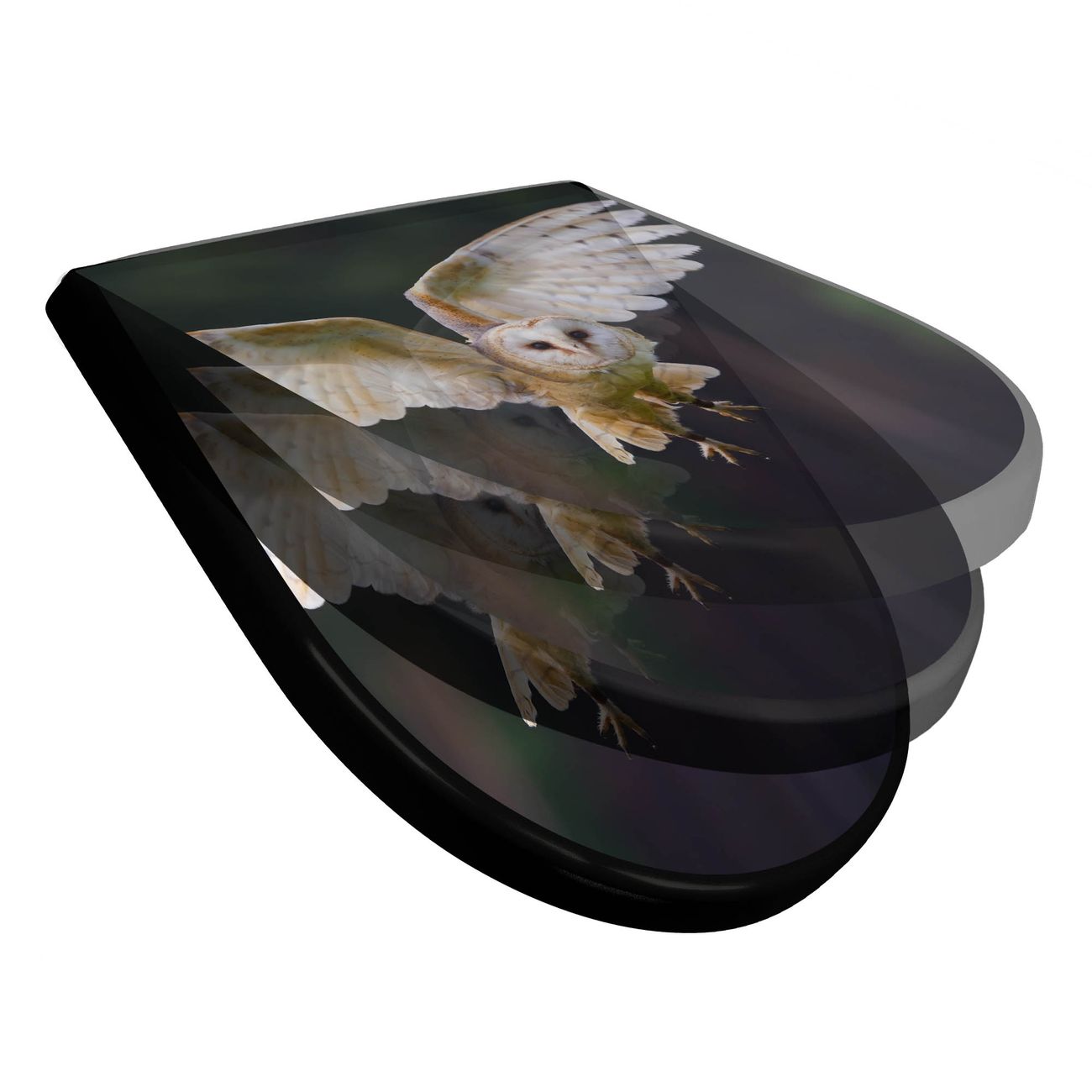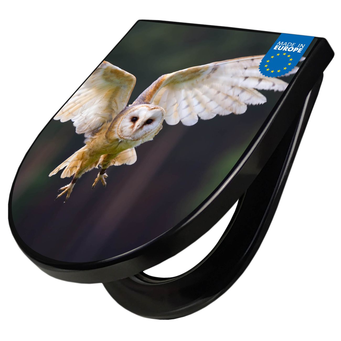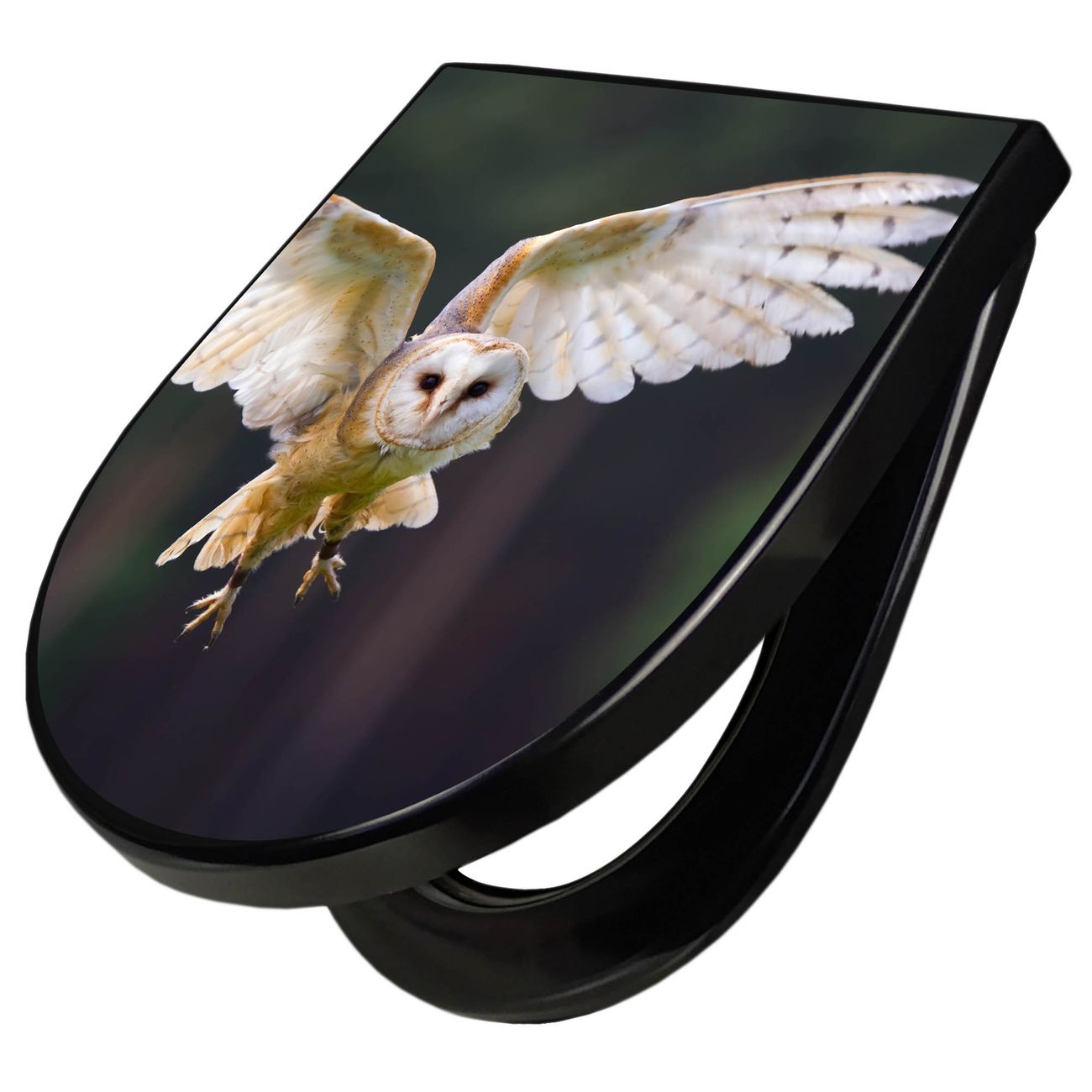 WC Sitz D-Form Schwarz mit Absenkautomatik Motiv Schleiereule