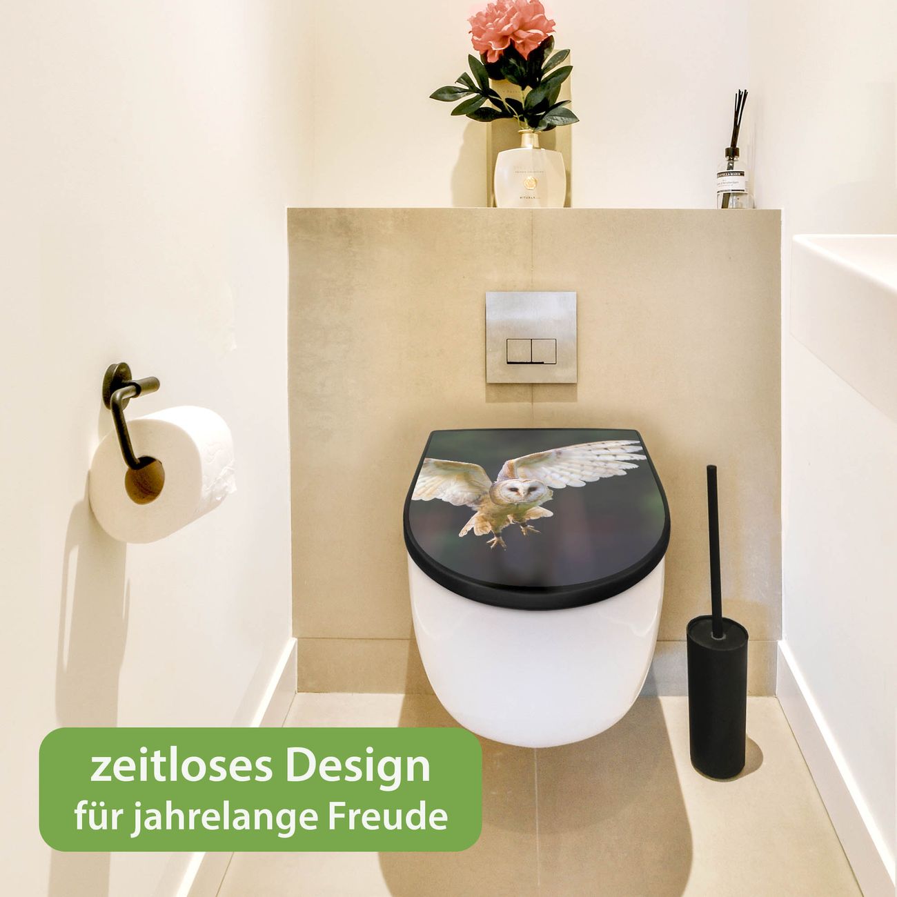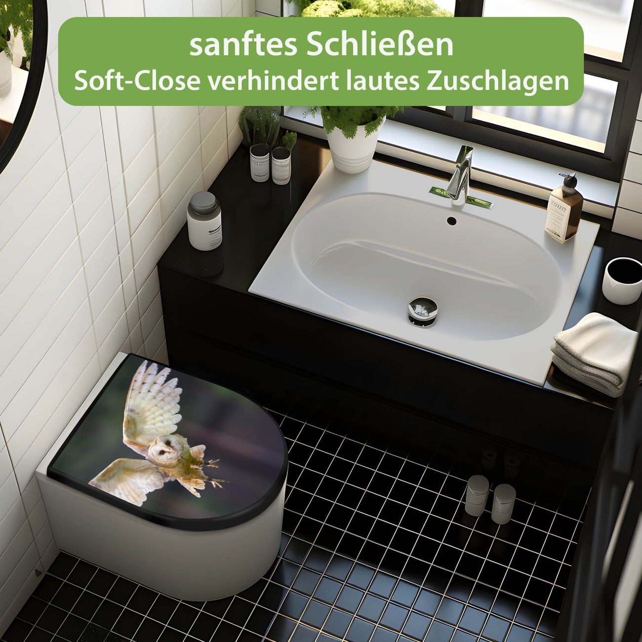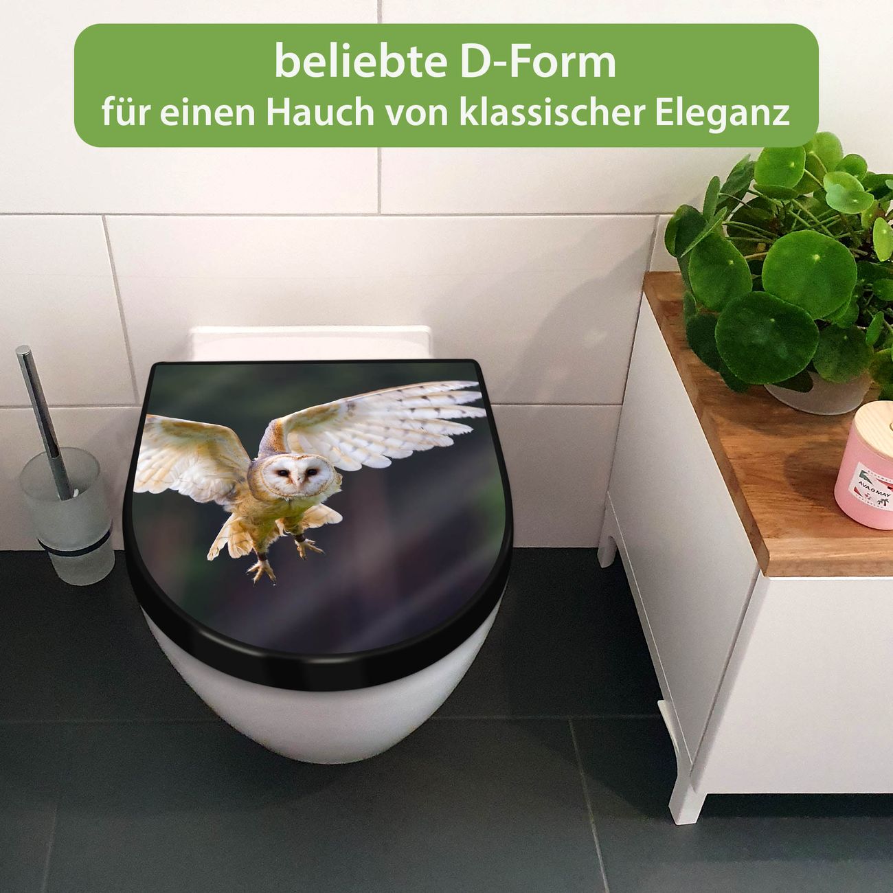 WC Sitz D-Form Schwarz mit Absenkautomatik Motiv Schleiereule