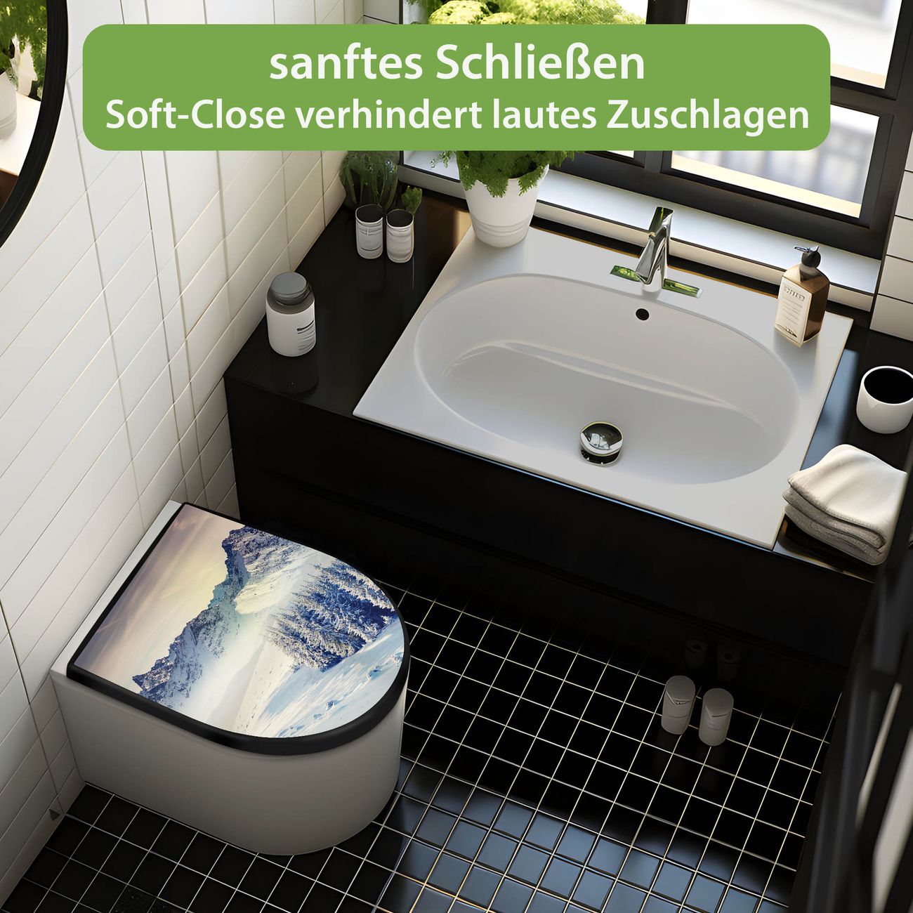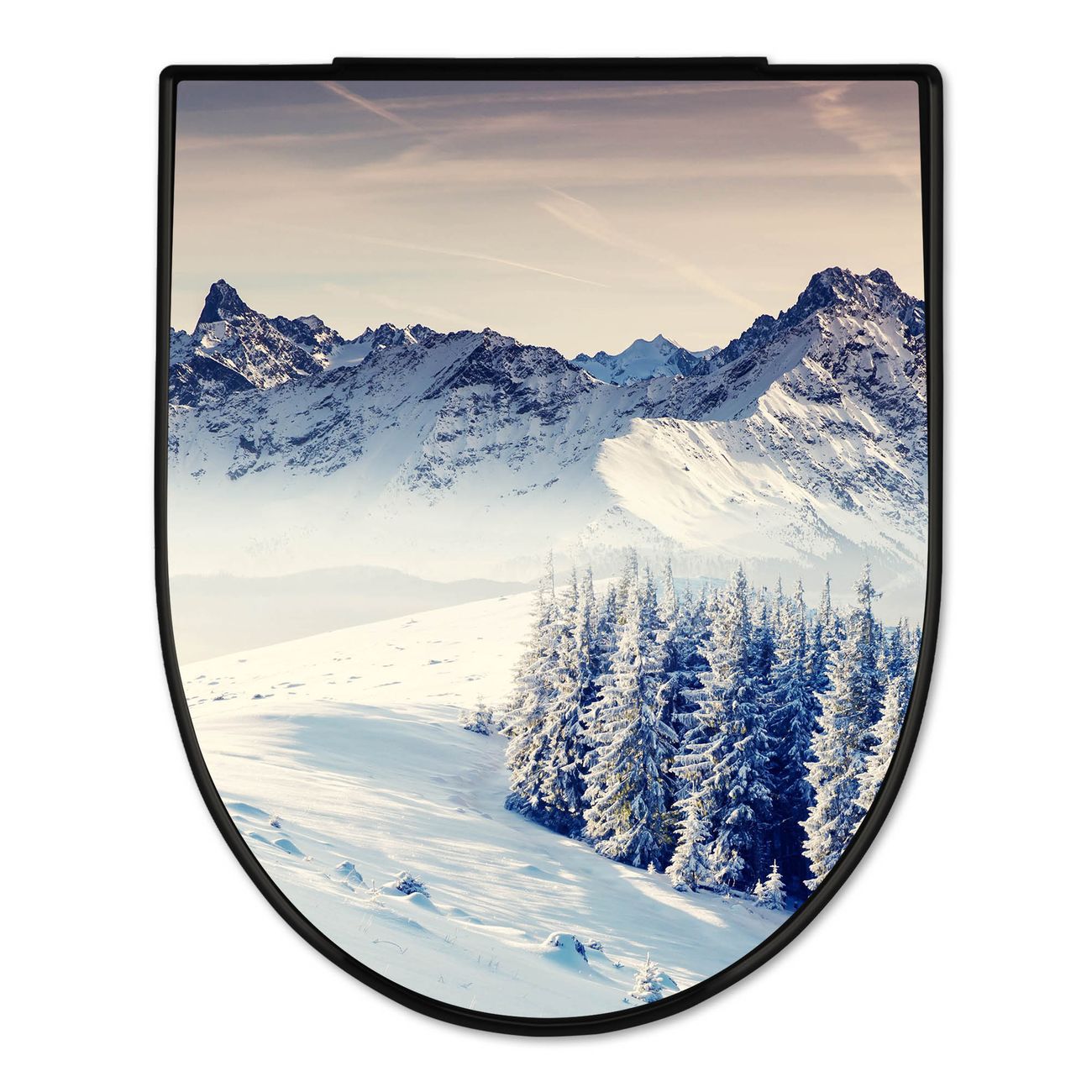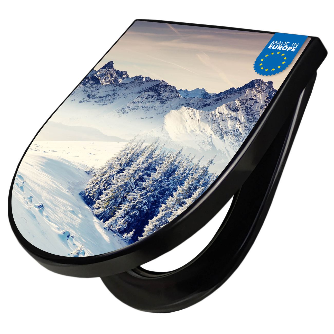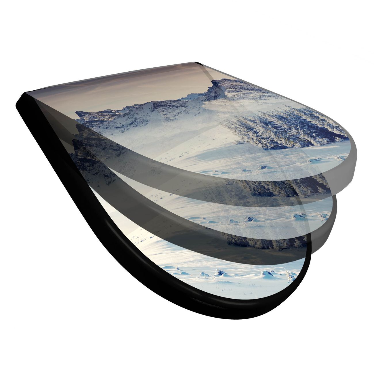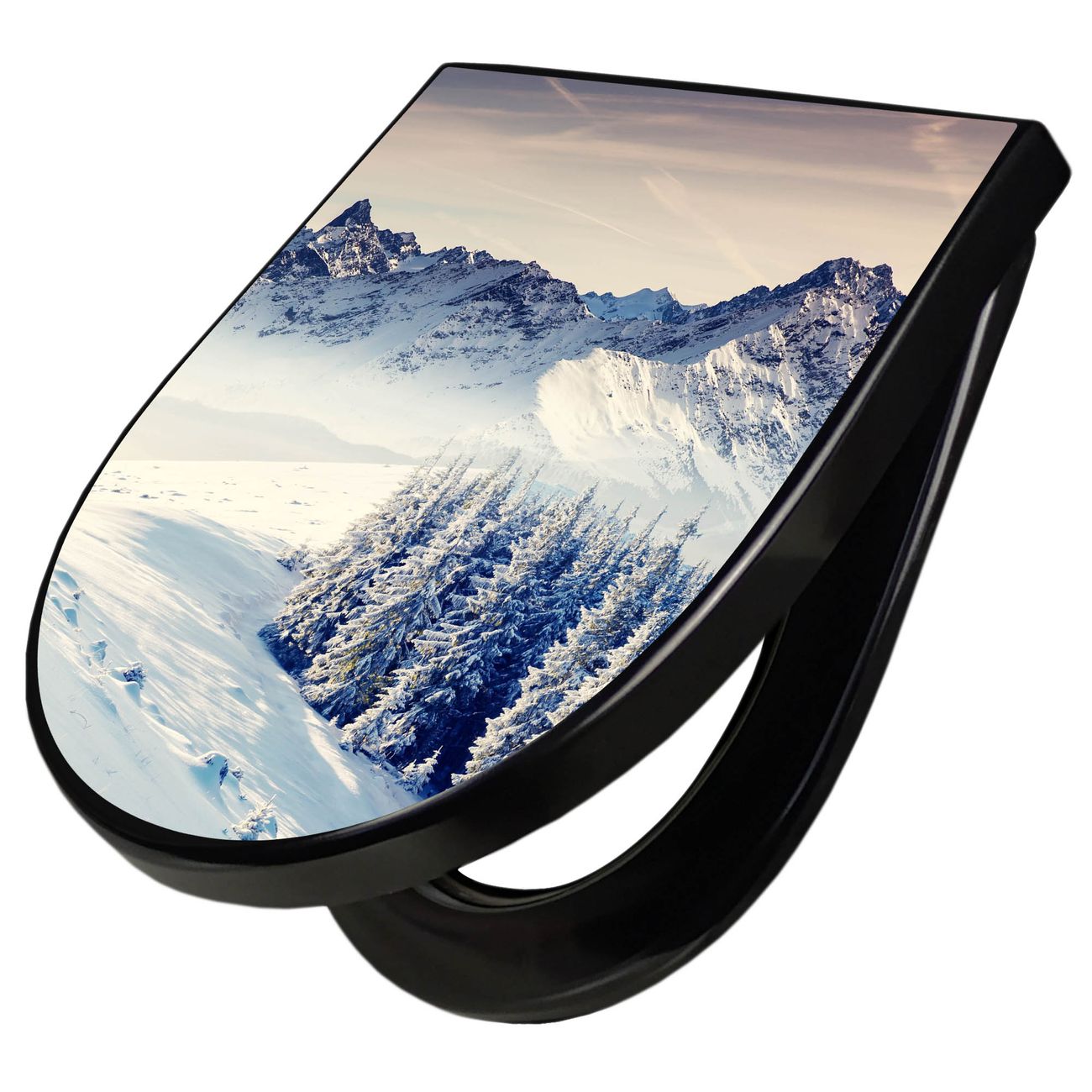 WC Sitz D-Form Schwarz mit Absenkautomatik Motiv Schneebedeckte Berge